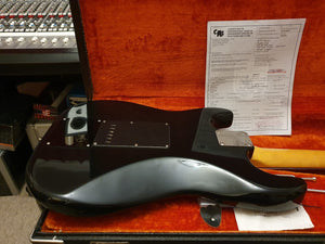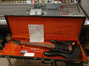 There is an on-board phaser that is turned on via a mini toggle on the lower horn. The speed is controlled by the outside knob. There is also a filter built in that puts wah-type sweeps right at your fingertips that can be turned on via the red push-button. The sweep is controls by the middle knob. The black push-button sounds like it switches over to a piezo pickup. The little holes in the pickguard are where you can insert an allen key to adjust how much you want to put the pickups in and out of phase! As the knobs have been utilized to control the effects, the mini toggles in that area are active tone controls and boosts. When they are all pointed towards the edge of the guitar it seems to be all passive and sounds like a vintage Strat should. The inside knob is a master volume. We had a long talk with the original owner who brought the guitar to the custom shop...he remembers it like yesterday, and there is an incredible story that comes with the guitar....we'll pass on all the details to the new owner.