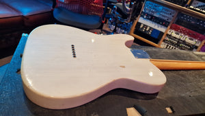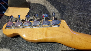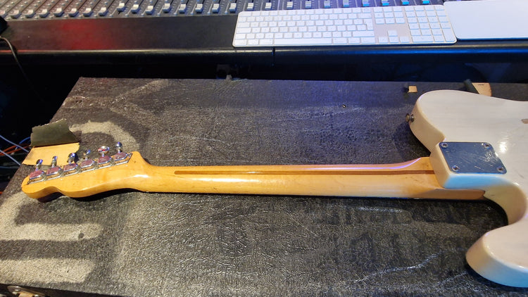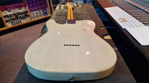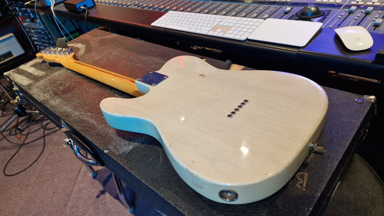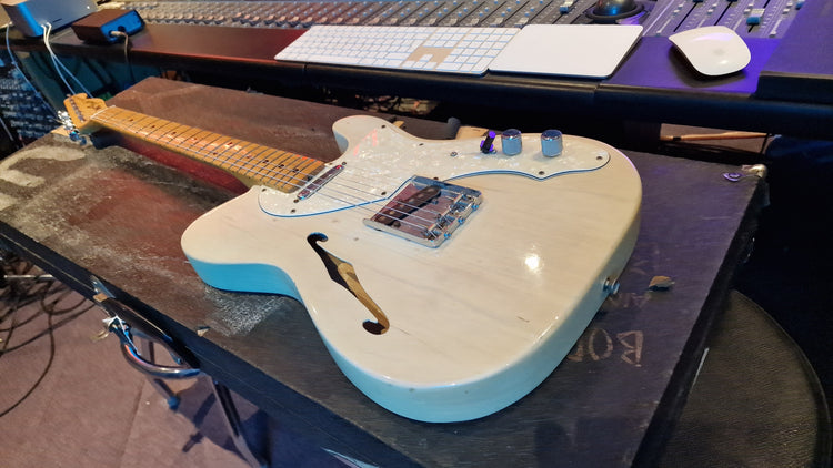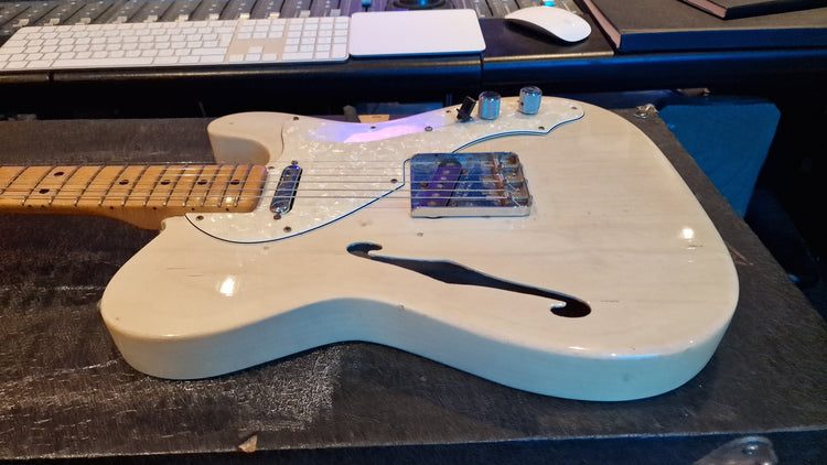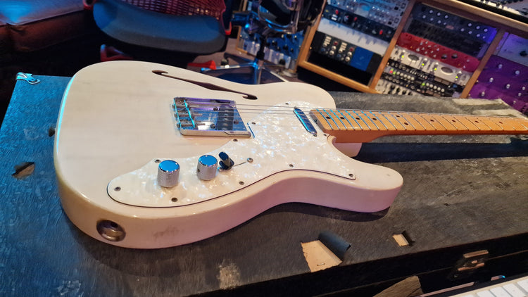 1969 Fender Telecaster Thinline refinished in a rustic see-through Blonde with pearl pickguard. This was the first year of the famed thinline, which is an exceptionally lightweight and balanced instrument. This guitar was designed and also likely built by the legendary German luthier, Roger Rossmeisl, who was put in charge of Fender's Custom Shop for building new hollow body designs. Rossmeisl had previously worked at Gibson and Rickenbacker, where he designed the 4000 and 4001 bass as well as the entire 300 series line of guitars! This guitar is in player's grade condition with the normal refinish and parts upgrades/modifications expected to see over the decades. Our studio has priced it as the least expensive thinline in the world to allow more players an opportunity to enter the vintage guitar market for the price of little more than what a mass produced team-built Custom Shop model sells for these days. The case has some interesting artwork from its history as a British player's guitar.
