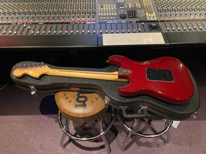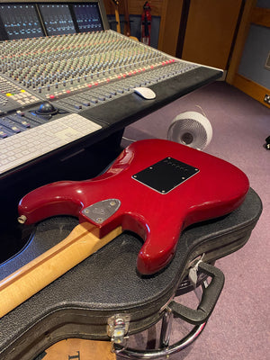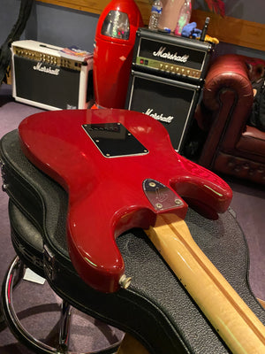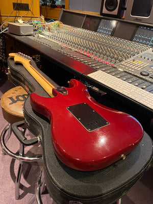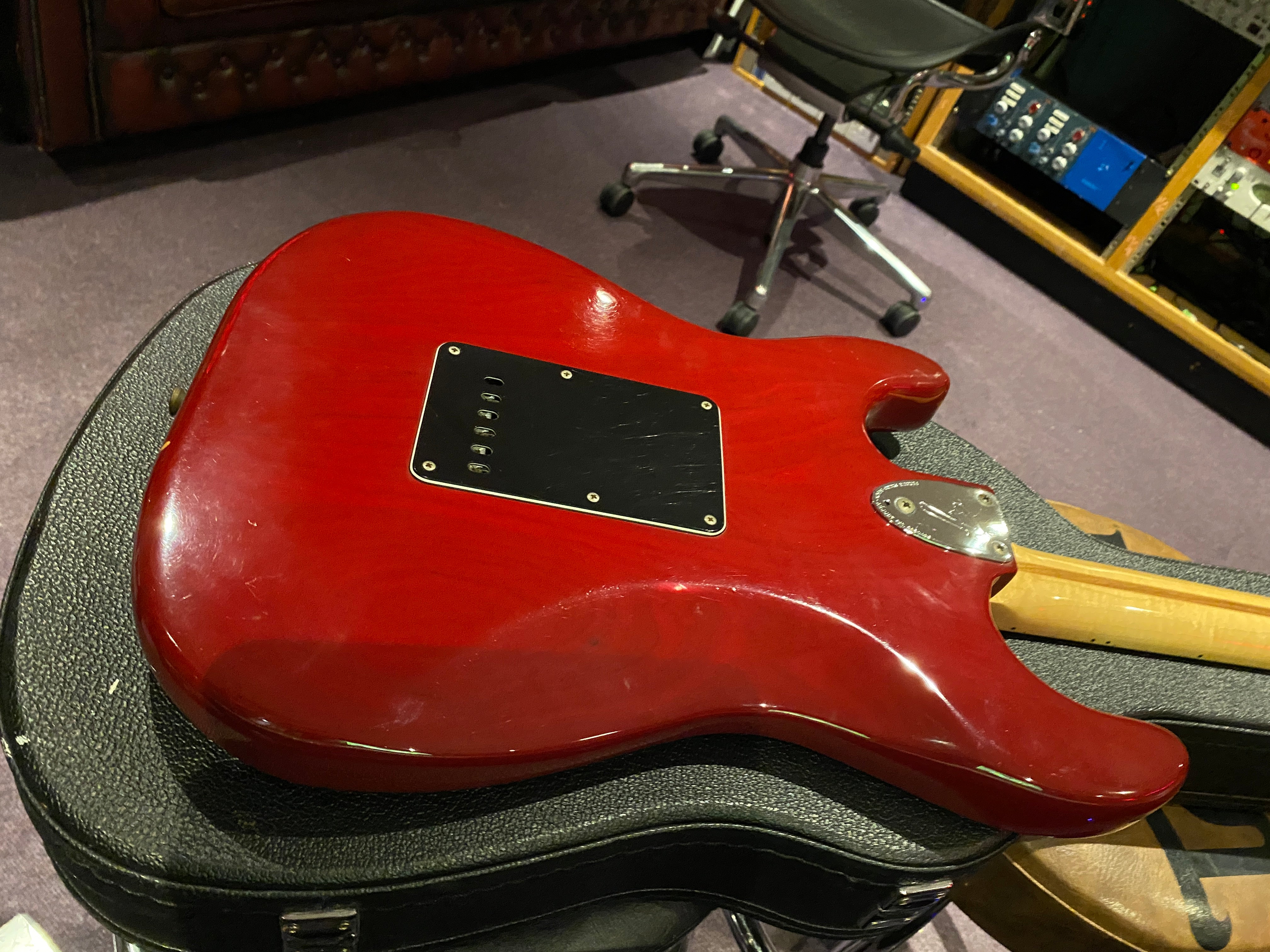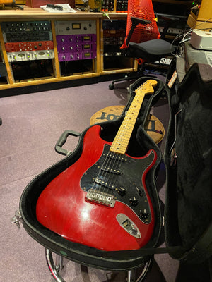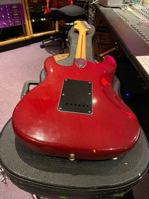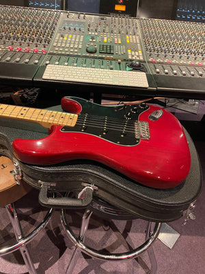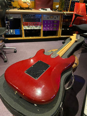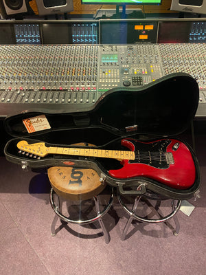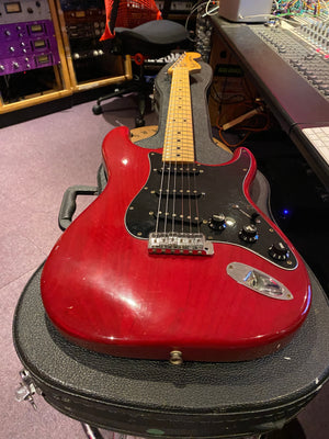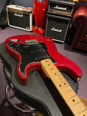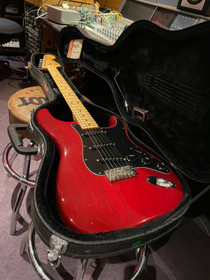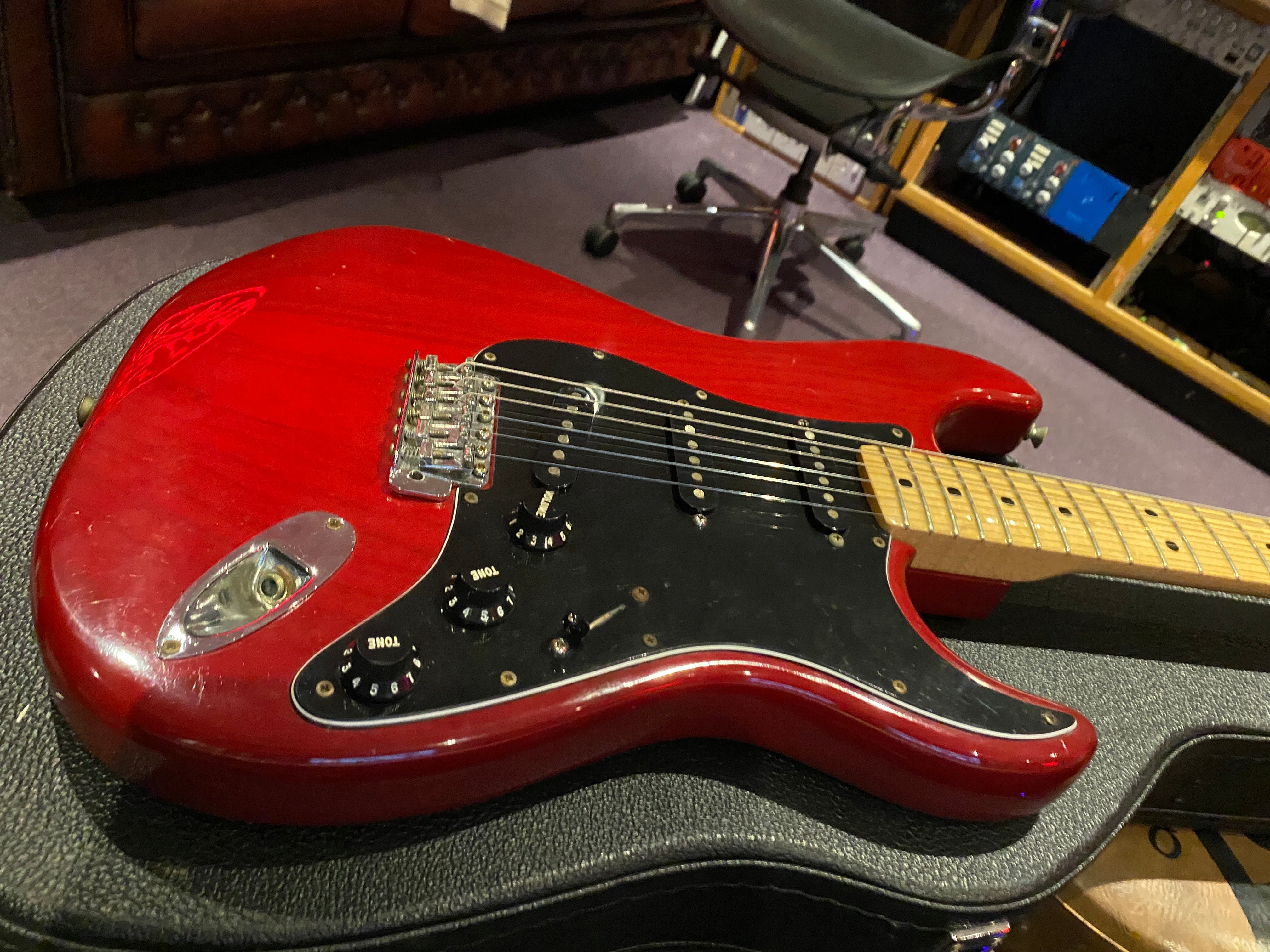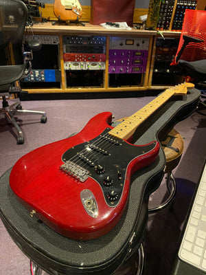 1979 Fender Fender Stratocaster finished in a stunning see-through red with beautiful wood grain exposed through the finish. The neck is lightly flamed, which can look wonderfully intense at the right angle. The original owners manual hang-tag with numbers-matching serial number sticker is still present 45 years later! This is one of the cleanest examples from the 70's we have ever seen come through our studio. Its "ash tray" tremolo cover and tremolo bar are present in the case. The headstock is super clean and hasn't faded or yellowed like you see on other examples. This guitar was clearly loved and stored carefully throughout its life. The classic oversized 70s headstock and 70s red contrasting against the black plastics all really make this guitar stand out. It's the perfect guitar for distinguishing yourself sonically in the studio and visually on stage.