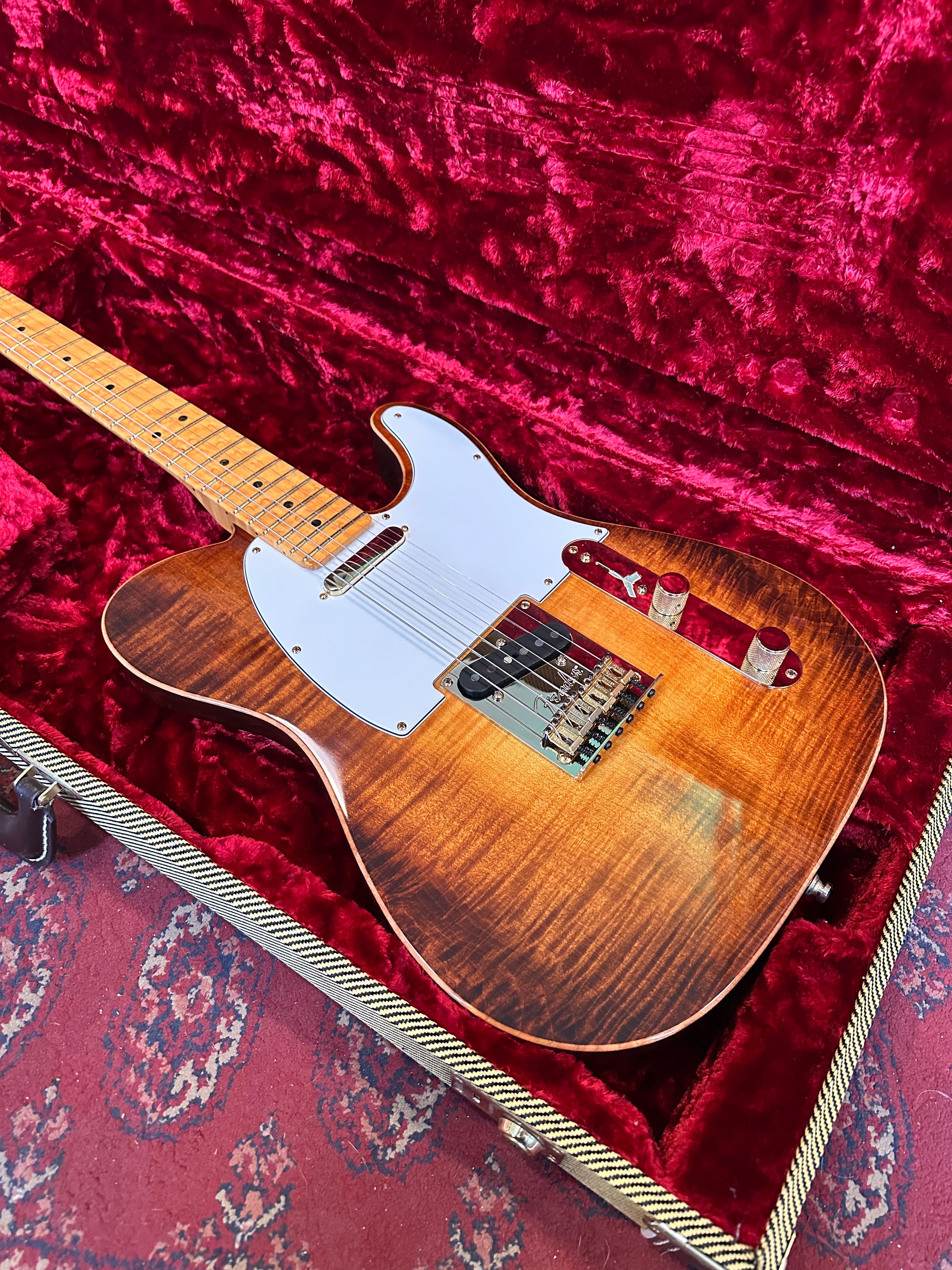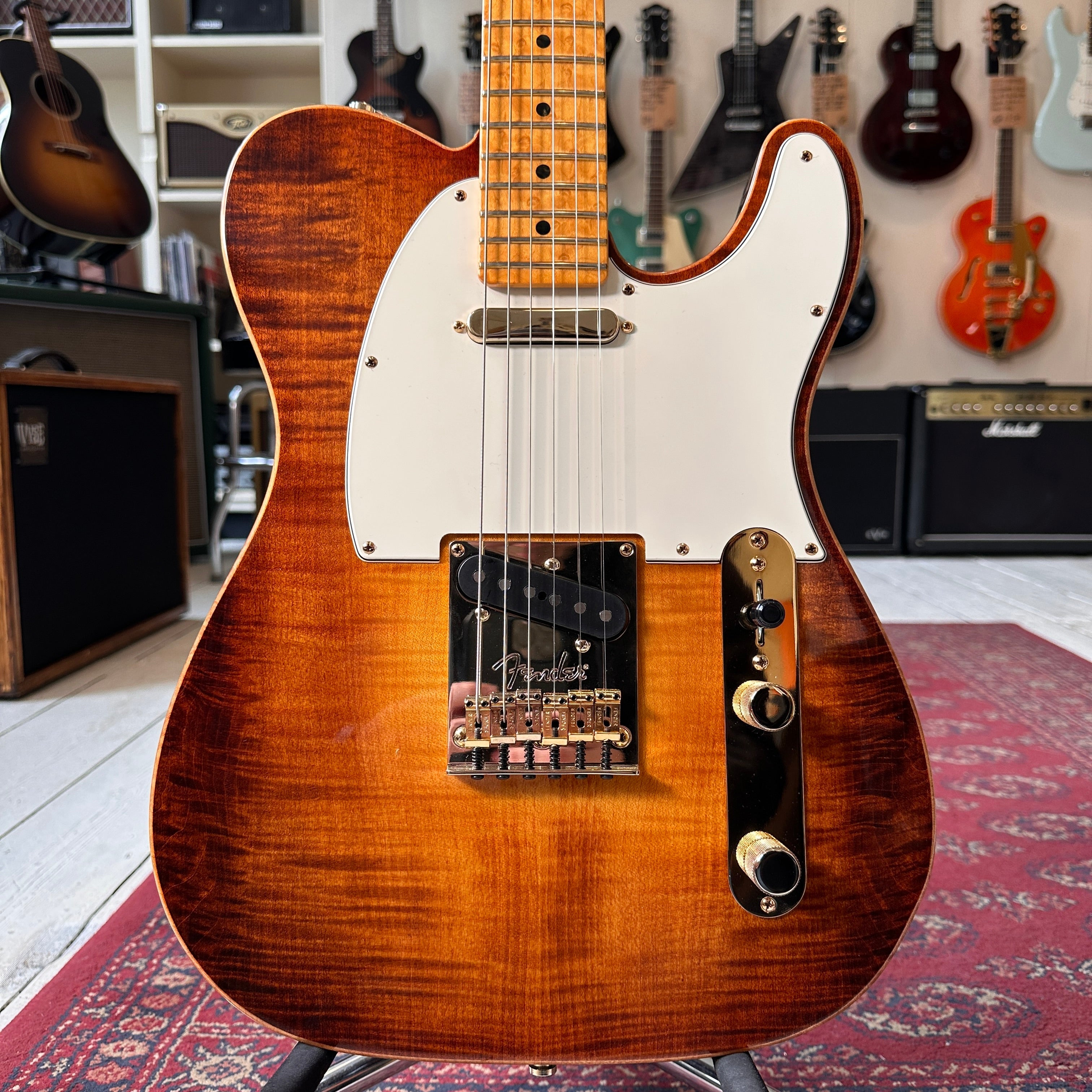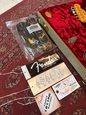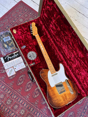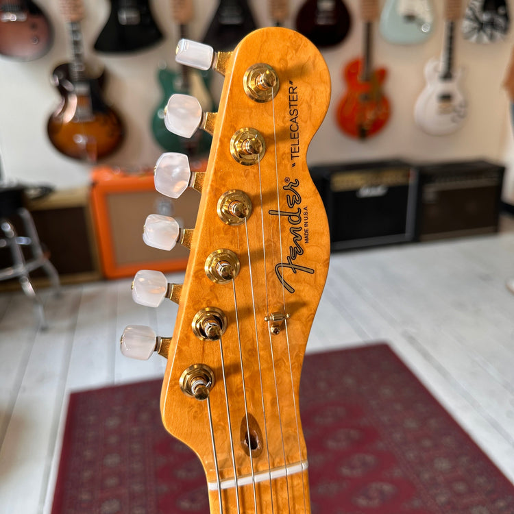 The guitar features a premium Birdseye maple neck and fingerboard, chambered ash body and flamed maple top. The guitar is supremely light coming in at only 6lb 10oz and features a full set of gold hardware including the Fender sealed machine heads with Pearloid tips.
