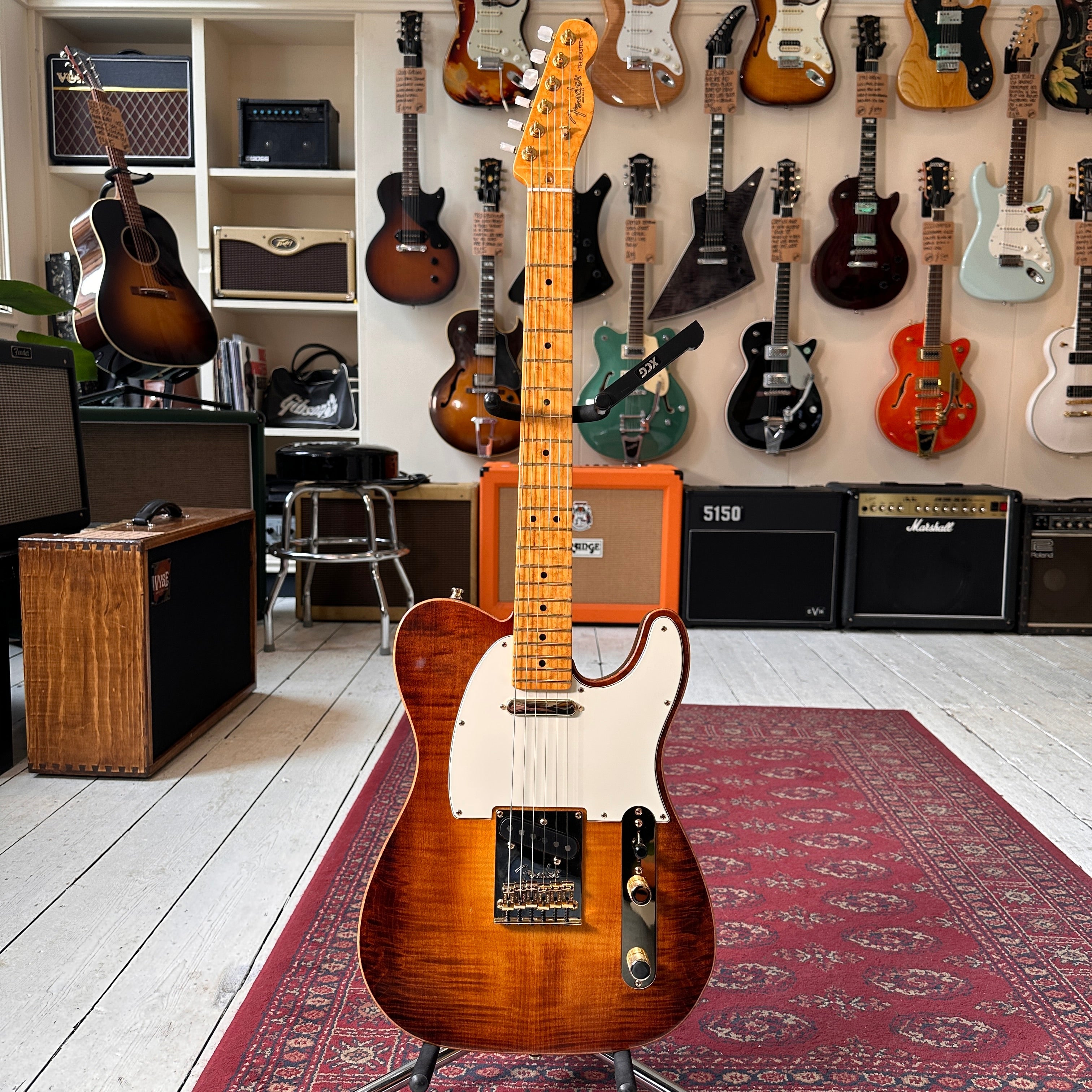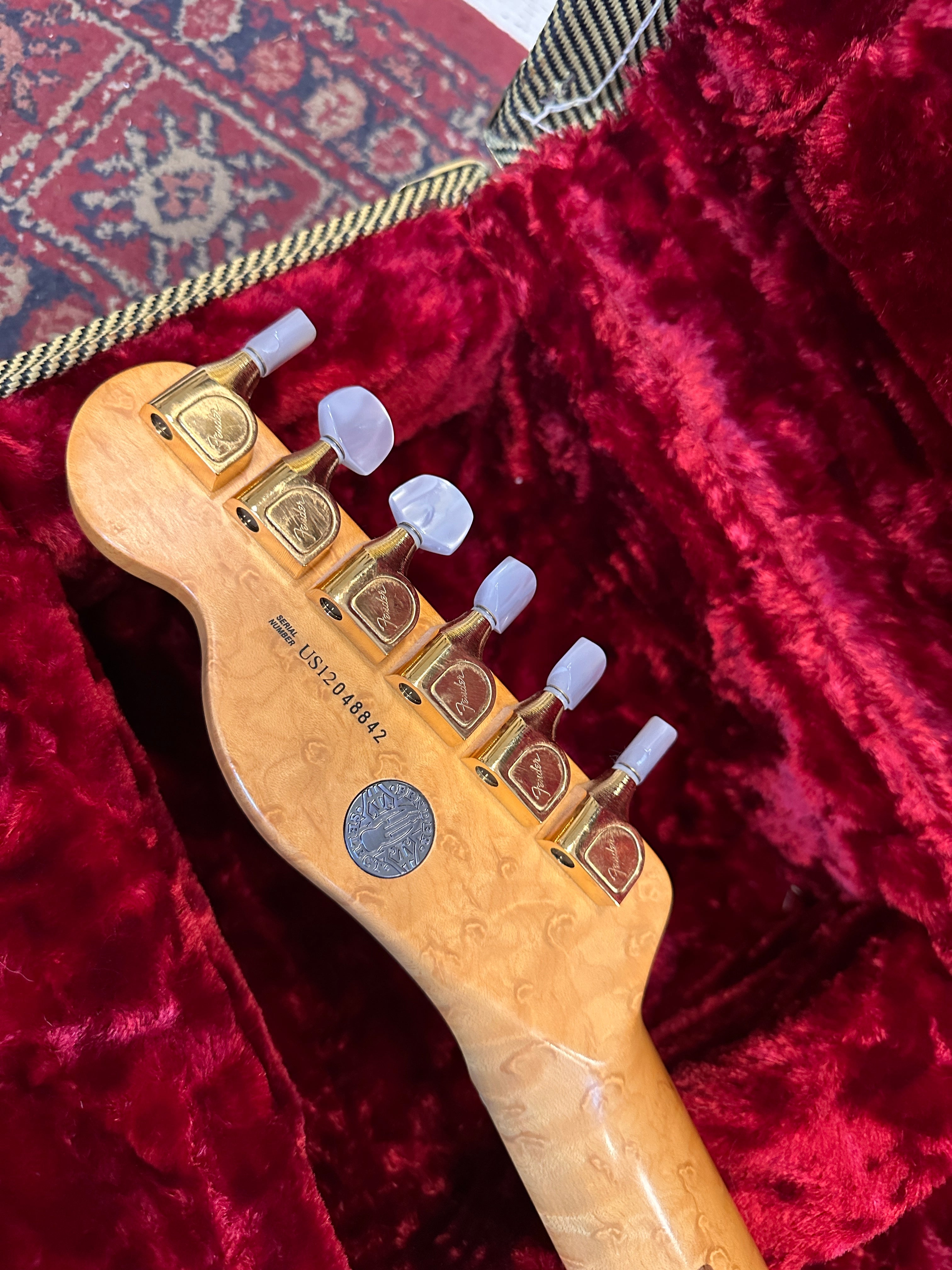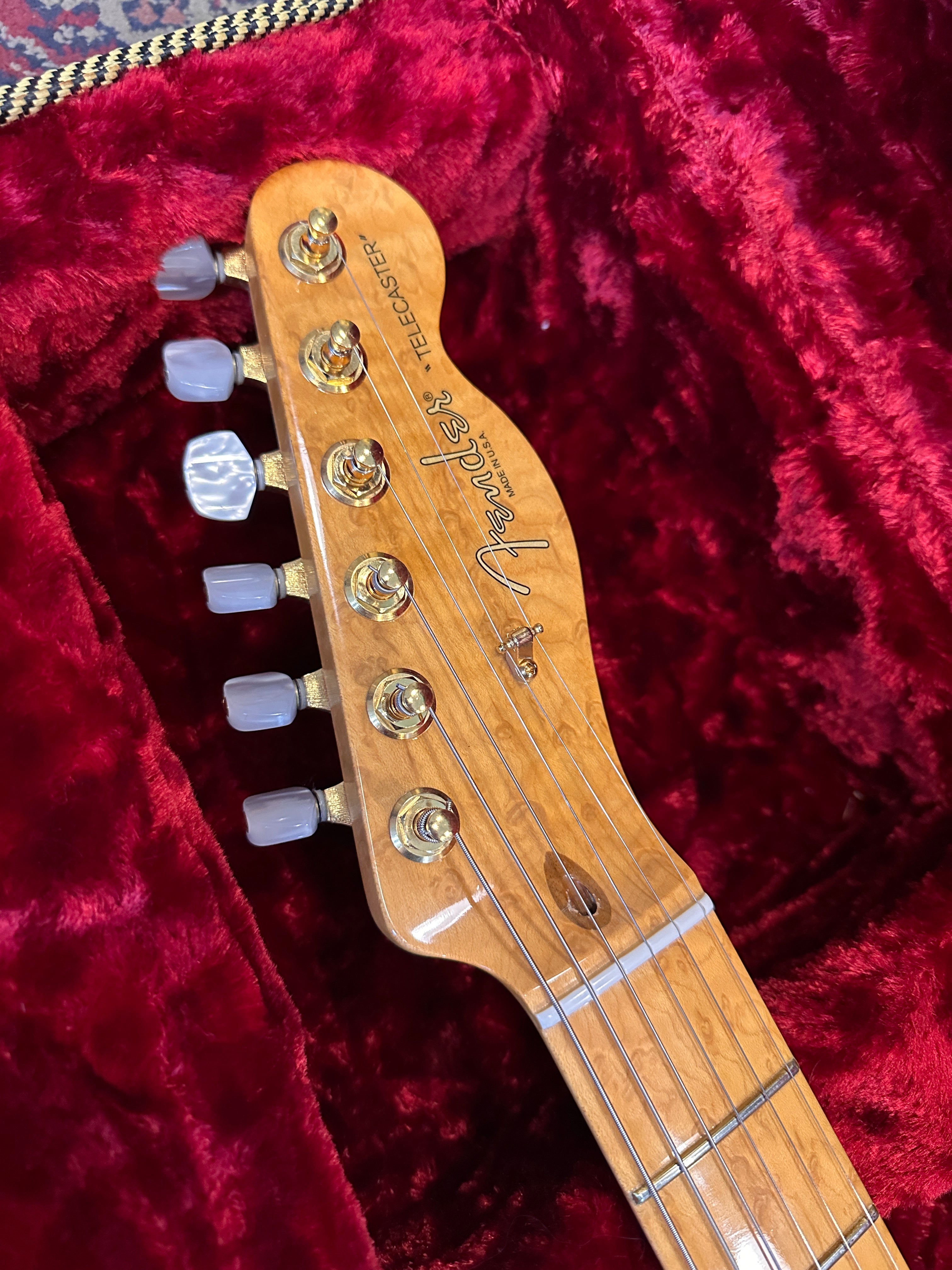 The guitar features a premium Birdseye maple neck and fingerboard, chambered ash body and flamed maple top. The guitar is supremely light coming in at only 6lb 10oz and features a full set of gold hardware including the Fender sealed machine heads with Pearloid tips.