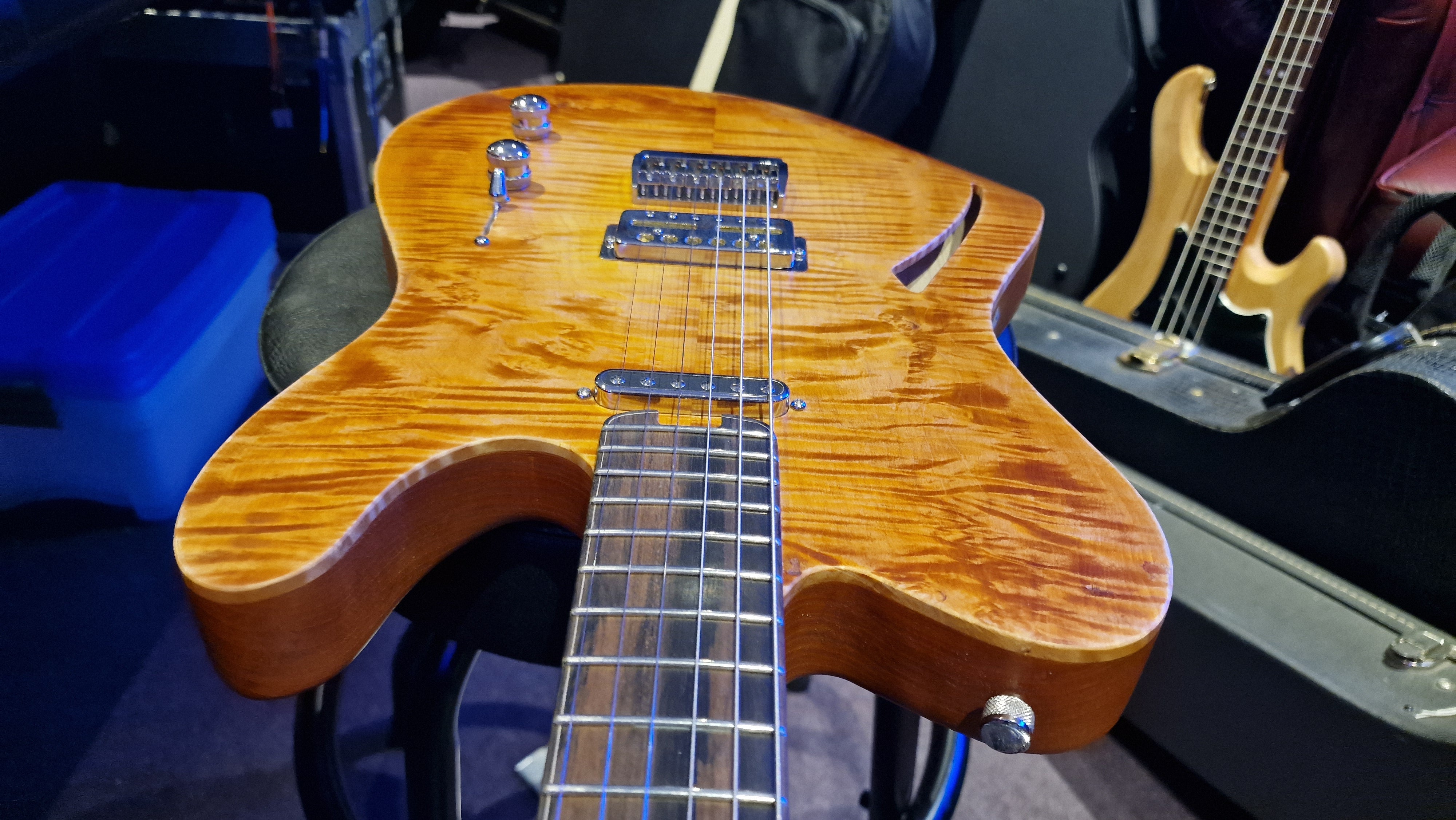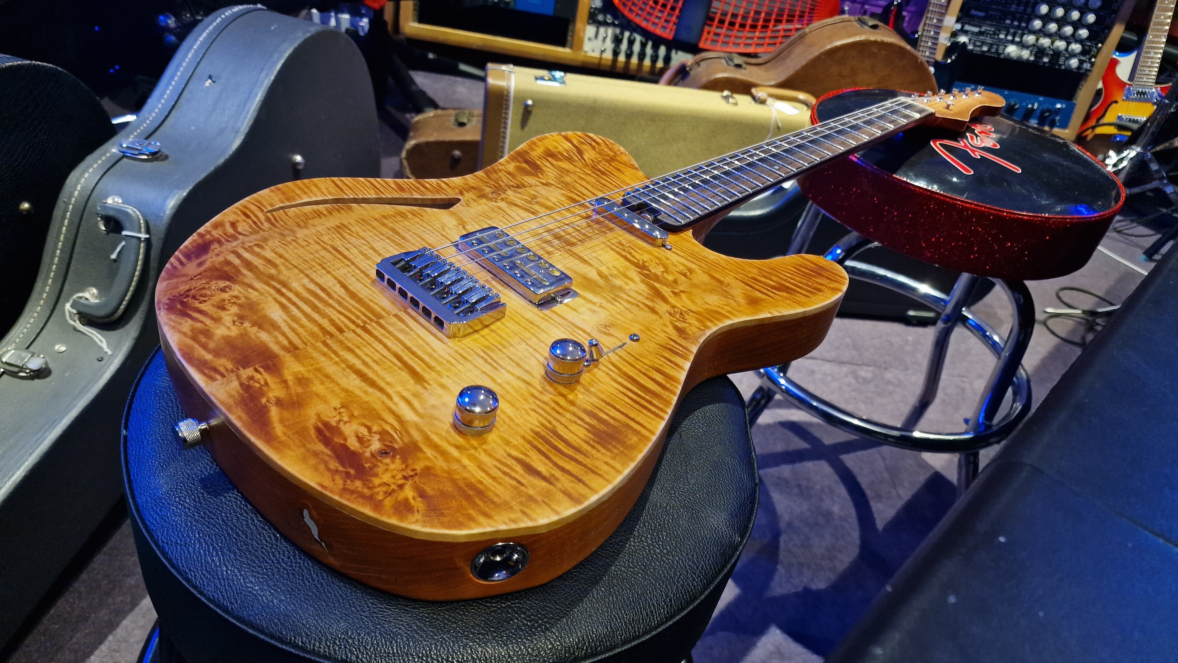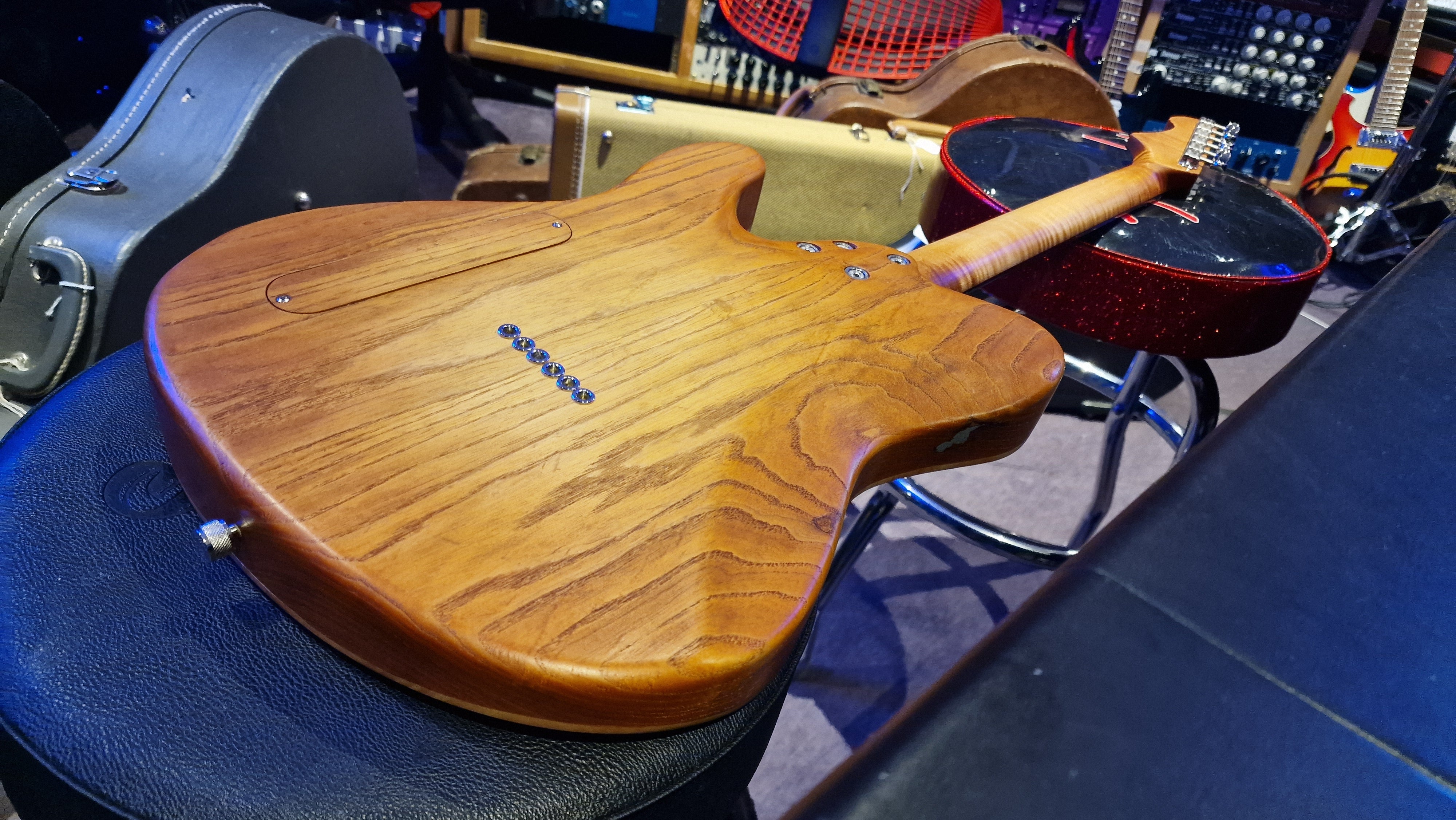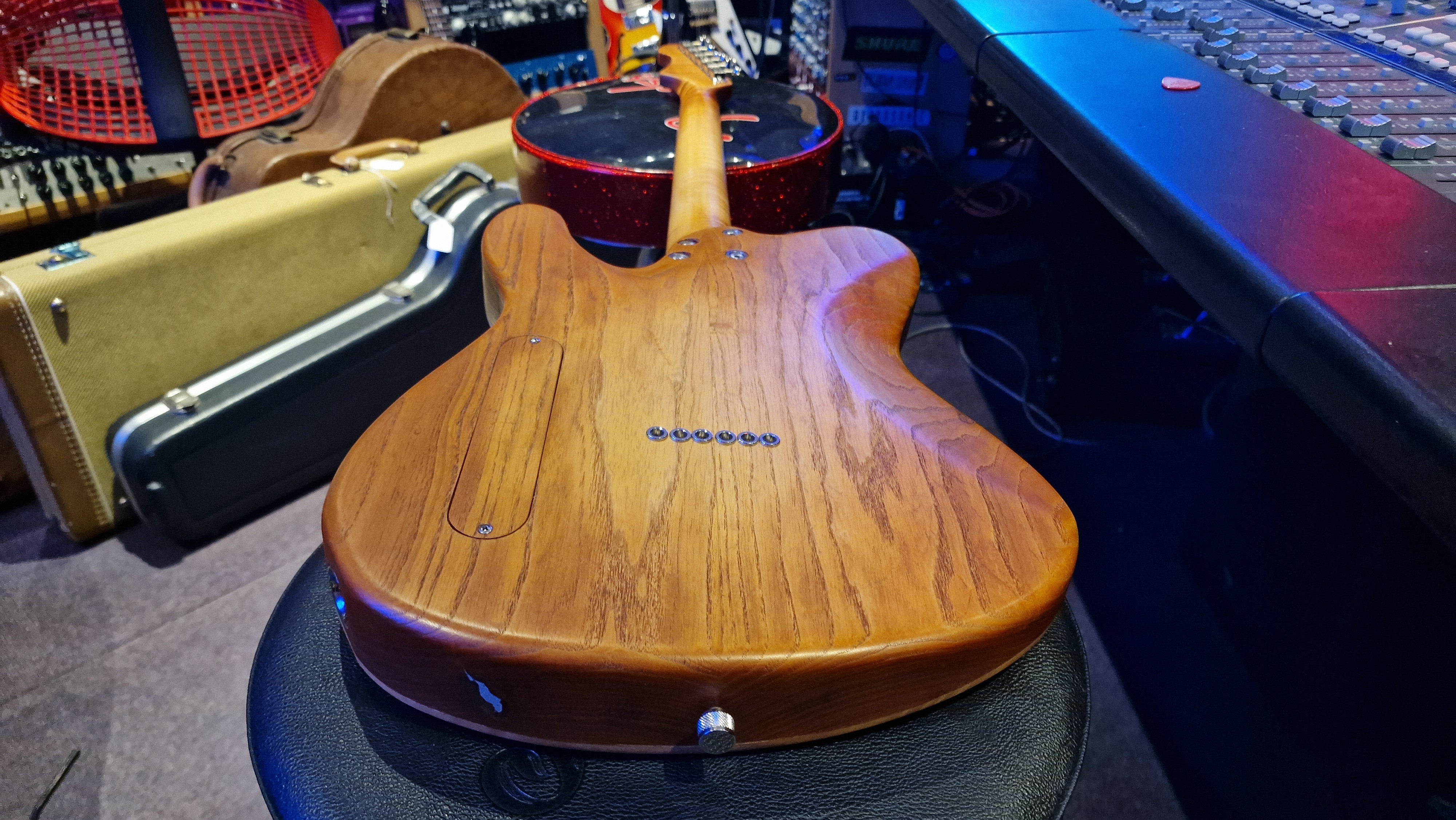 The body is semi-hollow ash with flame maple top and neck. There was a wormhole found in the ash that was filled with aluminium for a killer effect. 25.5 scale, bound ebony fretboard. CTS Pots and Grainger hardtail string-thru bridge made in the UK.