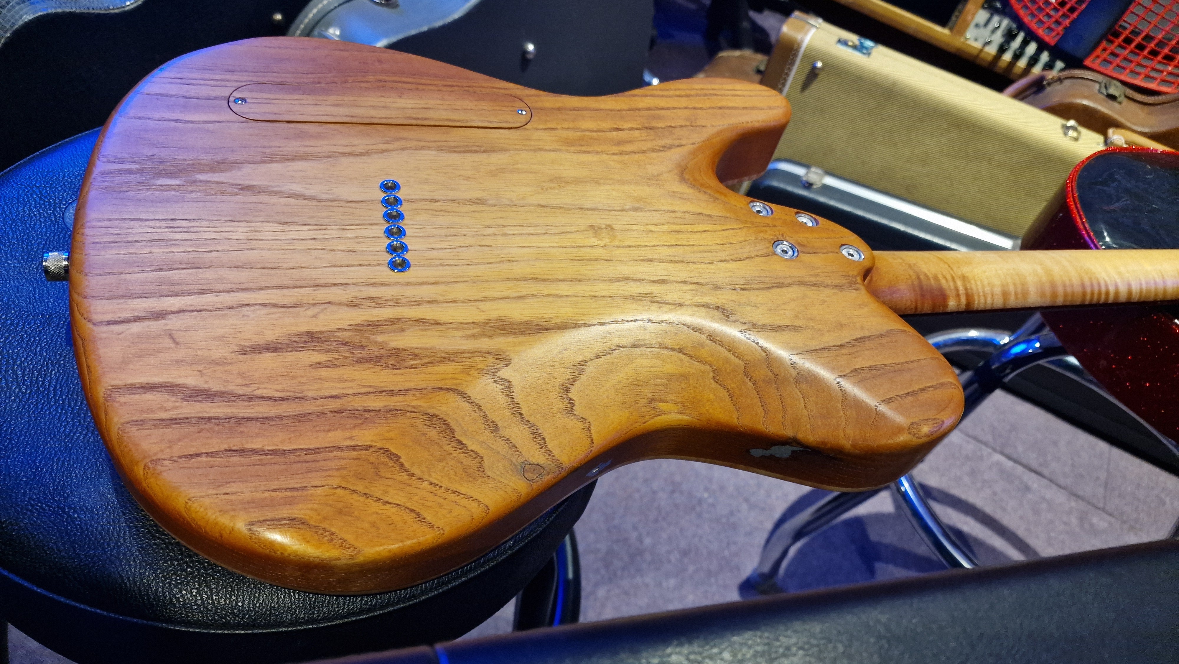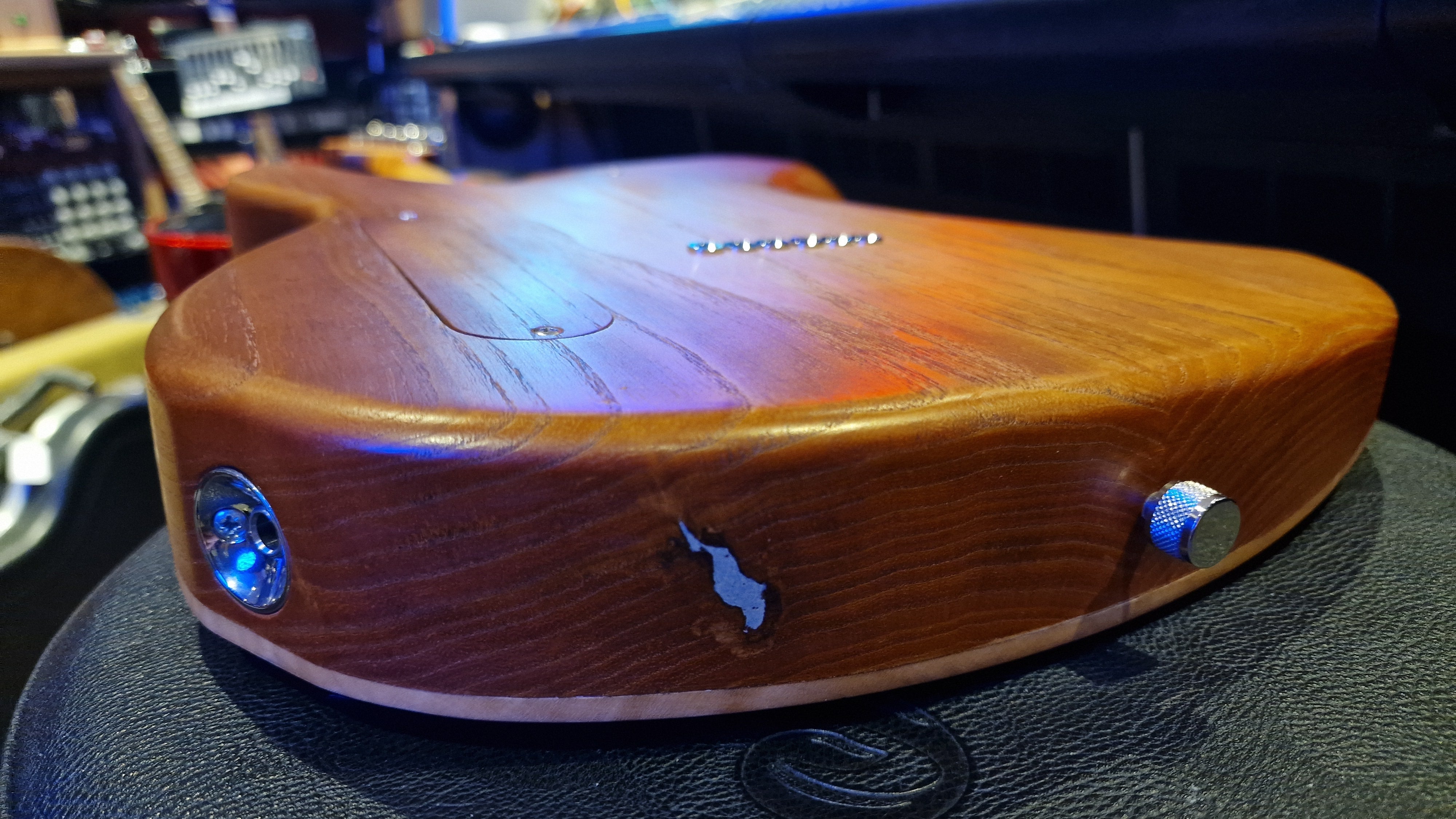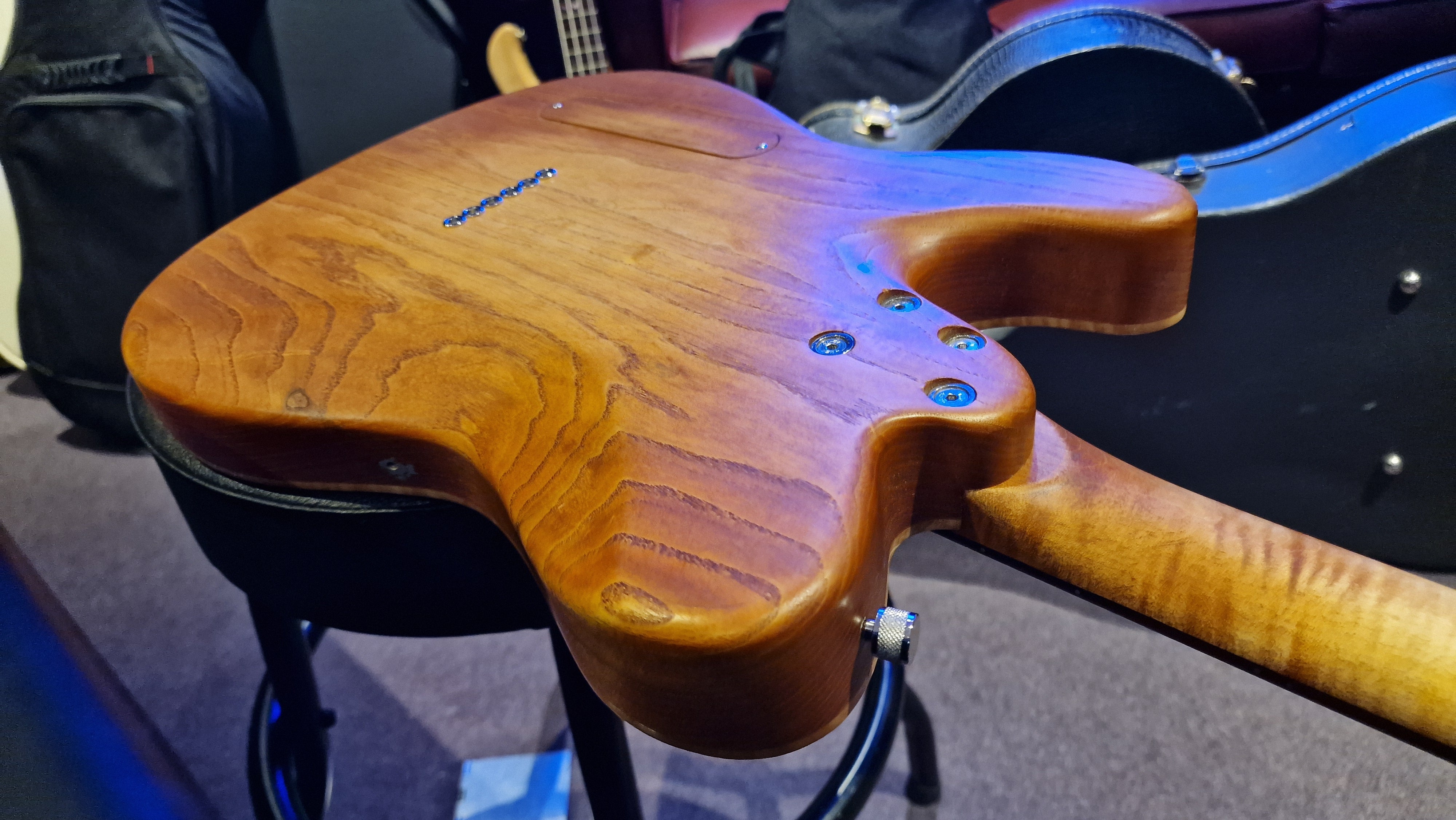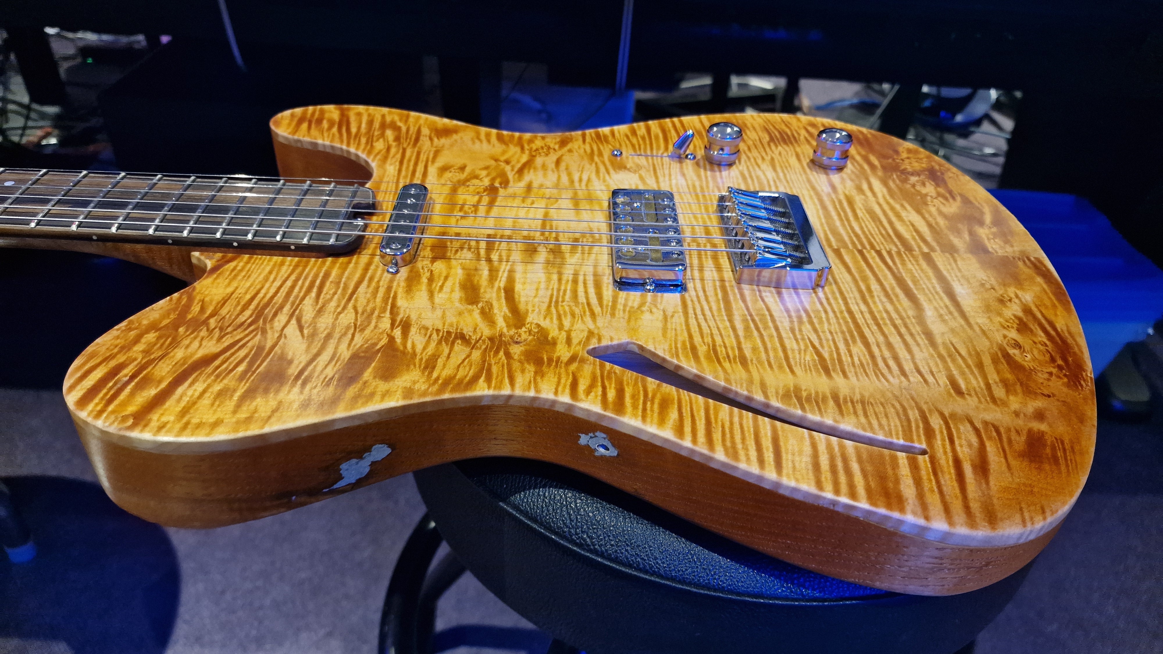The body is semi-hollow ash with flame maple top and neck. There was a wormhole found in the ash that was filled with aluminium for a killer effect. 25.5 scale, bound ebony fretboard. CTS Pots and Grainger hardtail string-thru bridge made in the UK.