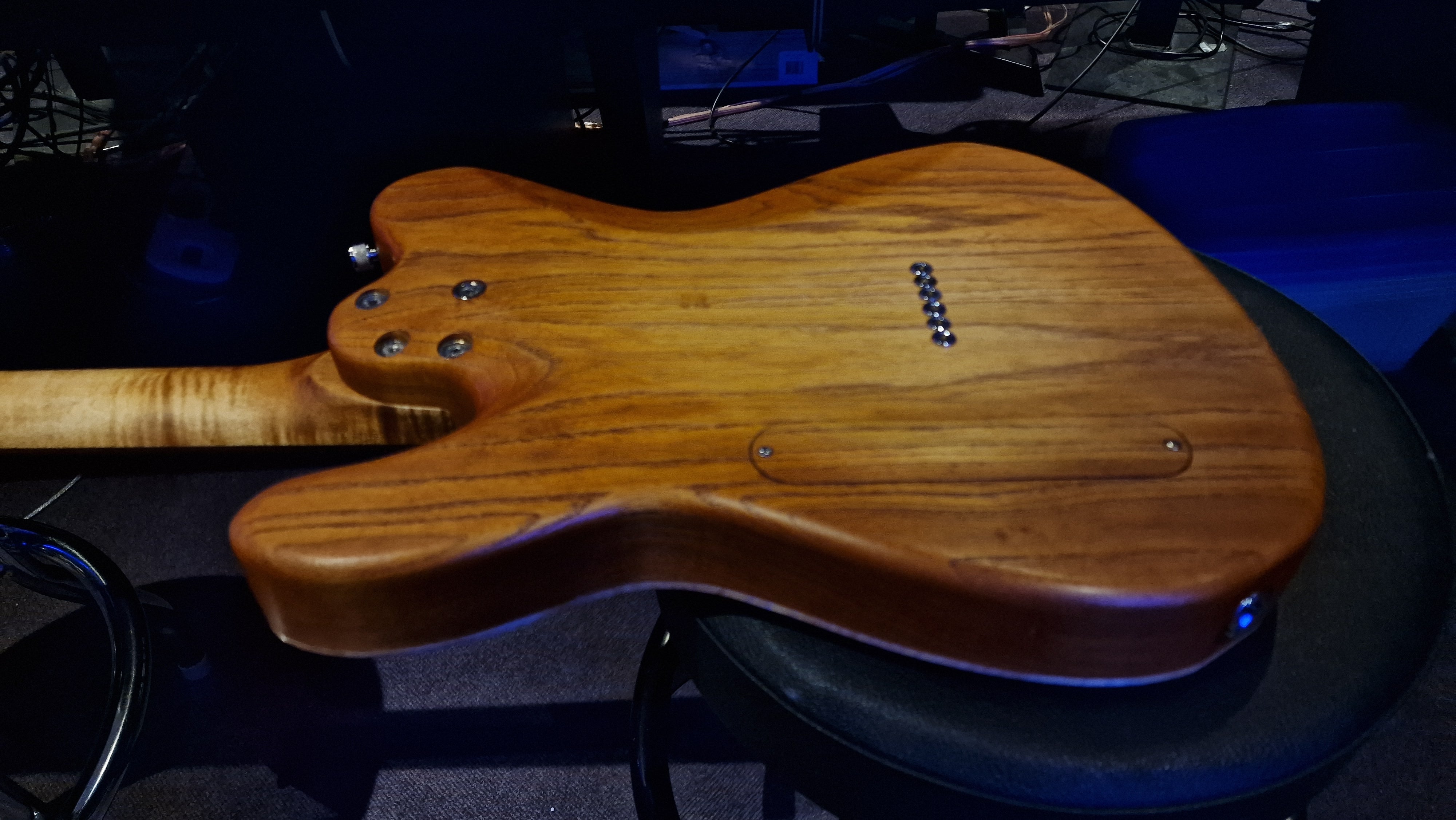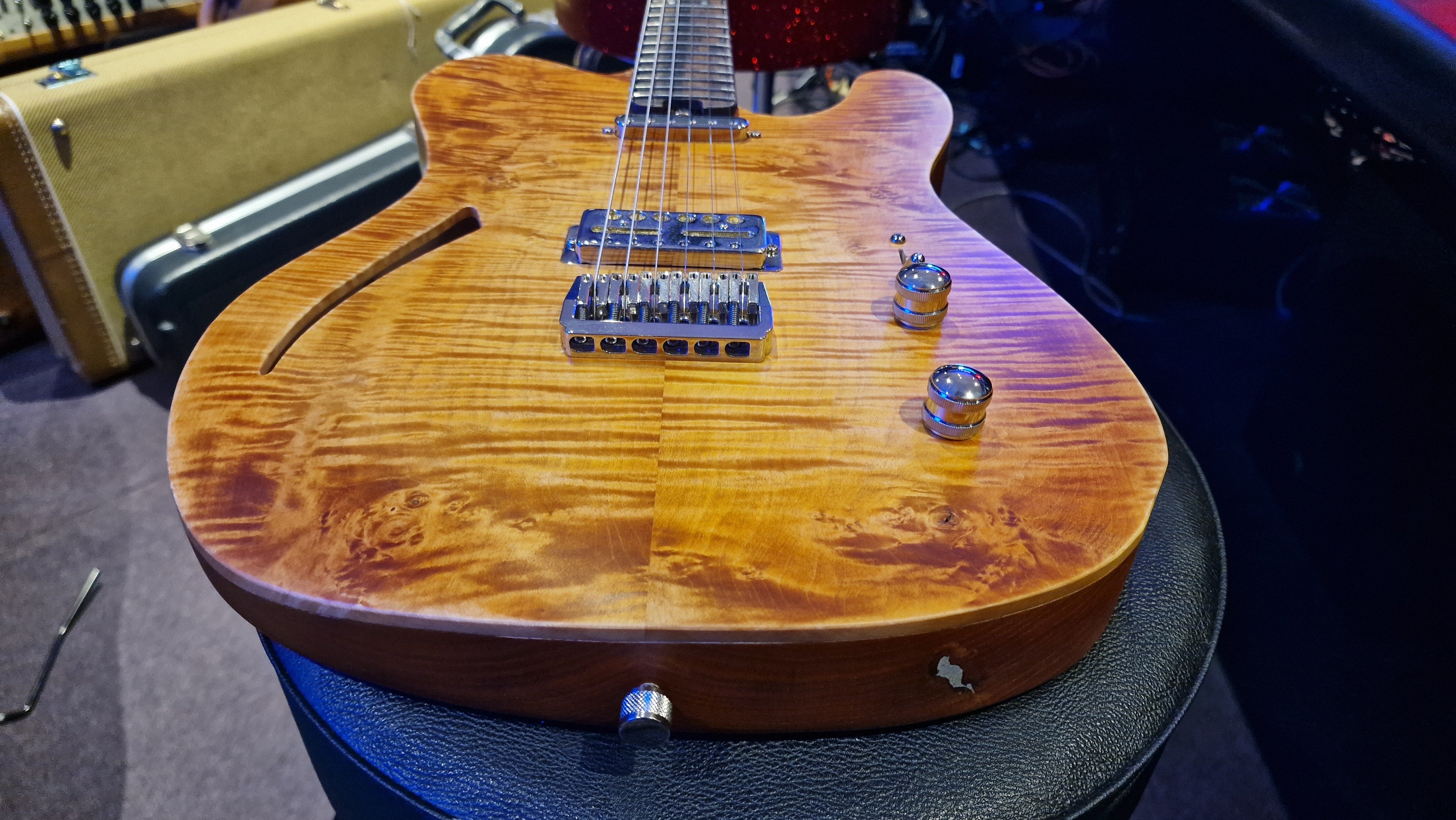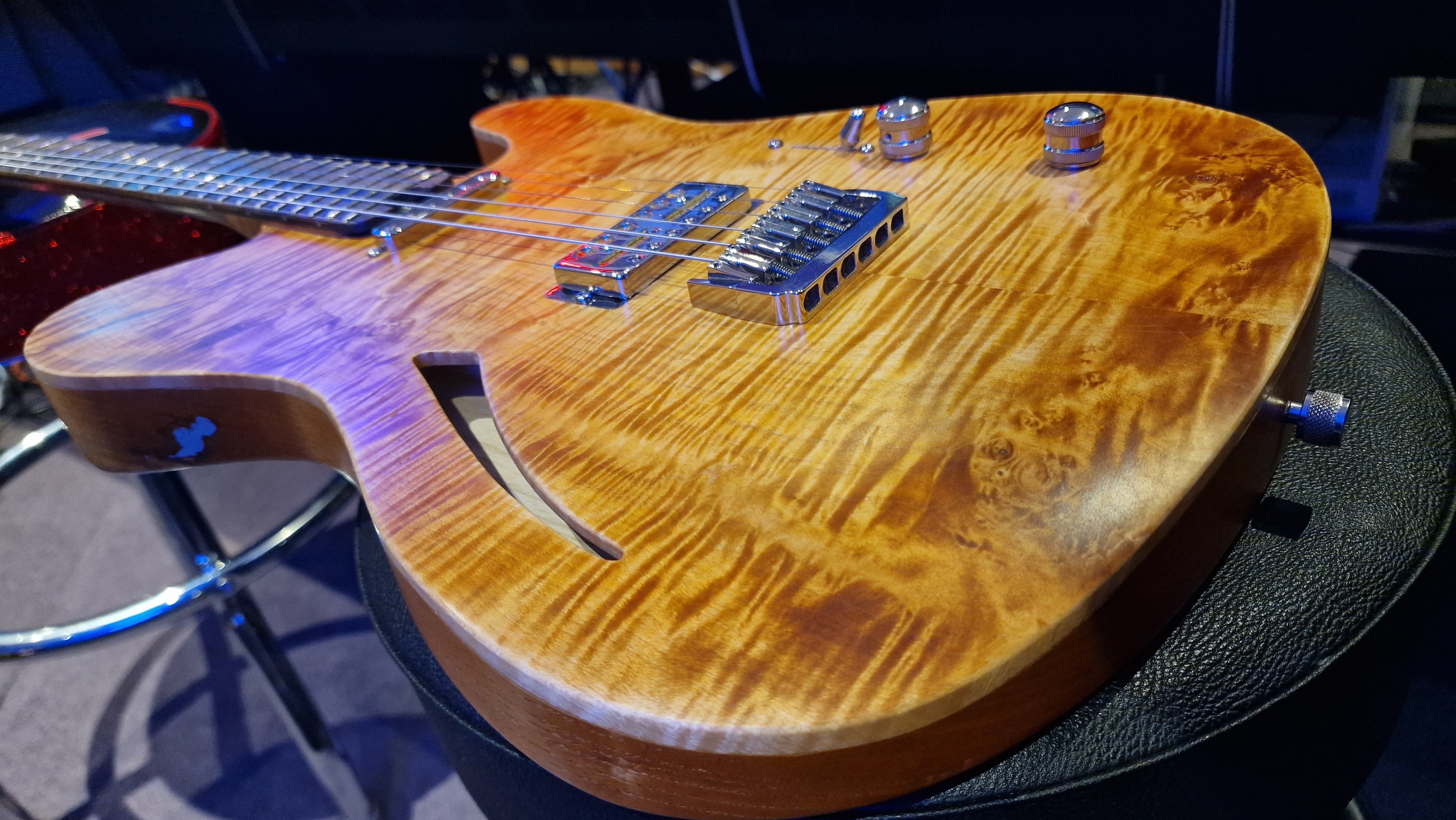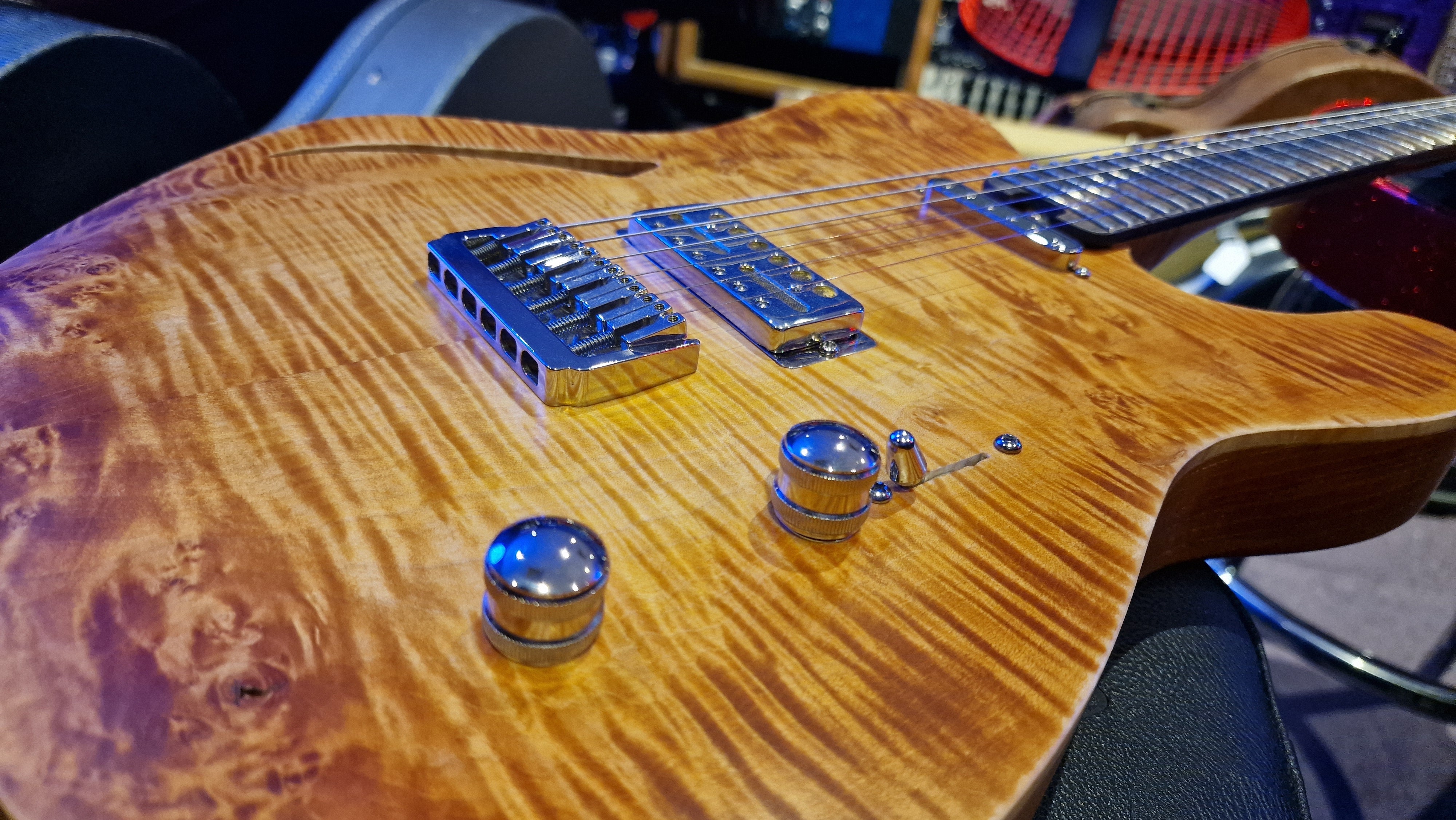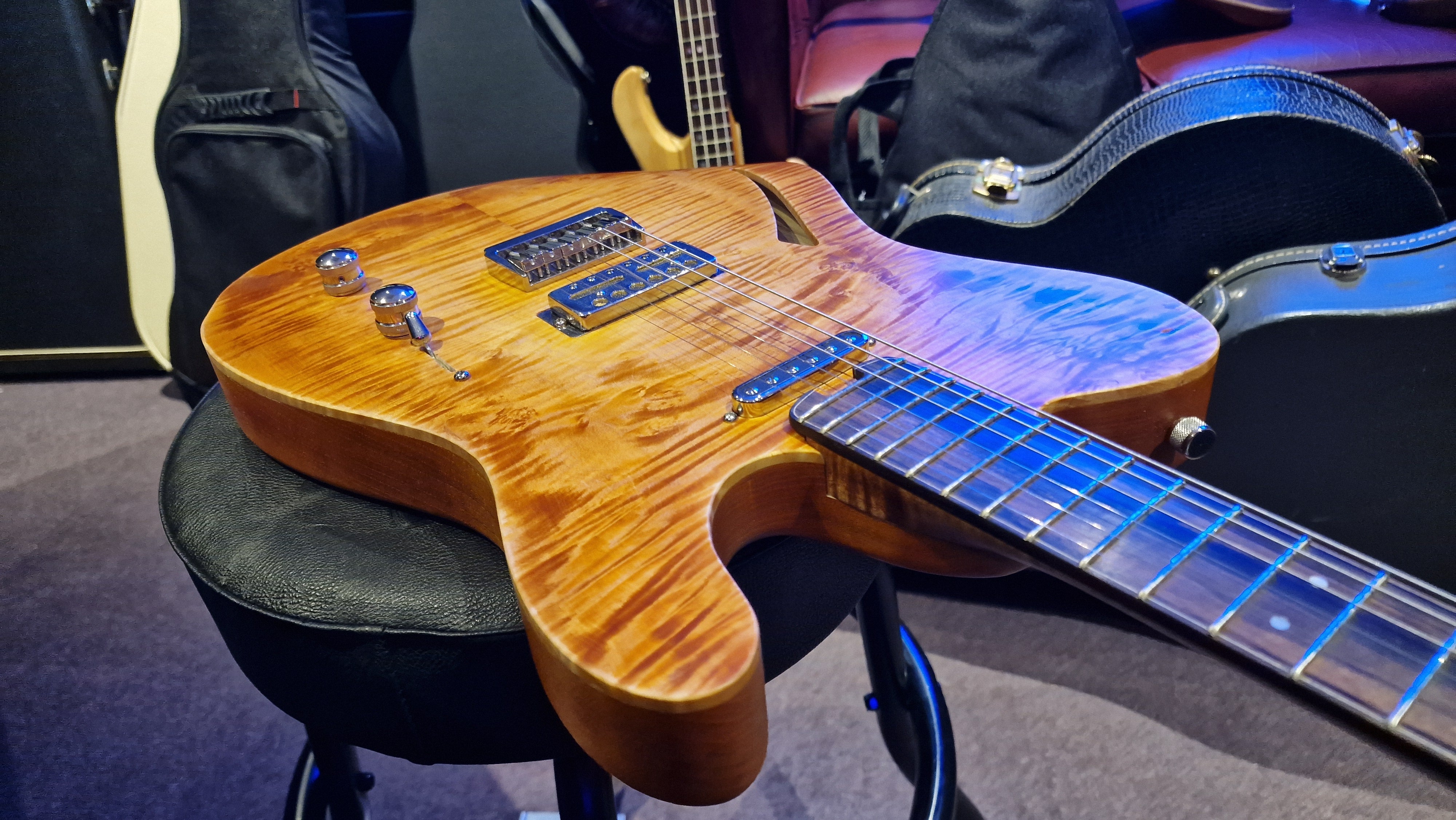 The body is semi-hollow ash with flame maple top and neck. There was a wormhole found in the ash that was filled with aluminium for a killer effect. 25.5 scale, bound ebony fretboard. CTS Pots and Grainger hardtail string-thru bridge made in the UK.