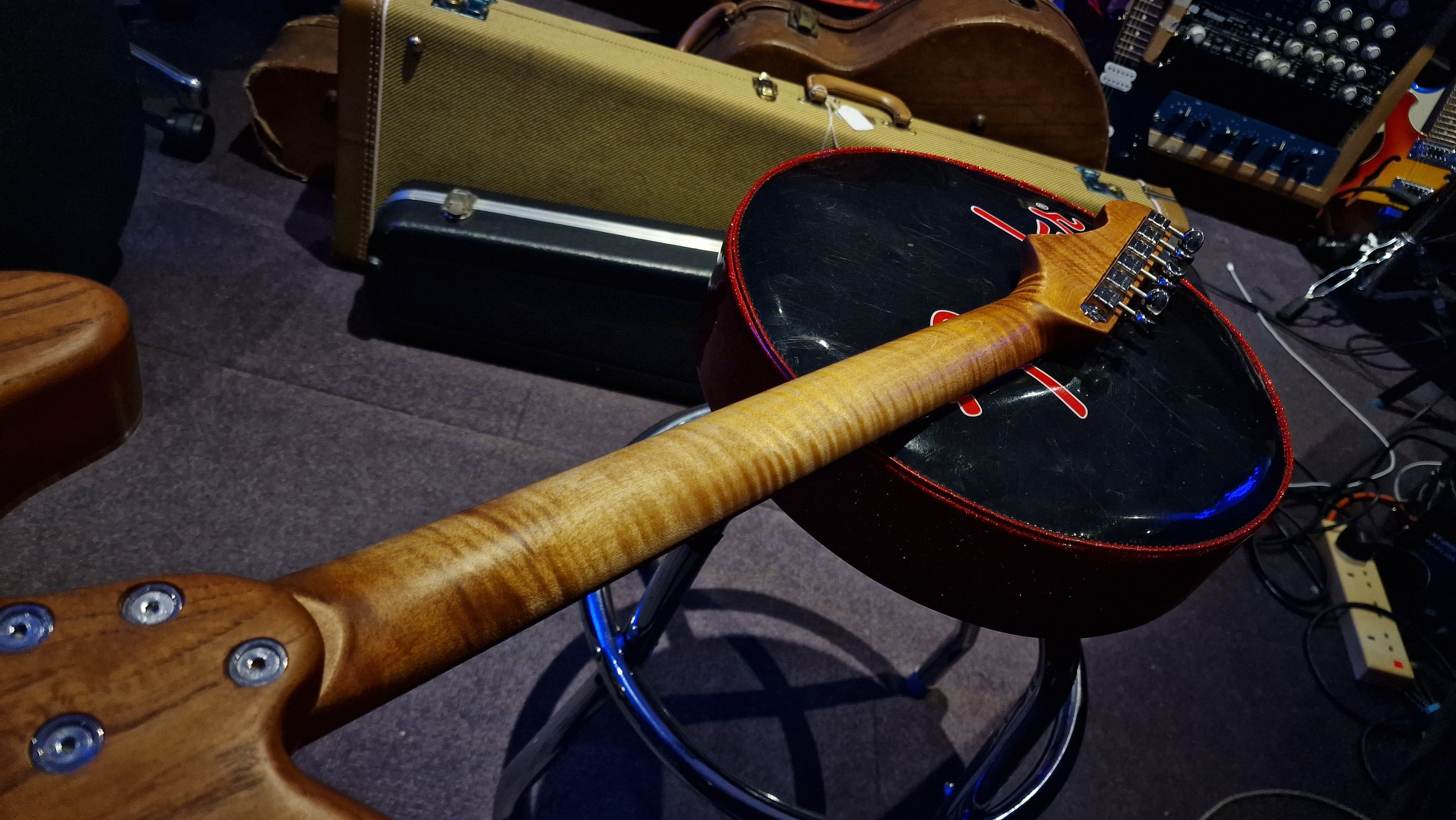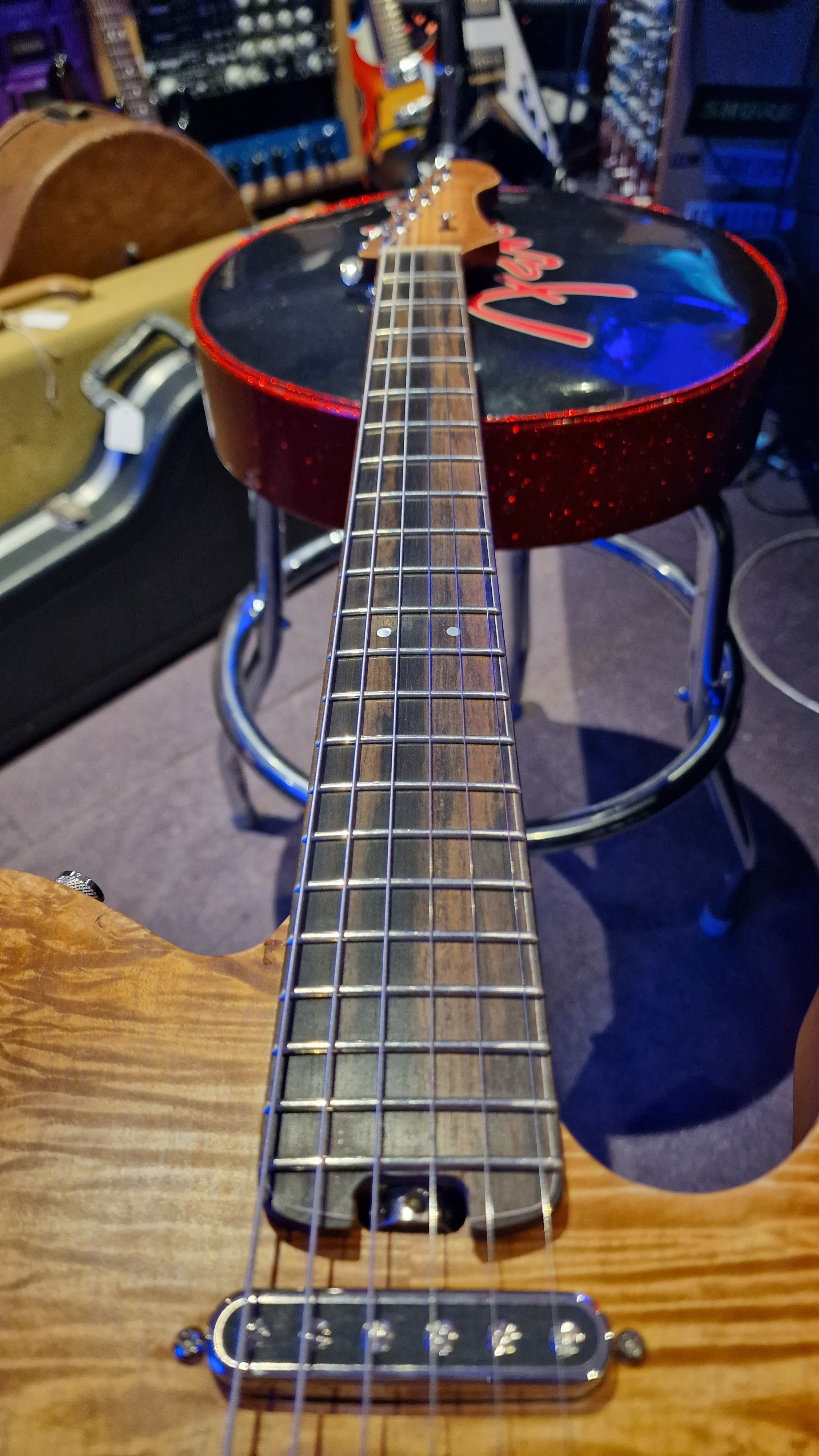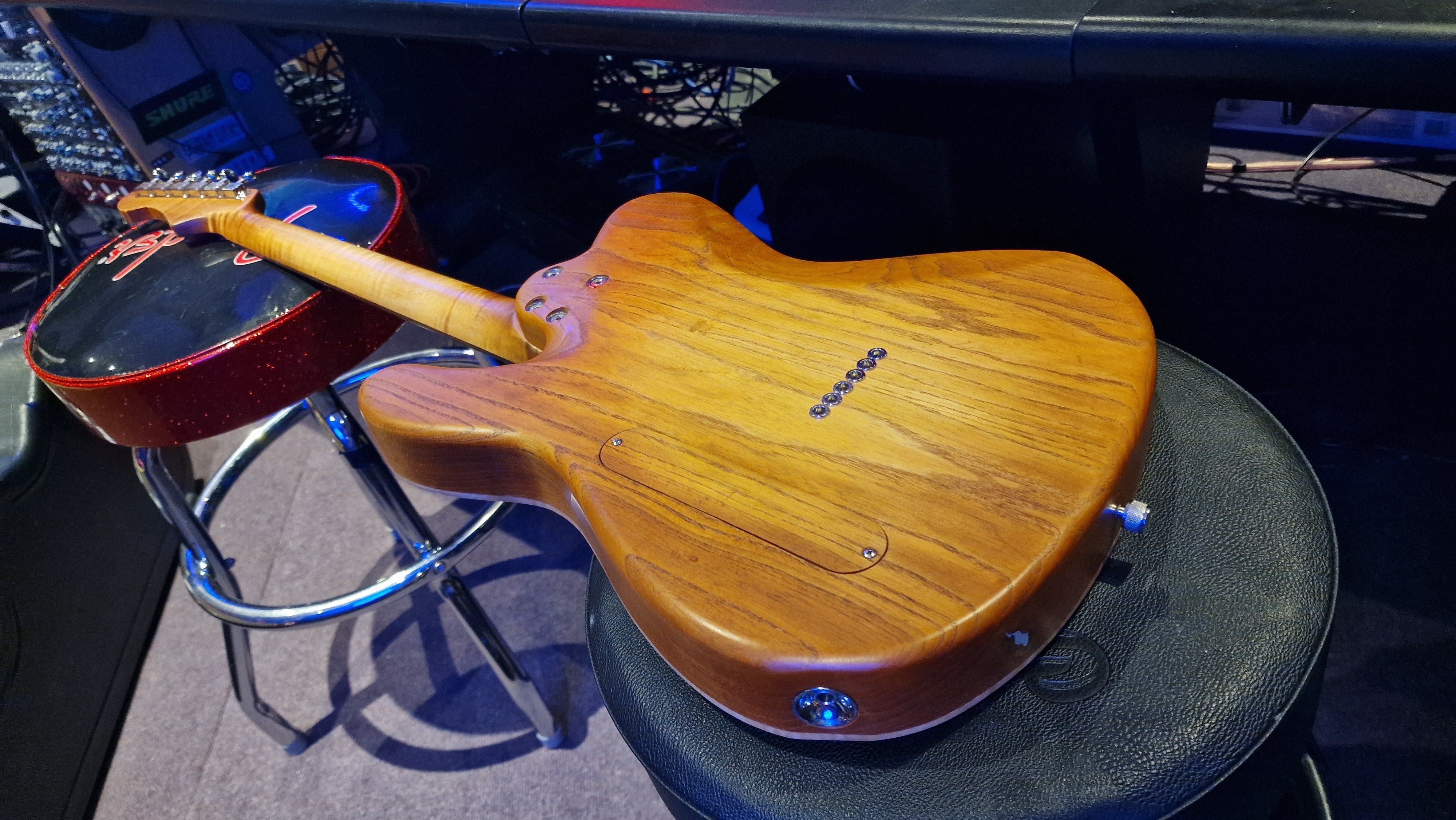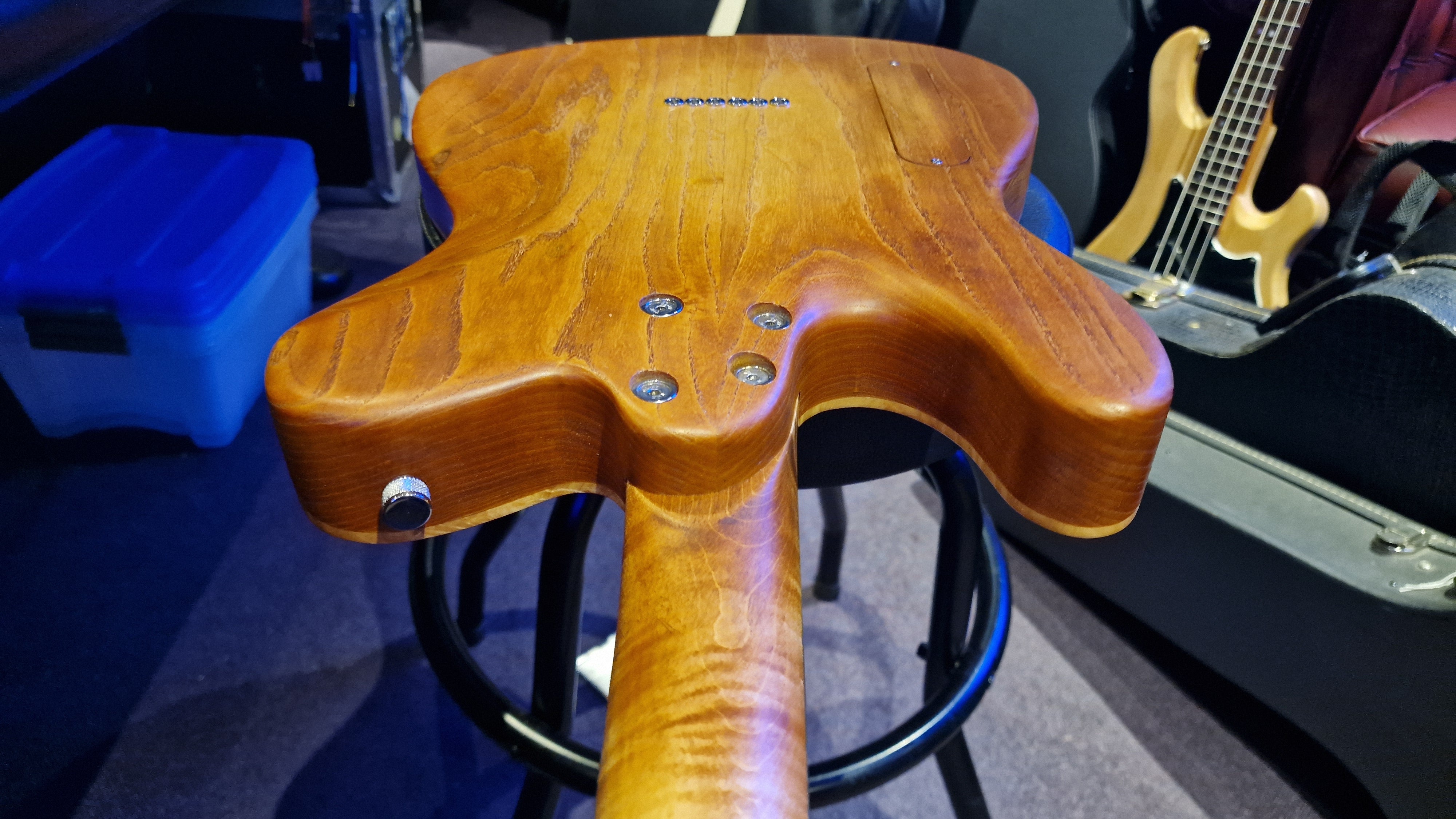 The body is semi-hollow ash with flame maple top and neck. There was a wormhole found in the ash that was filled with aluminium for a killer effect. 25.5 scale, bound ebony fretboard. CTS Pots and Grainger hardtail string-thru bridge made in the UK.