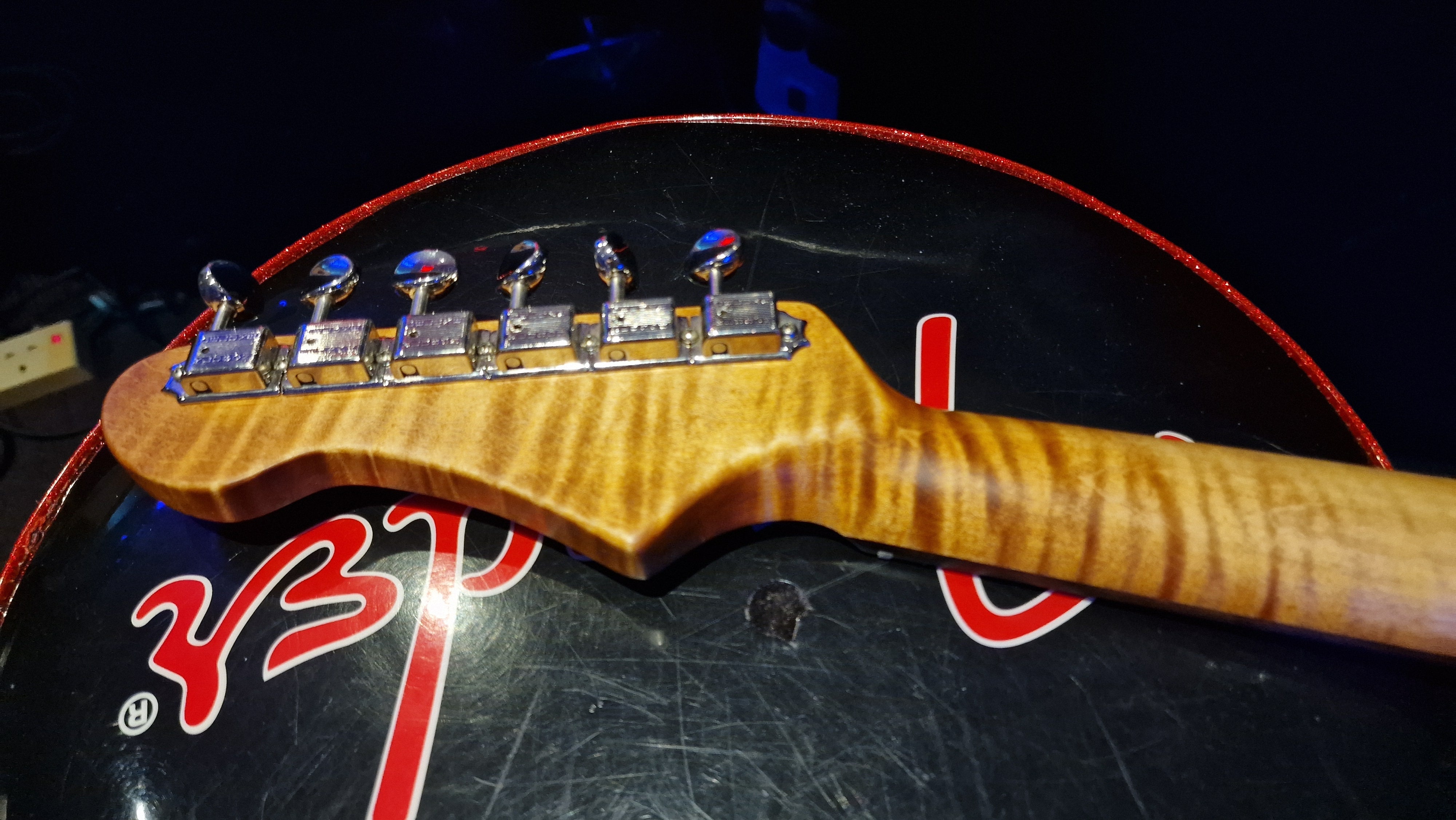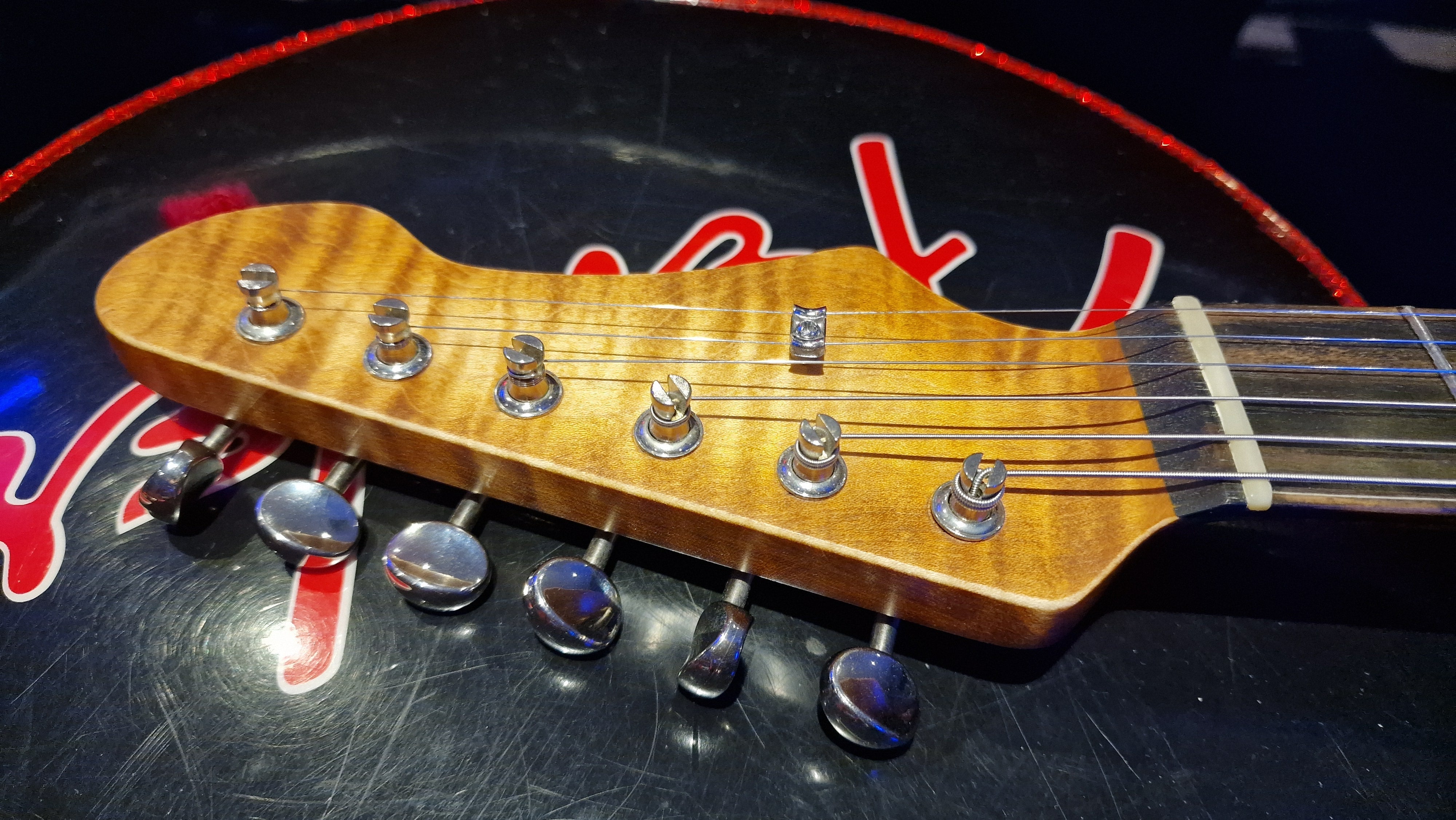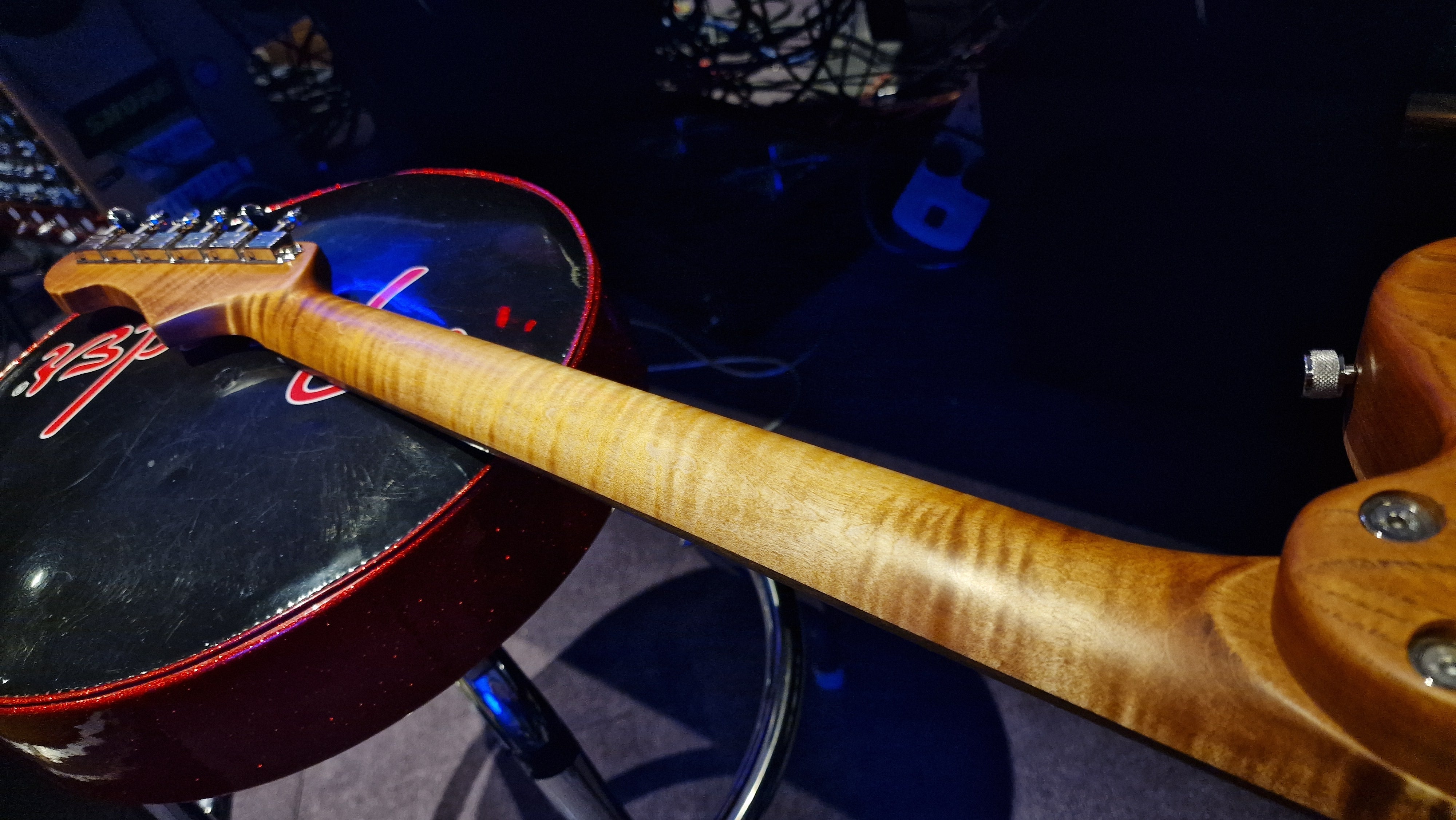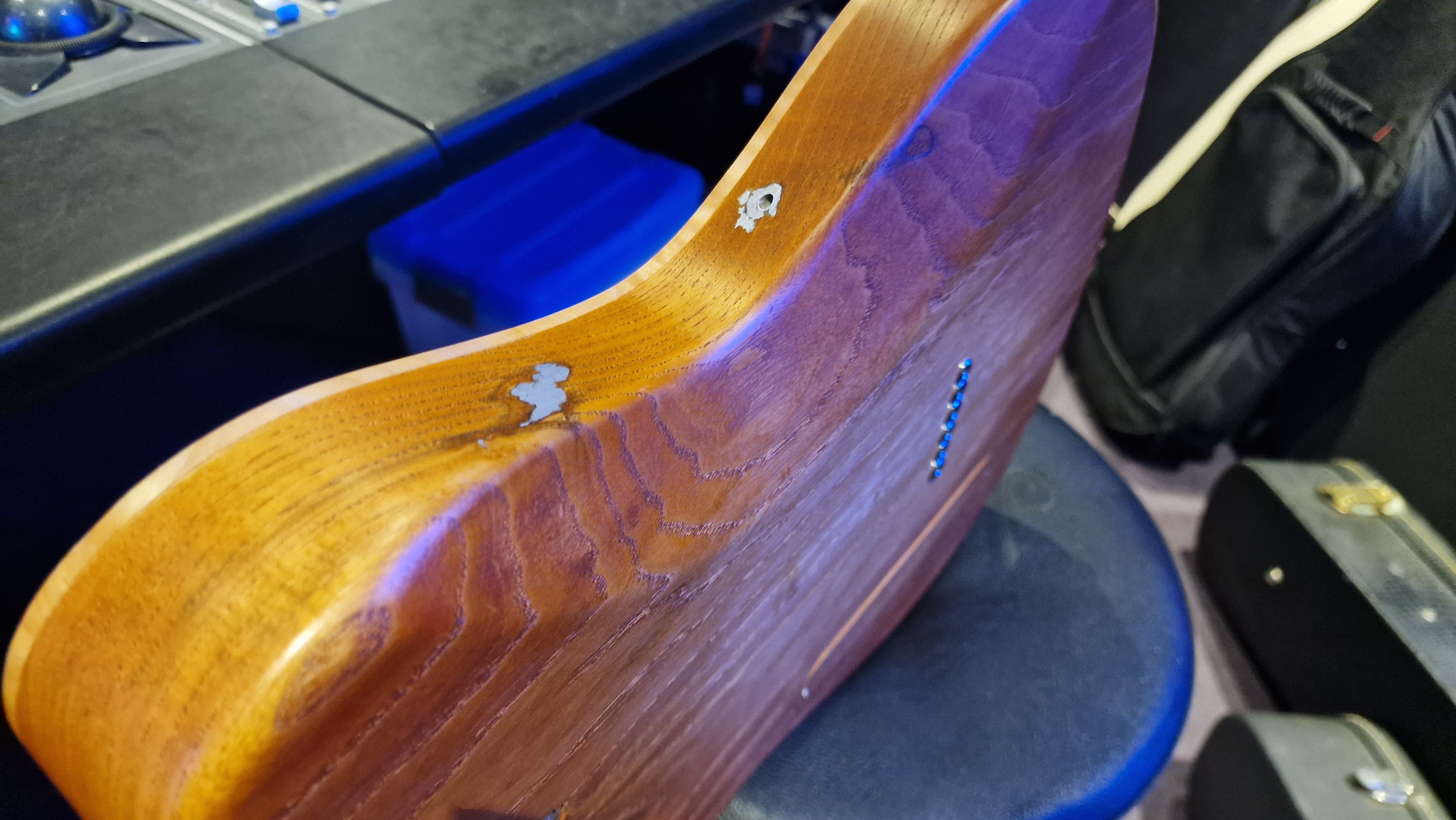 The body is semi-hollow ash with flame maple top and neck. There was a wormhole found in the ash that was filled with aluminium for a killer effect. 25.5 scale, bound ebony fretboard. CTS Pots and Grainger hardtail string-thru bridge made in the UK.