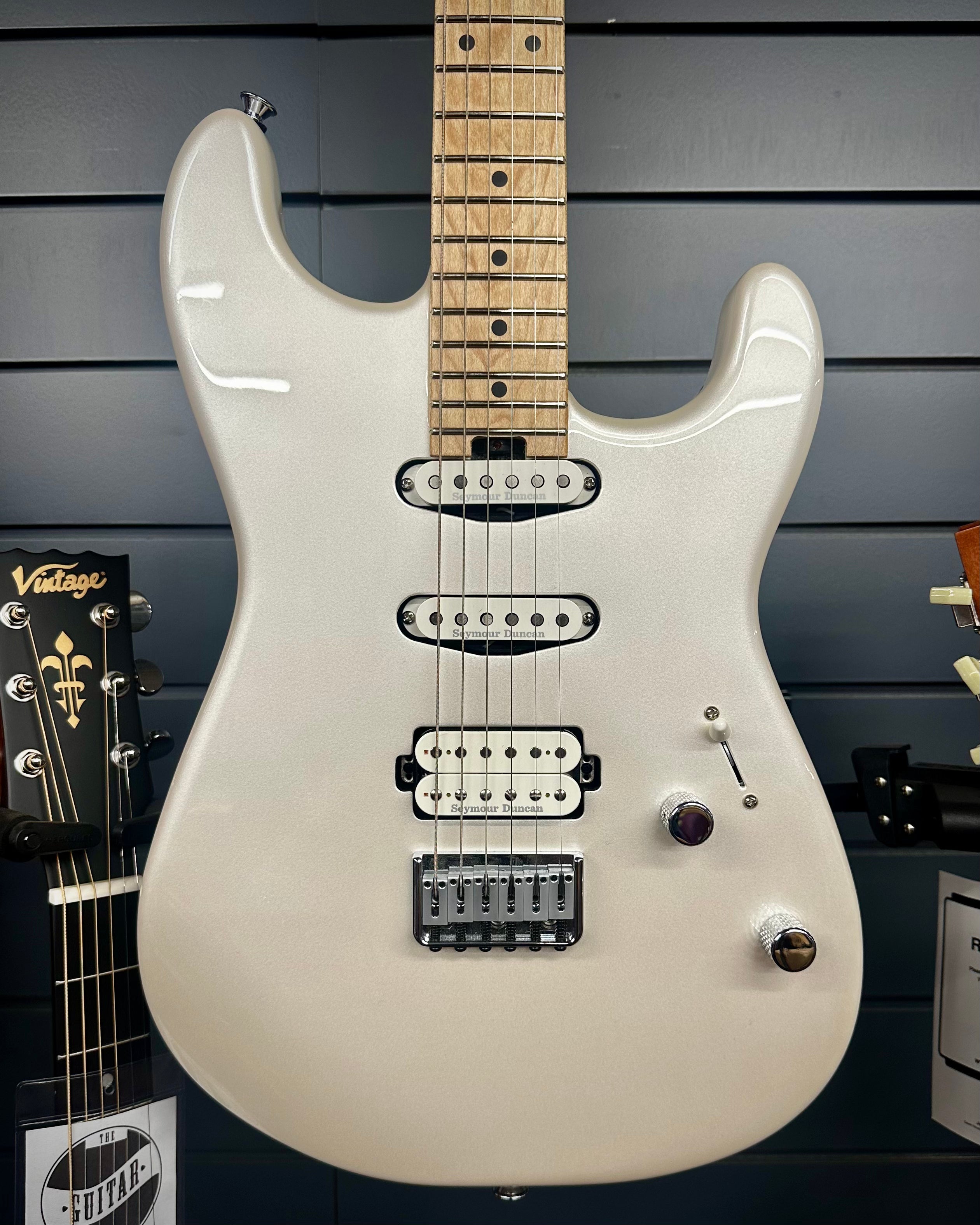 A beautiful example of Charvel's work in a stunning pearlescent finish that can never be truly captured on camera. Seymour Duncan pickups that are full of life and very rich sounding, combined with a hardtail bridge and a maple fretboard make this guitar sparkly not just in appearance. An absolute pleasure to play, this guitar will make someone very happy.