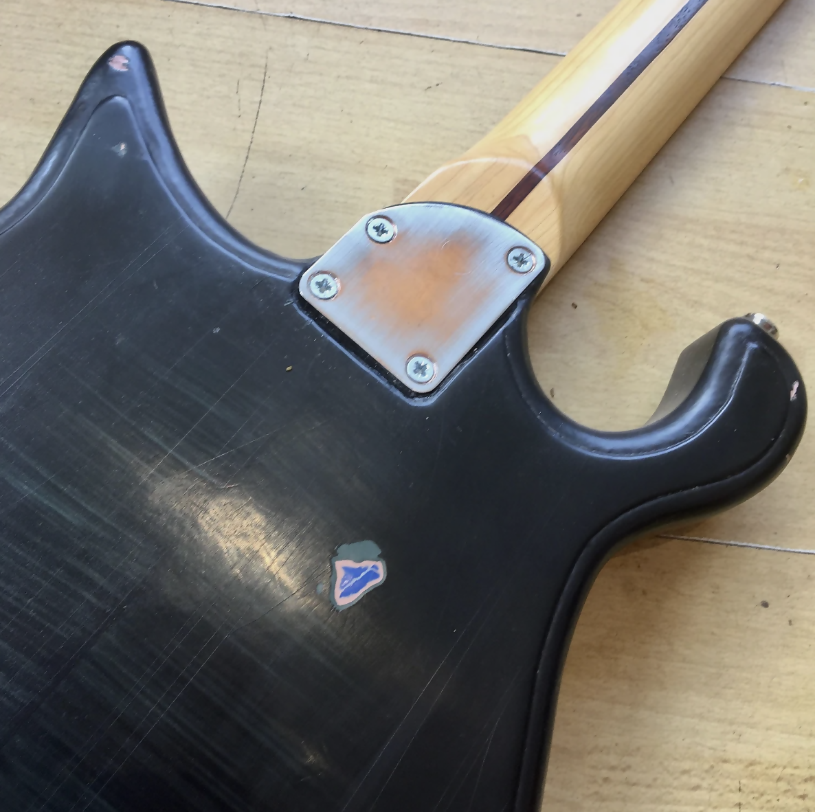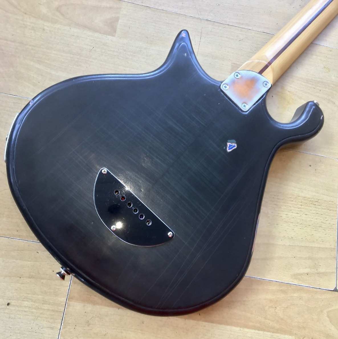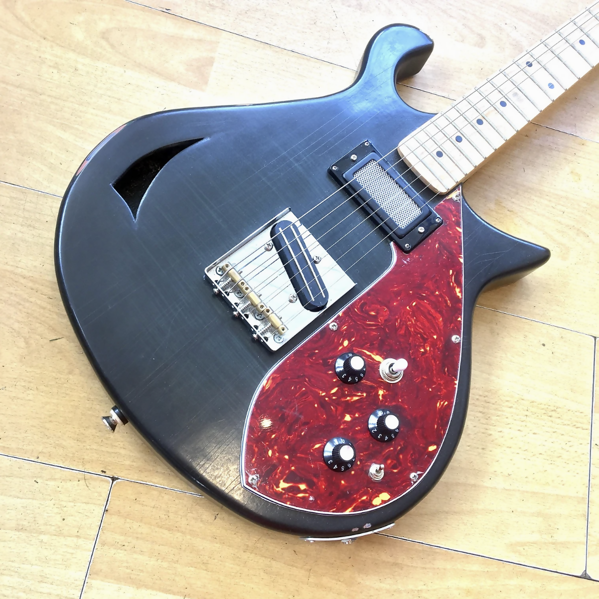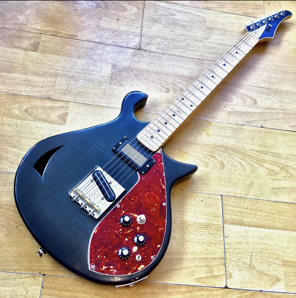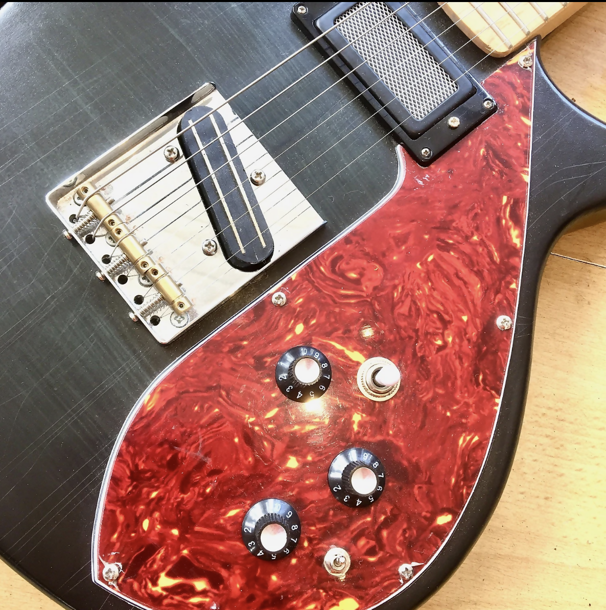 It's reliced paint work , unsual body shape and interesting pickups,make this a seriously cool and unusual, one off guitar!