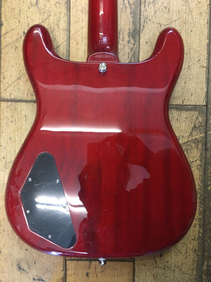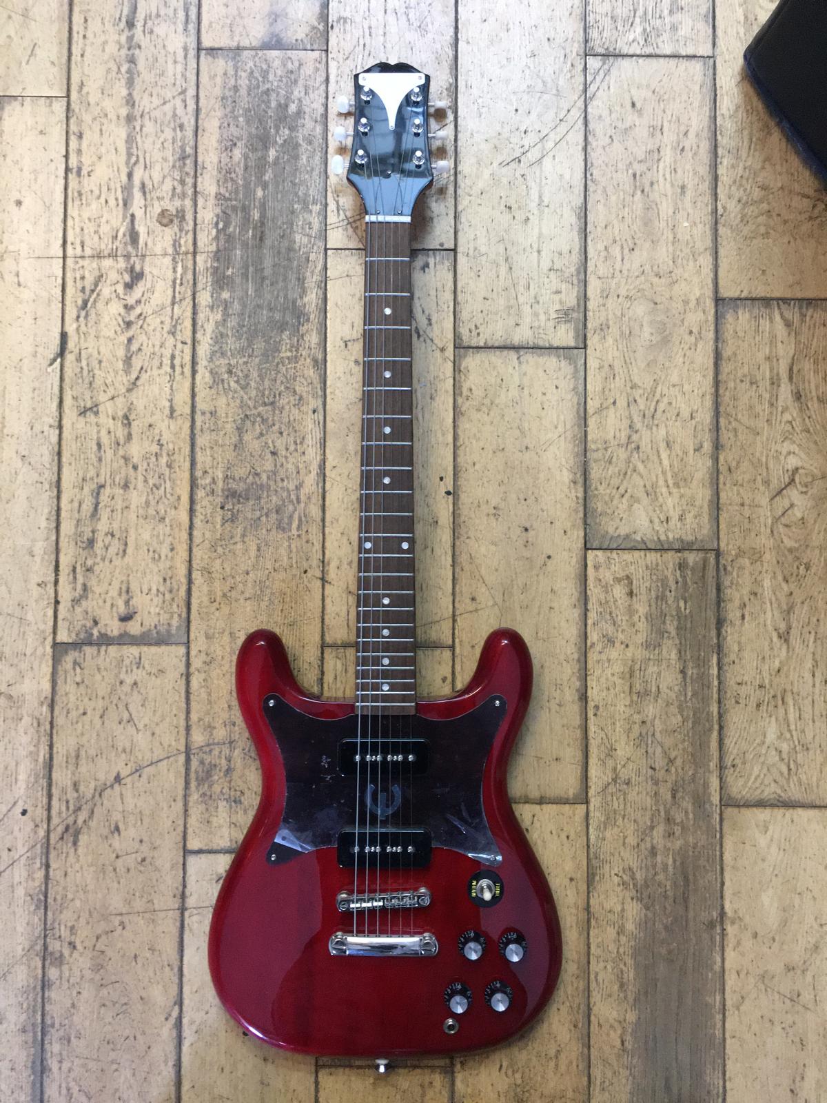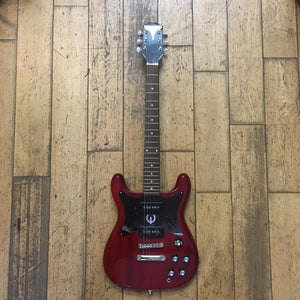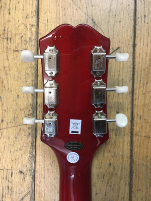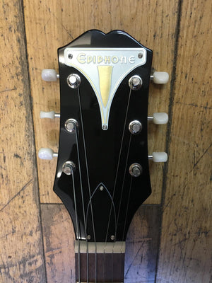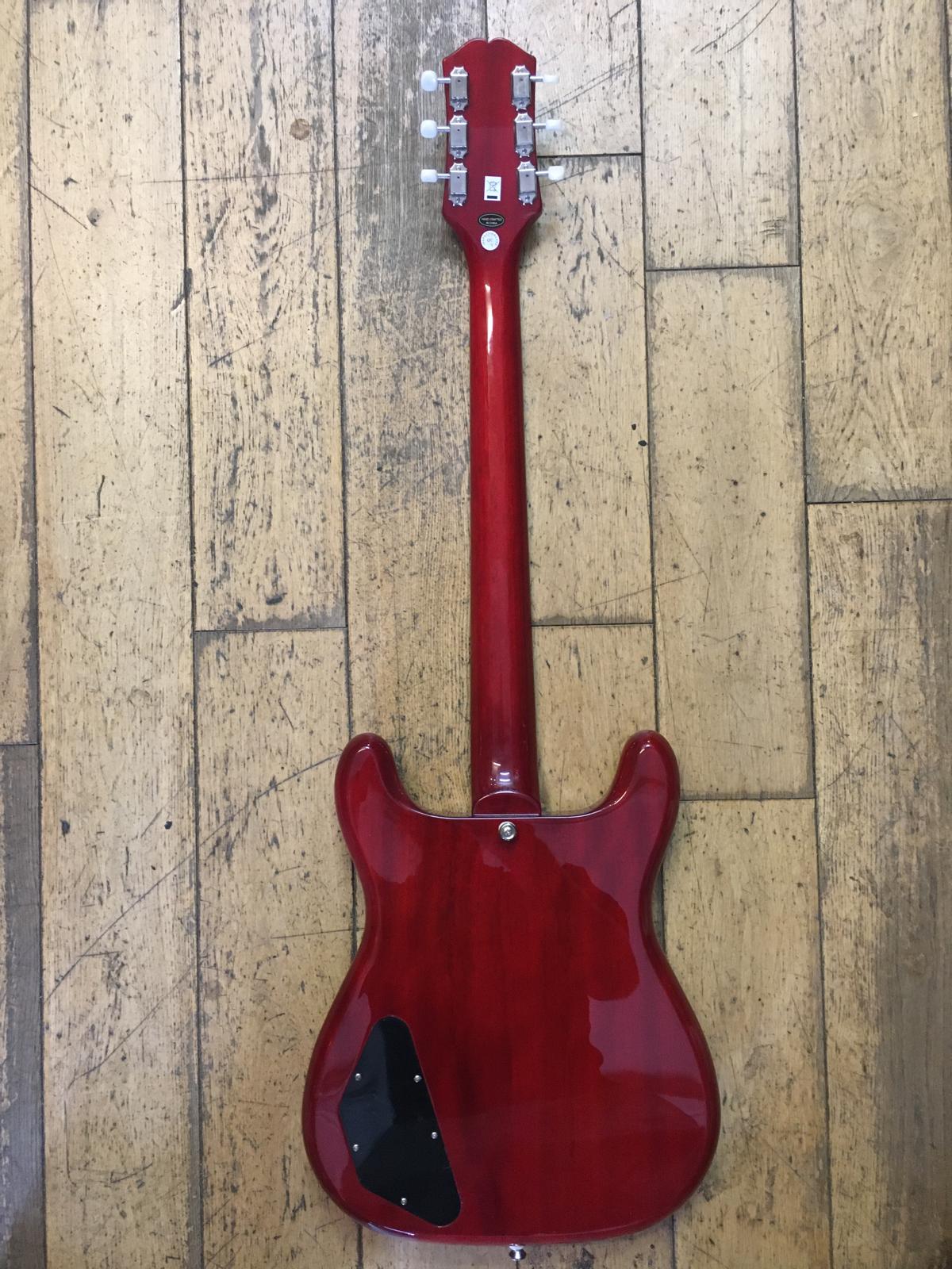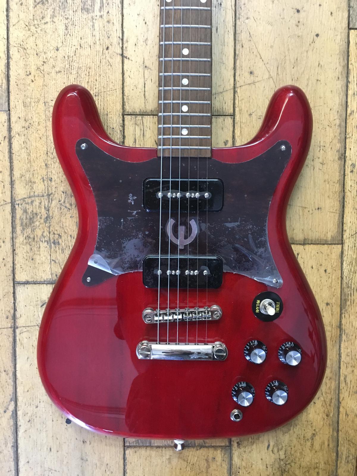 From its first appearance in 1959 the Wilshire™ has been one of Epiphone's most successful original solid body electric guitar designs. The Wilshire P-90 brings back many of the features of the earliest Wilshire models including the symmetrical double-cutaway mahogany body with dual PRO P-90 Soapbar pickups, three on a side reduced sized Kalamazoo headstock with Epiphone Bikini badge and ivory button Epiphone Deluxe tuning machines, and a butterfly tortoise shell pickguard with foil E logo. The Wilshire P-90 comes equipped with a glued-in mahogany neck with a medium C profile, Indian laurel fretboard with 12" radius and 22 medium jumbo frets, 2 volume and 2 tone controls and an Epiphone LockTone™ Tune-O-Matic™ bridge and Stop Bar tailpiece, and is available in classic Cherry and Ebony finishes.