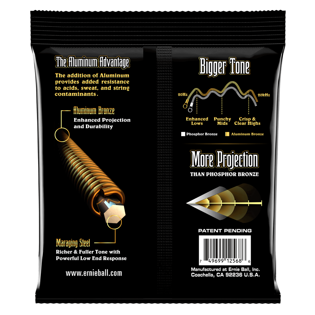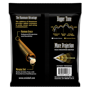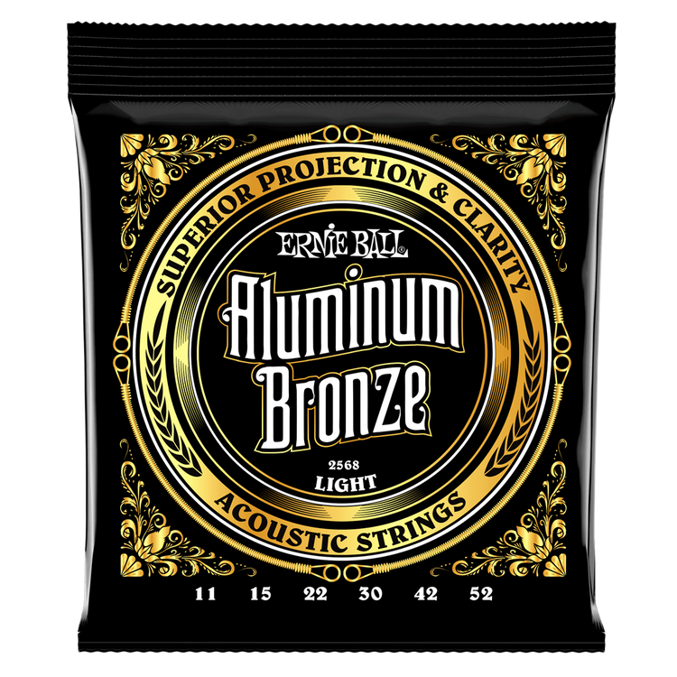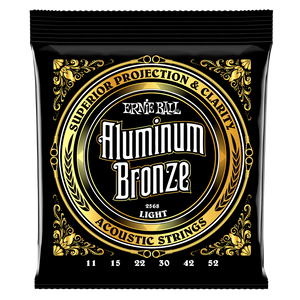 Ernie Ball Aluminium Bronze Acoustic Guitar Strings feature more projection and clarity than traditional bronze strings, while also providing improved corrosion resistance. Aluminium Bronze Acoustic strings are made with Ernie Ball Maraging Steel hex cores and Aluminium Bronze wrap wire which provide more pronounced lows coupled with crisp brilliant highs. Made from a blend of copper and aluminium specifically tailored for acoustic guitar strings. Light gauge .011, .015, .022, .030, .042, .052