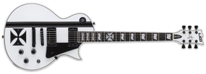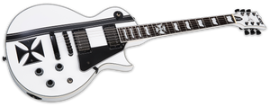 The LTD Iron Cross is a Signature Series model of James Hetfield, the frontman of Metallica and one of the world's most highly respected rhythm guitar players in any genre. The Iron Cross is based on James' personal custom instrument design, and features set-neck construction of a mahogany body with maple cap, and a three-piece mahogany neck with ebony fingerboard and 22 extra-jumbo frets with an Iron Cross inlay at the 12th fret. The LTD Iron Cross is powered by James' own EMG JH SET active pickups, and includes a TonePros locking TOM bridge and tailpiece. Available in Snow White finish with black stripe graphic and iron cross fixture.