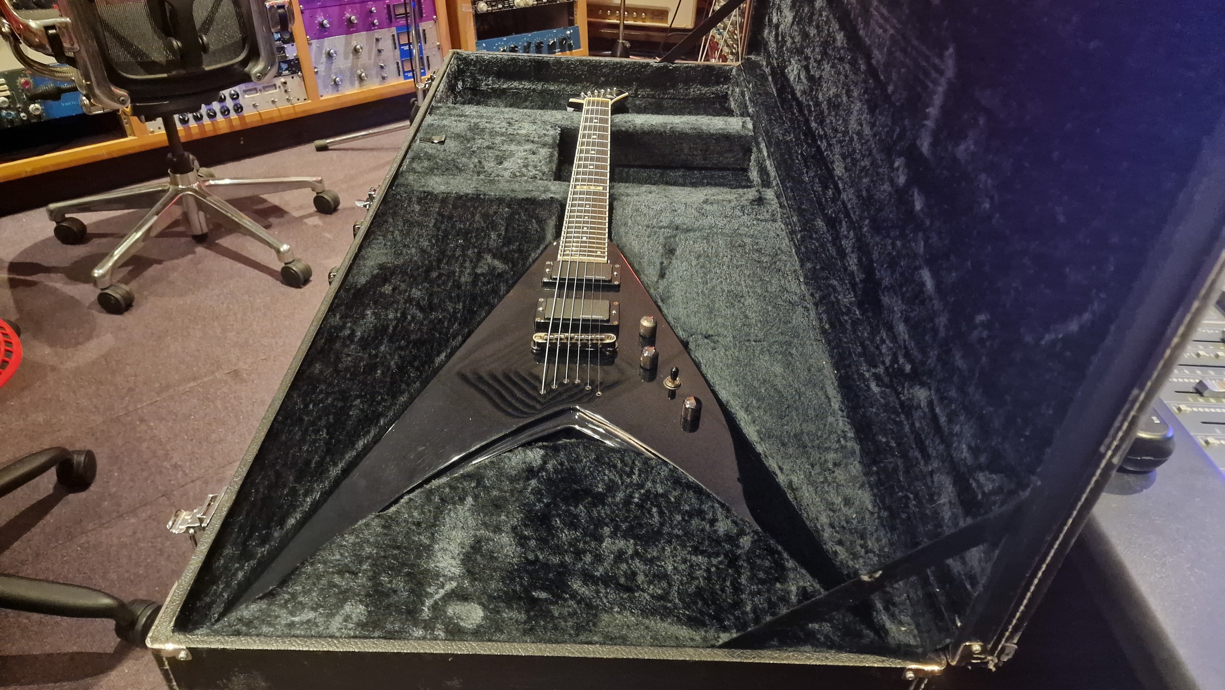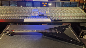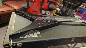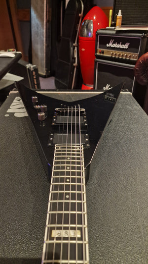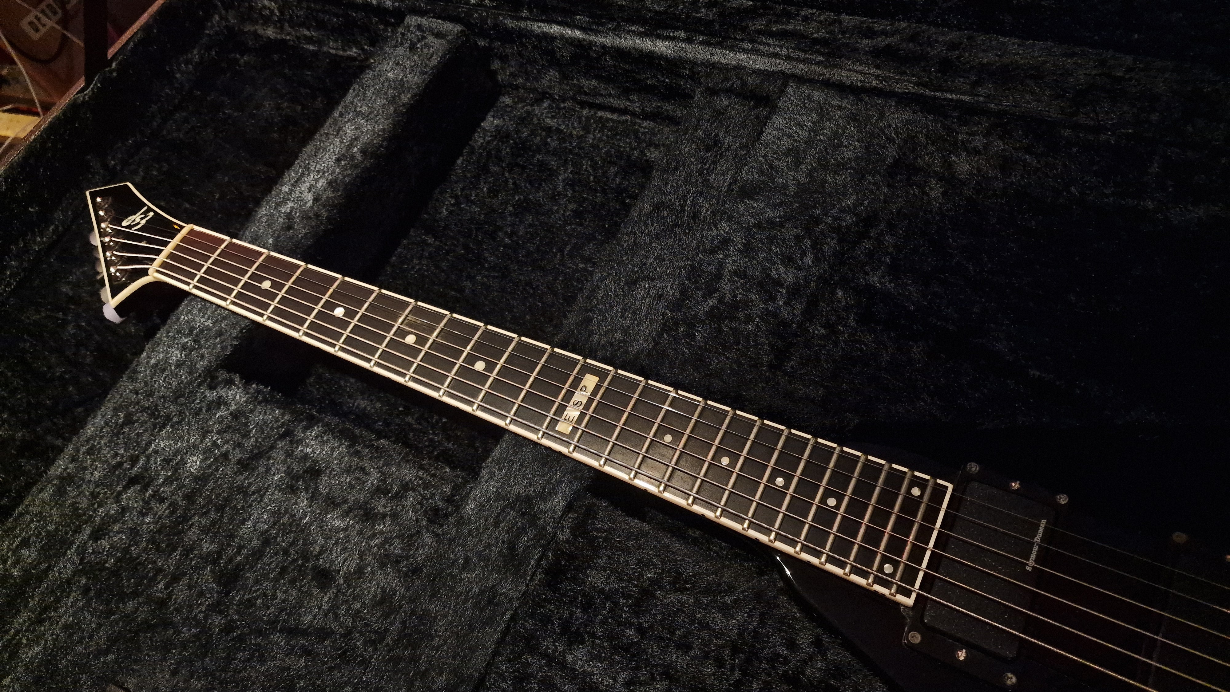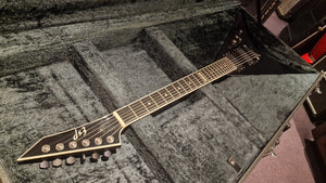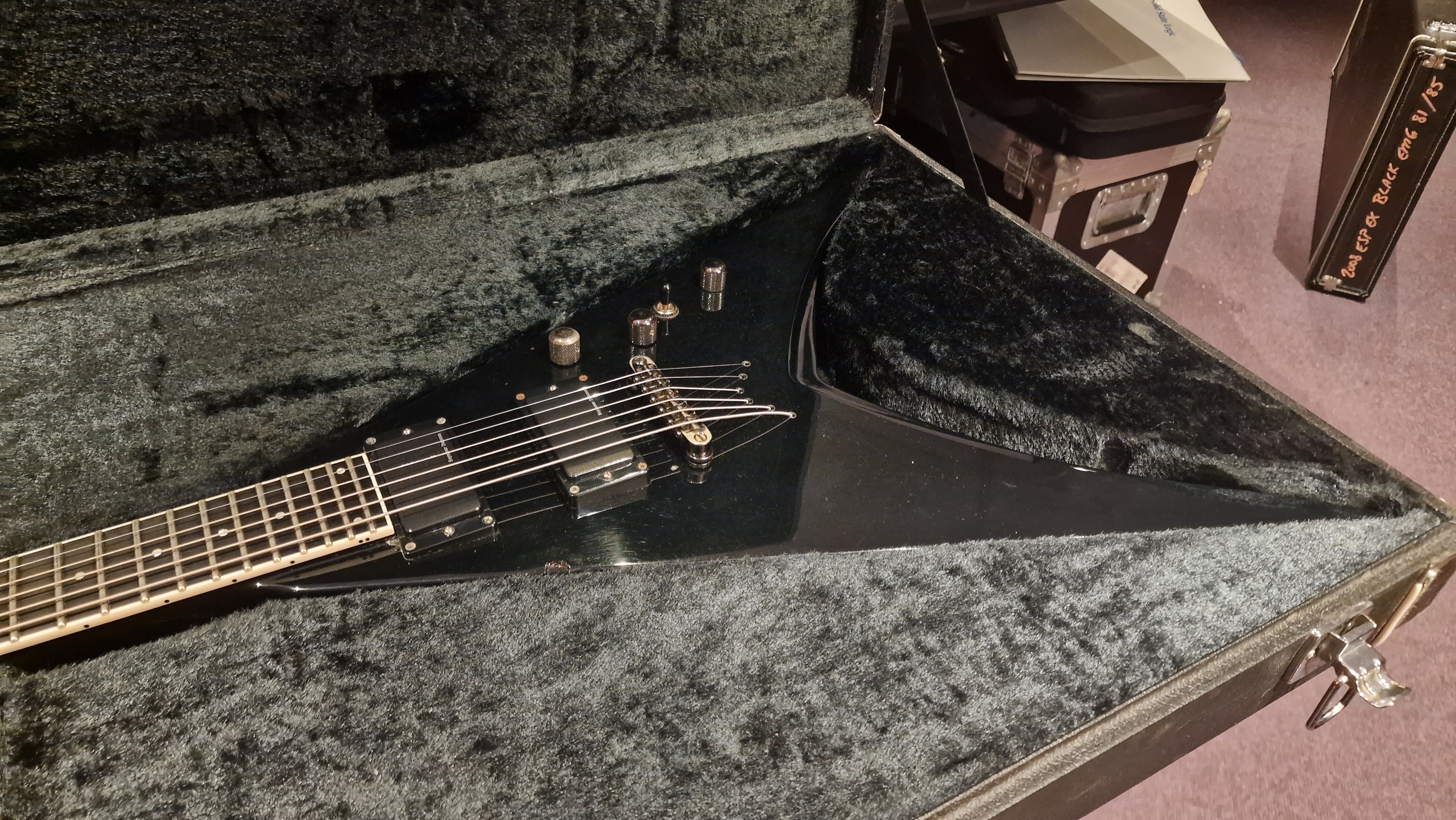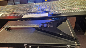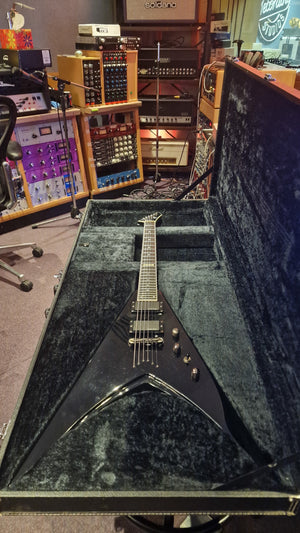 RARE ESP V from Japan. 2006 model year. This special ESP V was created at a time when Dave Mustaine of Megadeth was leaving ESP for his partnership with Dean Guitars after Dave took exception to the way ESP's USA team was marketing his name. As ESP could no longer make the DV8 with Dave's name, it then created this ESP V for the last run. Very rare "ESP" logo on the headstock. It features Sperzel USA locking tuners and Seymour Duncan blackout pickups with string-through body. The guitar is a dream to play. This is the only one we have ever been able to get our hands on, and we don't expect to ever find another. When it's gone, it's gone.
