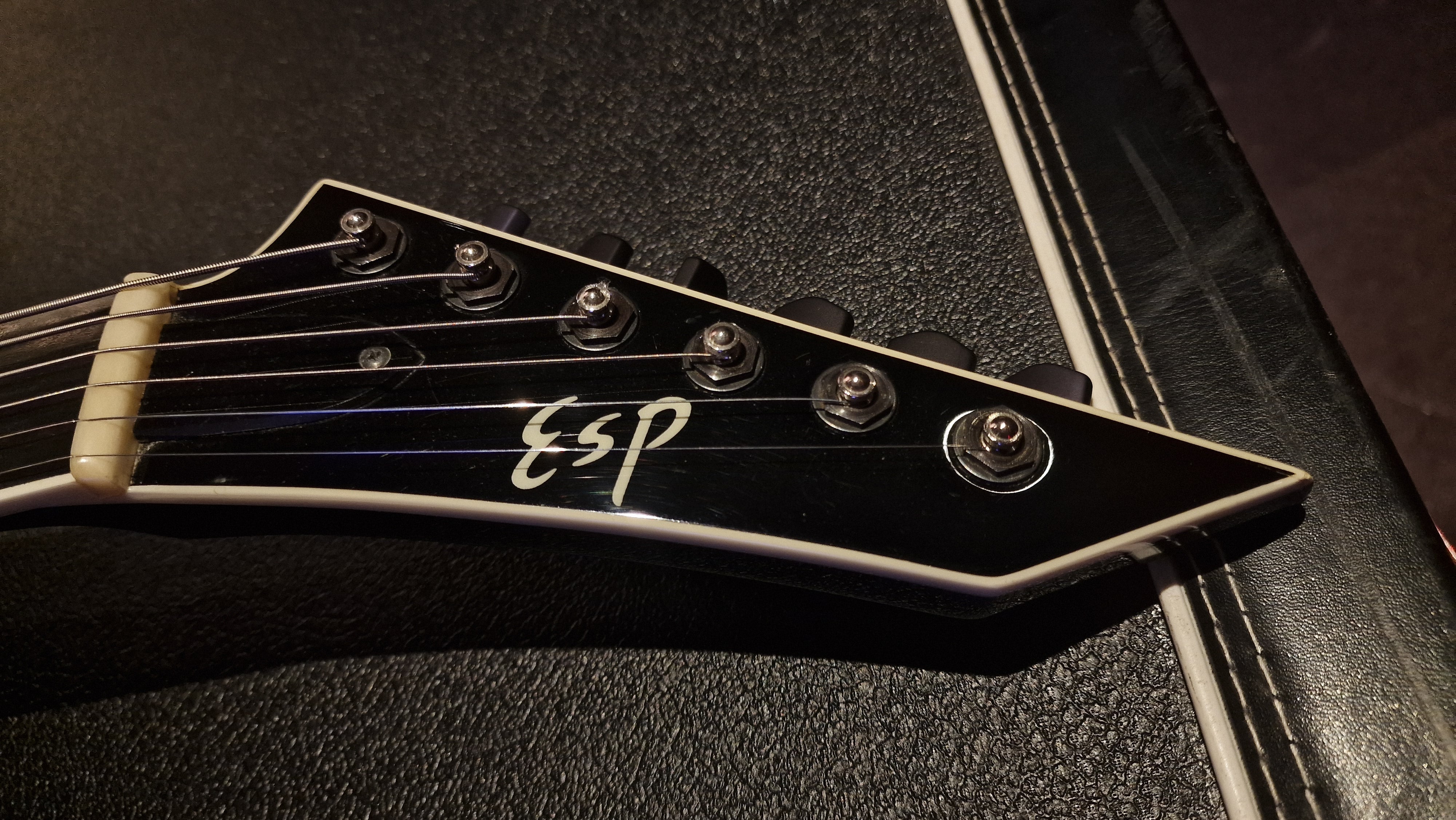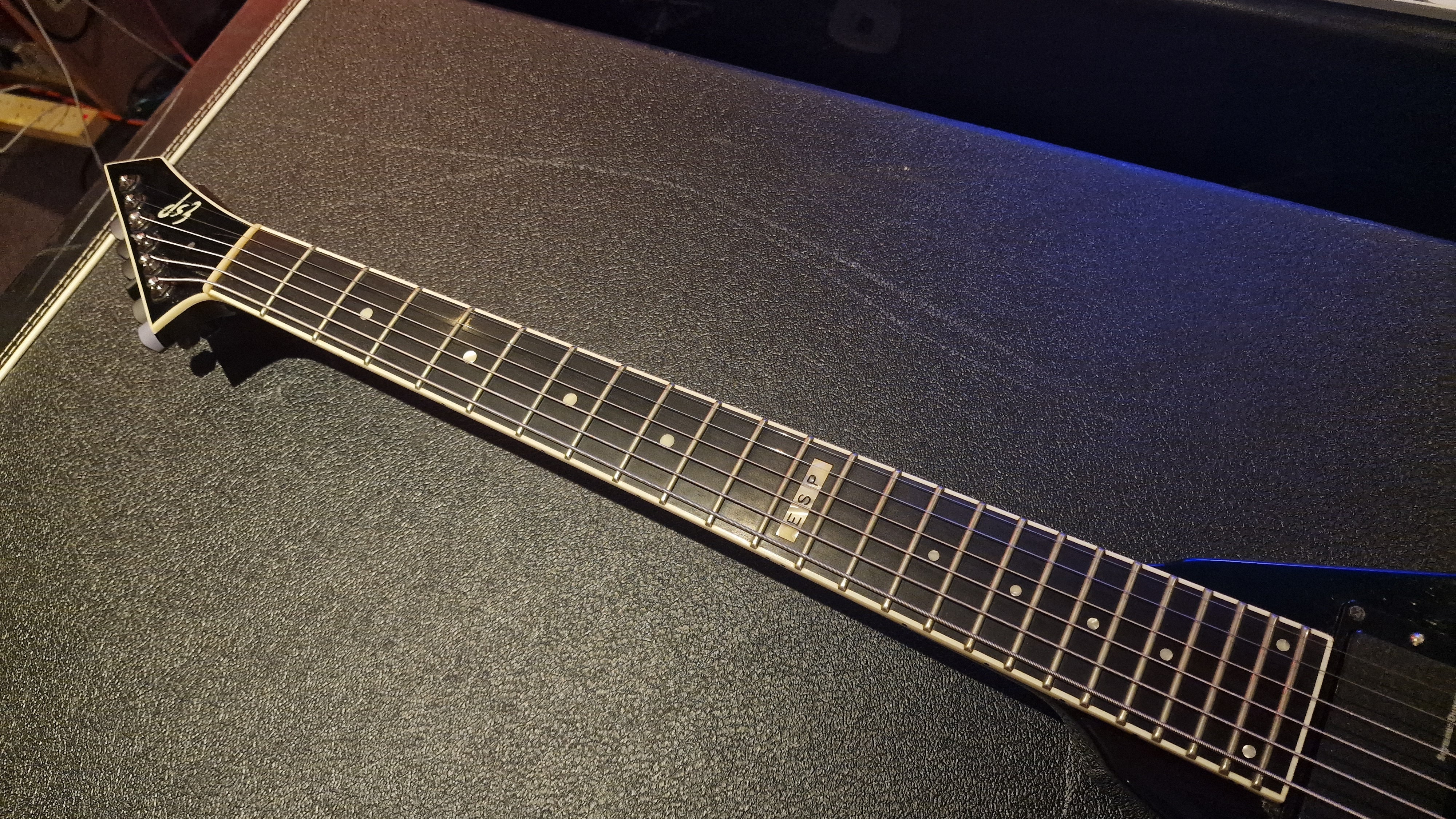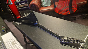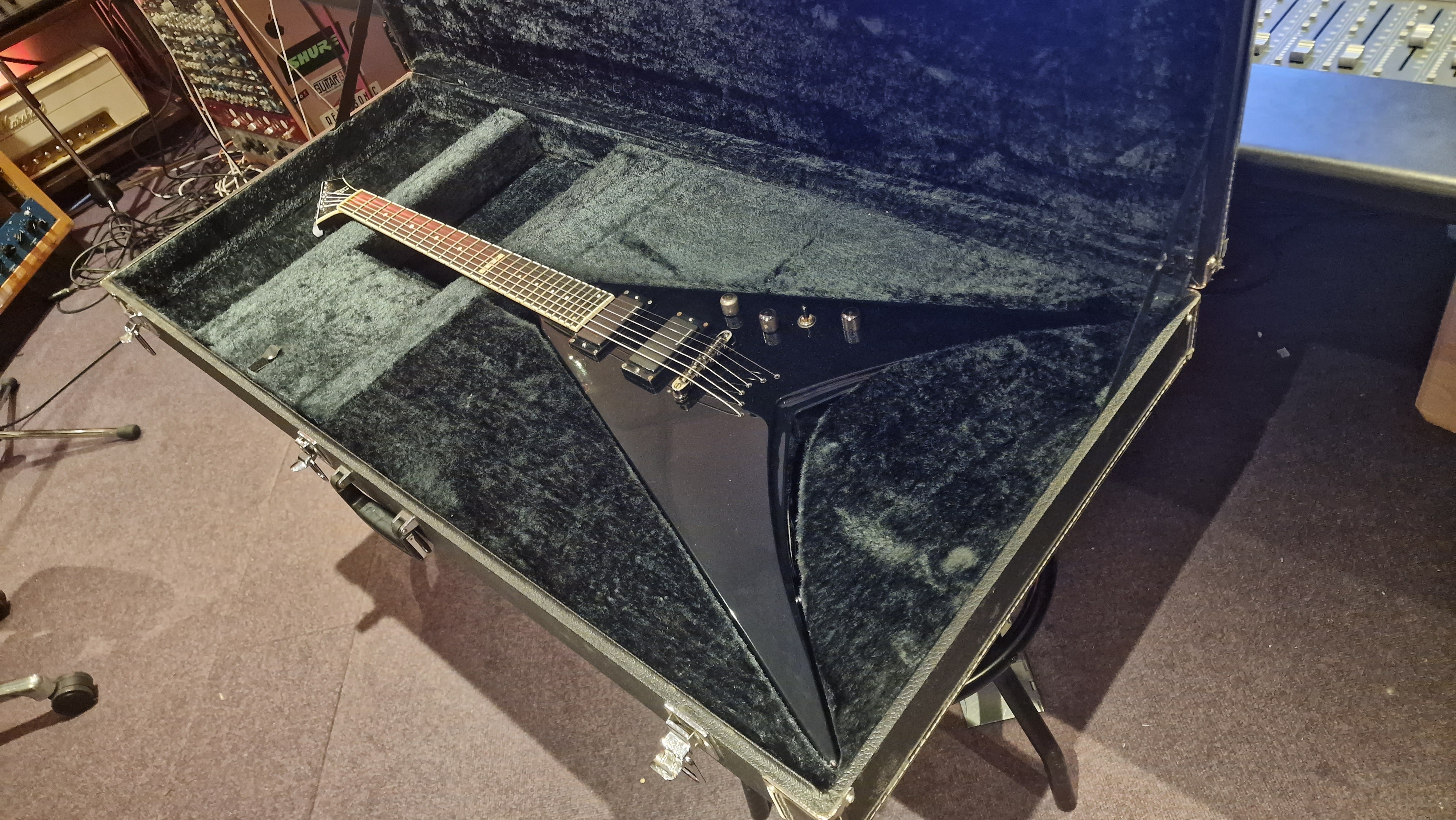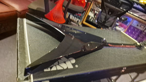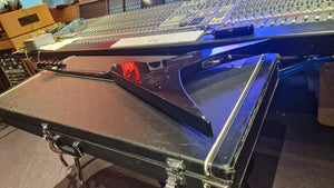 RARE ESP V from Japan. 2006 model year. This special ESP V was created at a time when Dave Mustaine of Megadeth was leaving ESP for his partnership with Dean Guitars after Dave took exception to the way ESP's USA team was marketing his name. As ESP could no longer make the DV8 with Dave's name, it then created this ESP V for the last run. Very rare "ESP" logo on the headstock. It features Sperzel USA locking tuners and Seymour Duncan blackout pickups with string-through body. The guitar is a dream to play. This is the only one we have ever been able to get our hands on, and we don't expect to ever find another. When it's gone, it's gone.