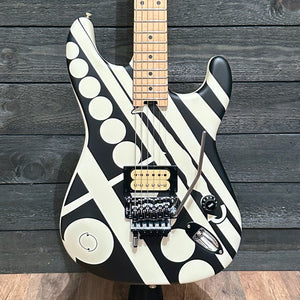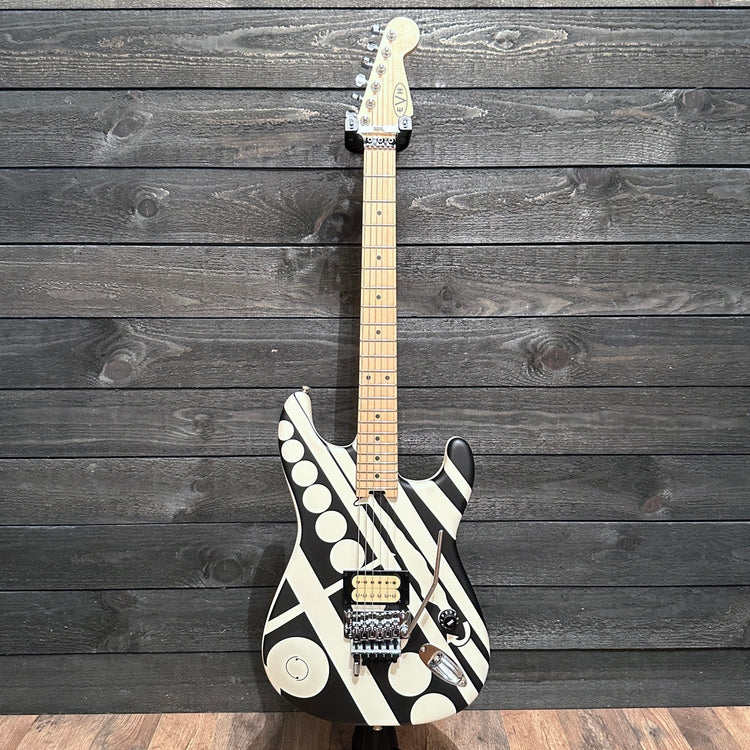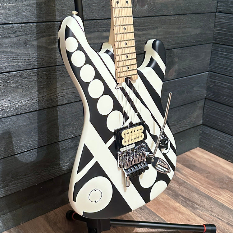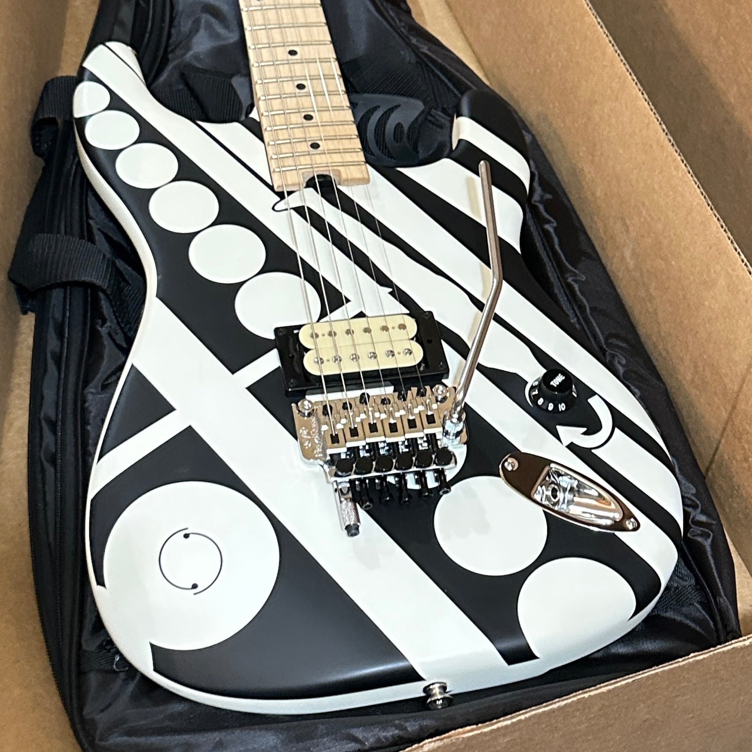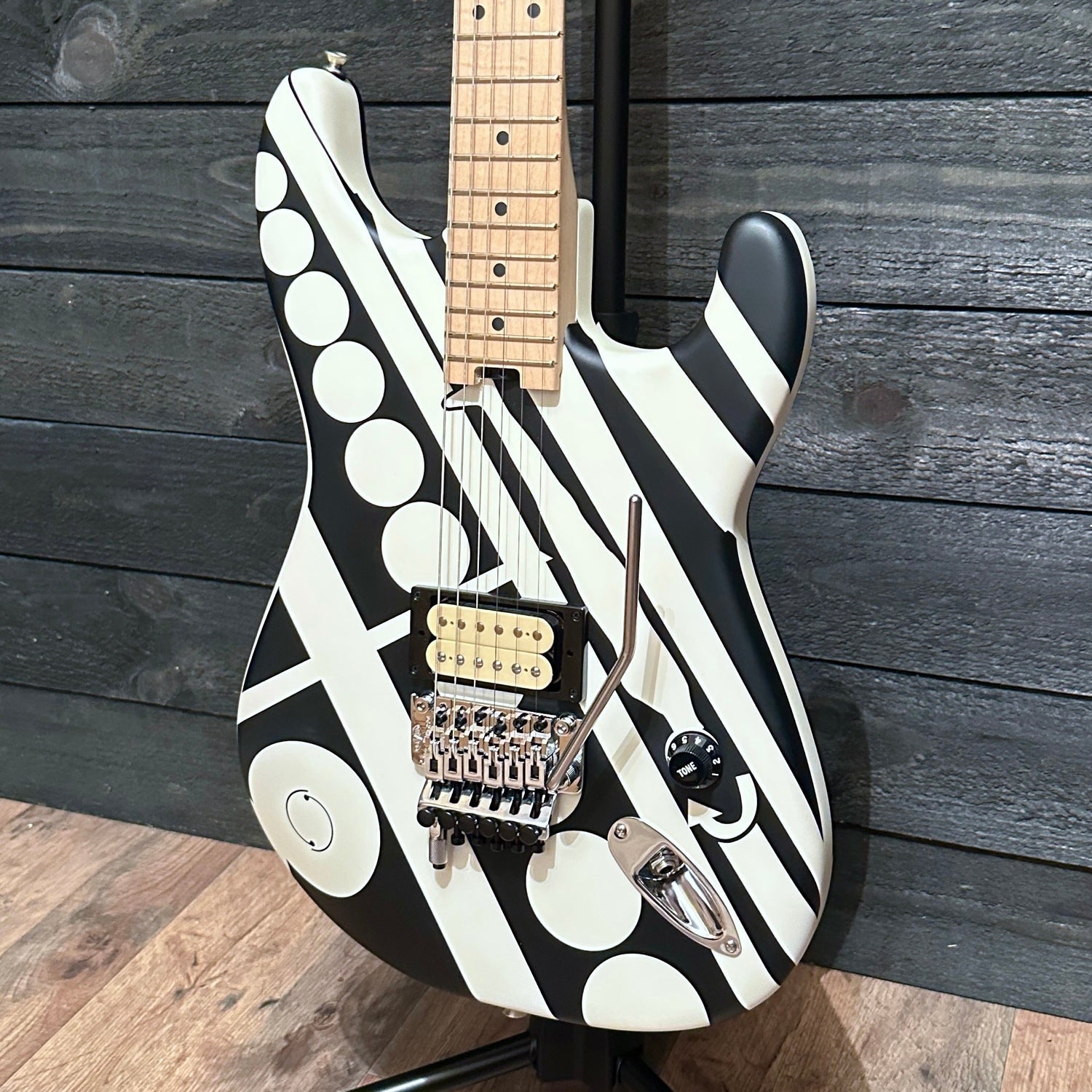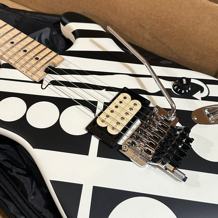 With an otherworldly black-and-white "crop circles" graphic satin finish, the EVH Circles model is without question one of the most distinctively eye-catching guitars in the Striped Series lineup. There's nothing alien about the rest of this high-performance tone machine, though, with its sleek Strat®-like basswood body, rock-solid quartersawn maple neck with oiled finish, fast and smooth compound-radius maple fingerboard (12"-16") with comfortably rolled edges and 22 jumbo frets, a single ferocious EVH direct-mount pickup with single black plastic control knob (master volume), EVH Floyd Rose® bridge and locking nut, and EVH tuners. EVH Striped Series gig bag, included!