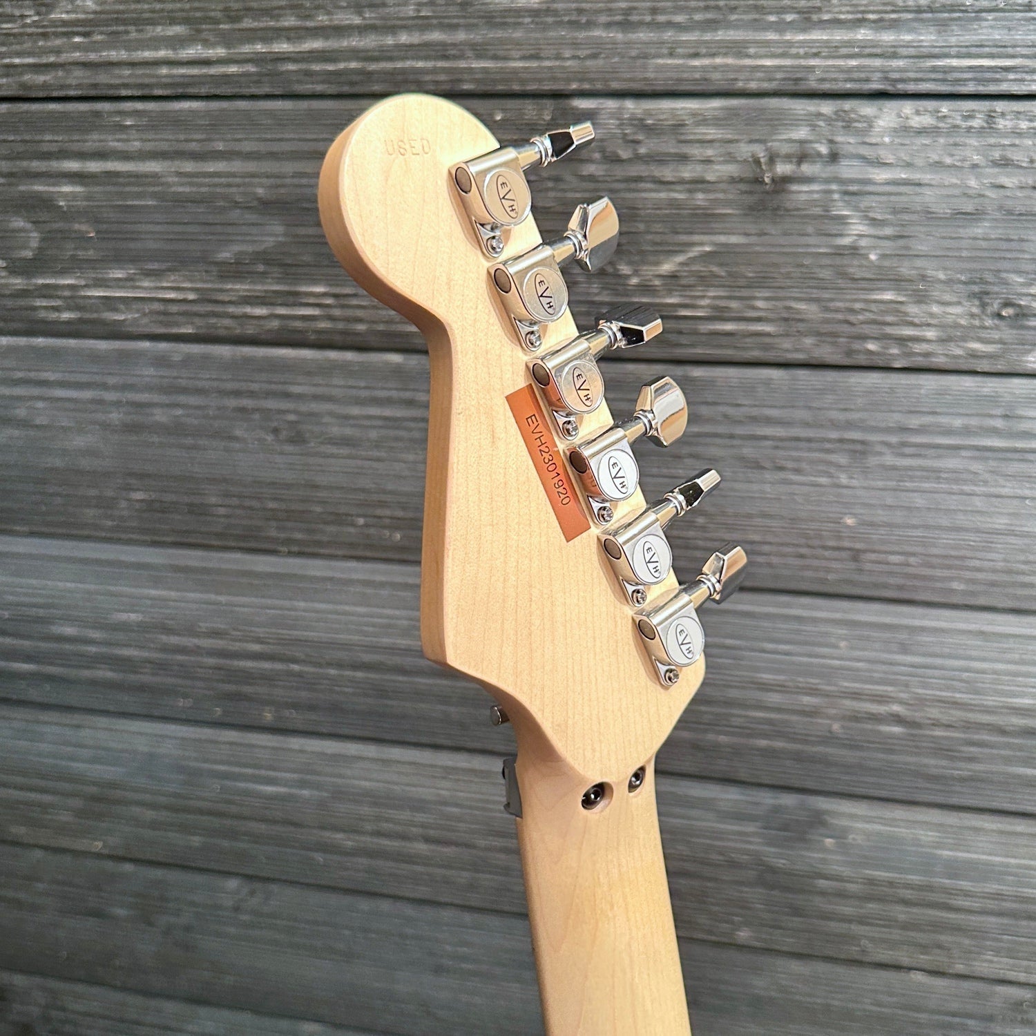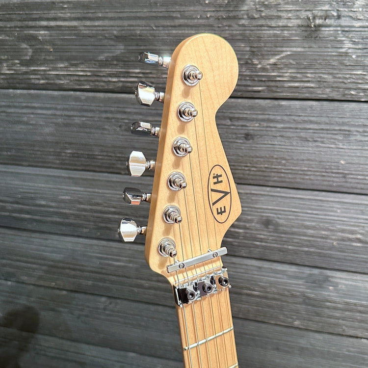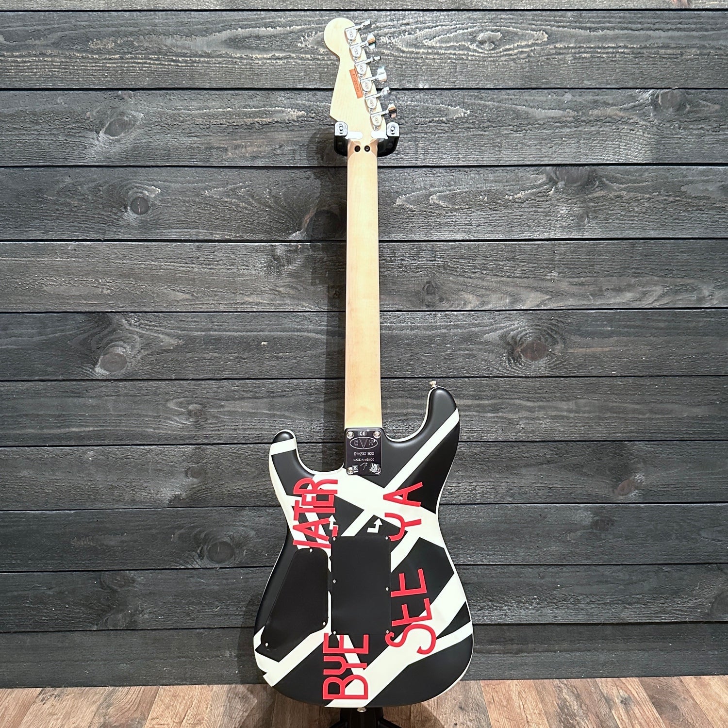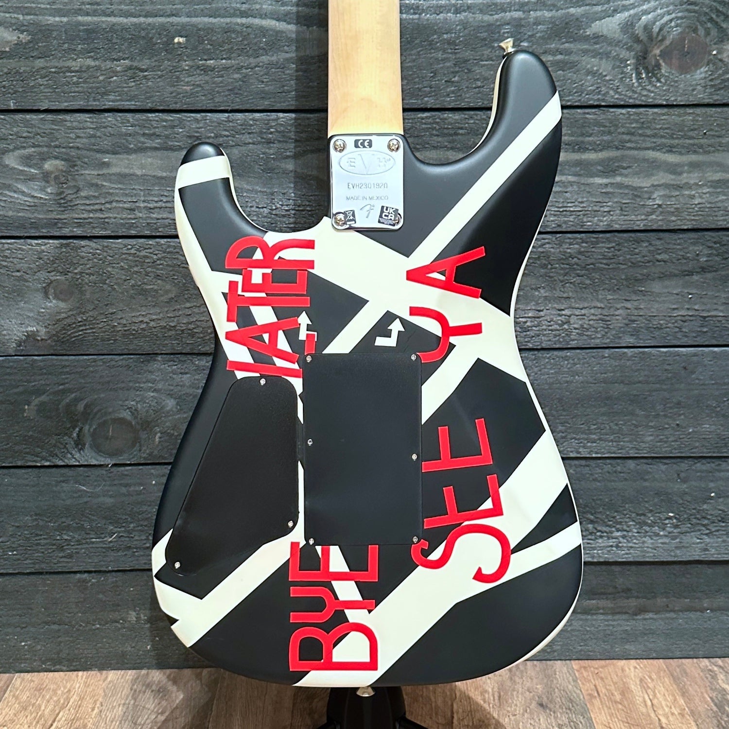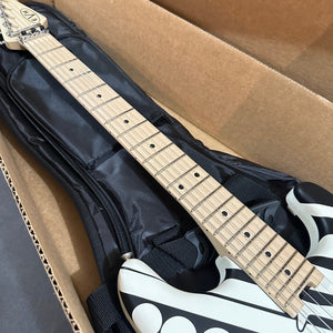 With an otherworldly black-and-white "crop circles" graphic satin finish, the EVH Circles model is without question one of the most distinctively eye-catching guitars in the Striped Series lineup. There's nothing alien about the rest of this high-performance tone machine, though, with its sleek Strat®-like basswood body, rock-solid quartersawn maple neck with oiled finish, fast and smooth compound-radius maple fingerboard (12"-16") with comfortably rolled edges and 22 jumbo frets, a single ferocious EVH direct-mount pickup with single black plastic control knob (master volume), EVH Floyd Rose® bridge and locking nut, and EVH tuners. EVH Striped Series gig bag, included!