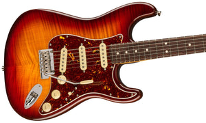 Take your playing to new heights with the 70th Anniversary American Professional II Stratocaster. The alder body, stunning flame maple top and Comet Burst finish exude elegance and class. Equipped with 70th Anniversary V-Mod II Single-Coil Strat pickups, this guitar delivers dynamic and expressive tones. The Deep ""C"" neck features smooth rolled fingerboard edges, ""Super-Natural"" satin finish and sculpted neck heel for a supremely comfortable feel and easy access to the upper register. An upgraded 2-point tremolo with a cold-rolled steel block increases sustain, clarity and high-end sparkle. Deluxe locking tuners ensure exceptional tuning stability. The American Pro II Stratocaster delivers instant familiarity and sonic versatility you'll feel and hear right away, with broad ranging appointments that add up to nothing less than a new standard for professional instruments. The Inca Silver ABS molded case provides reliable protection for your prized instrument.