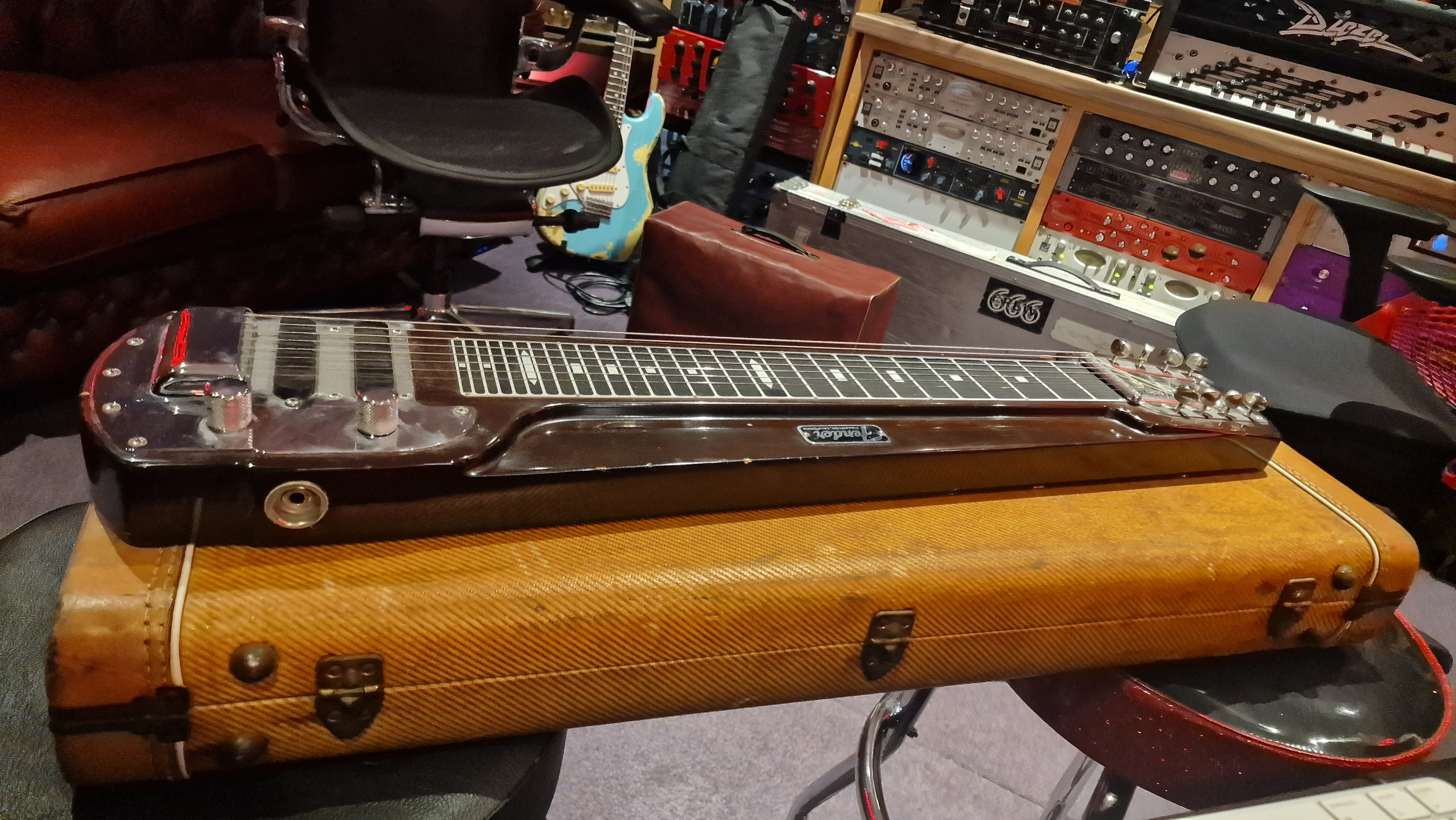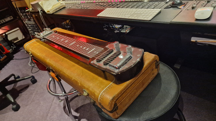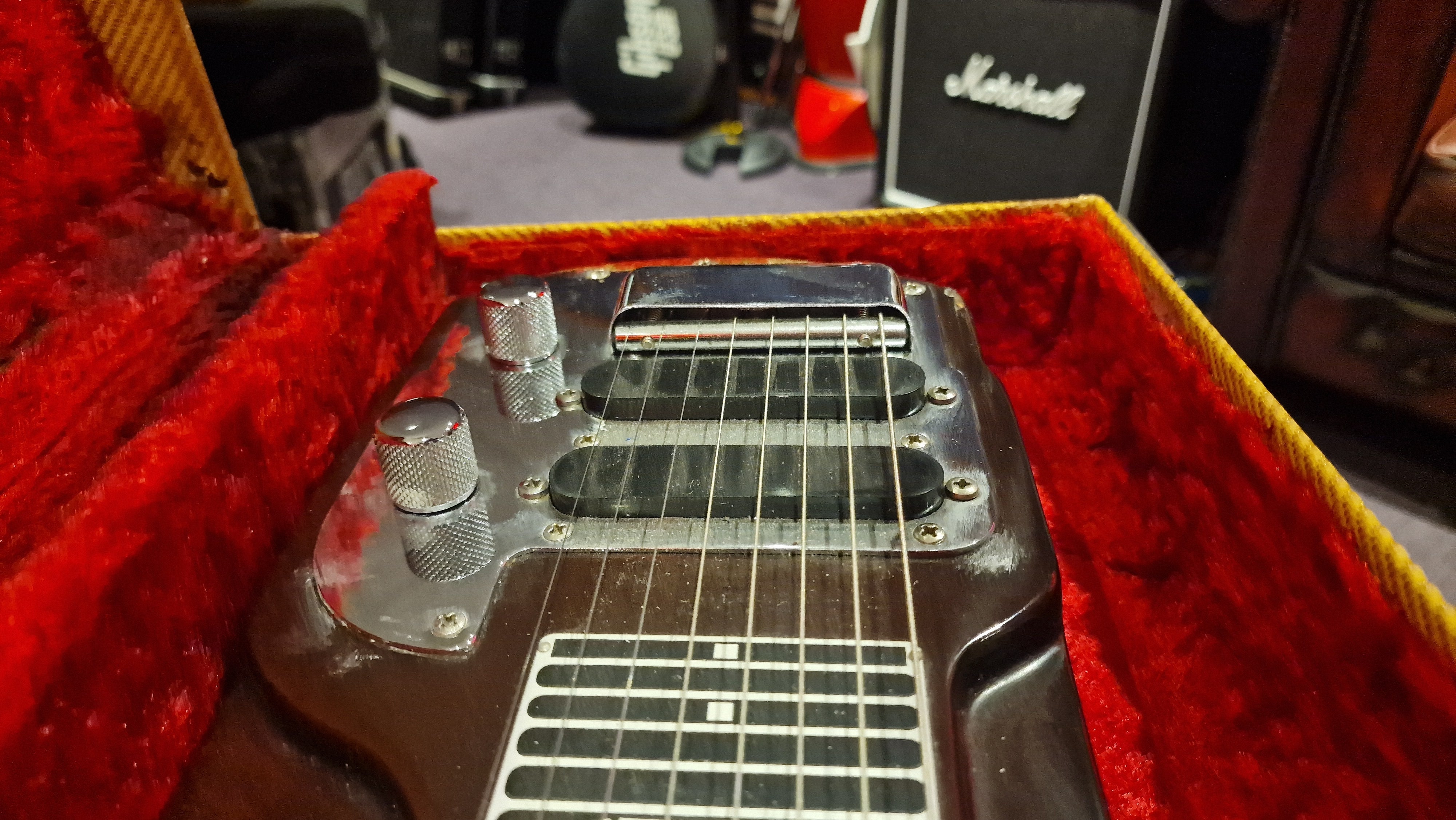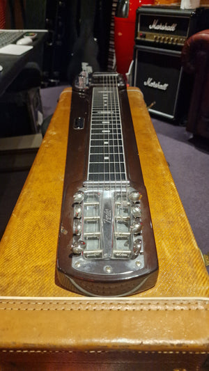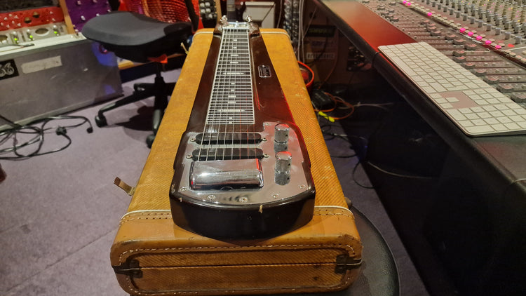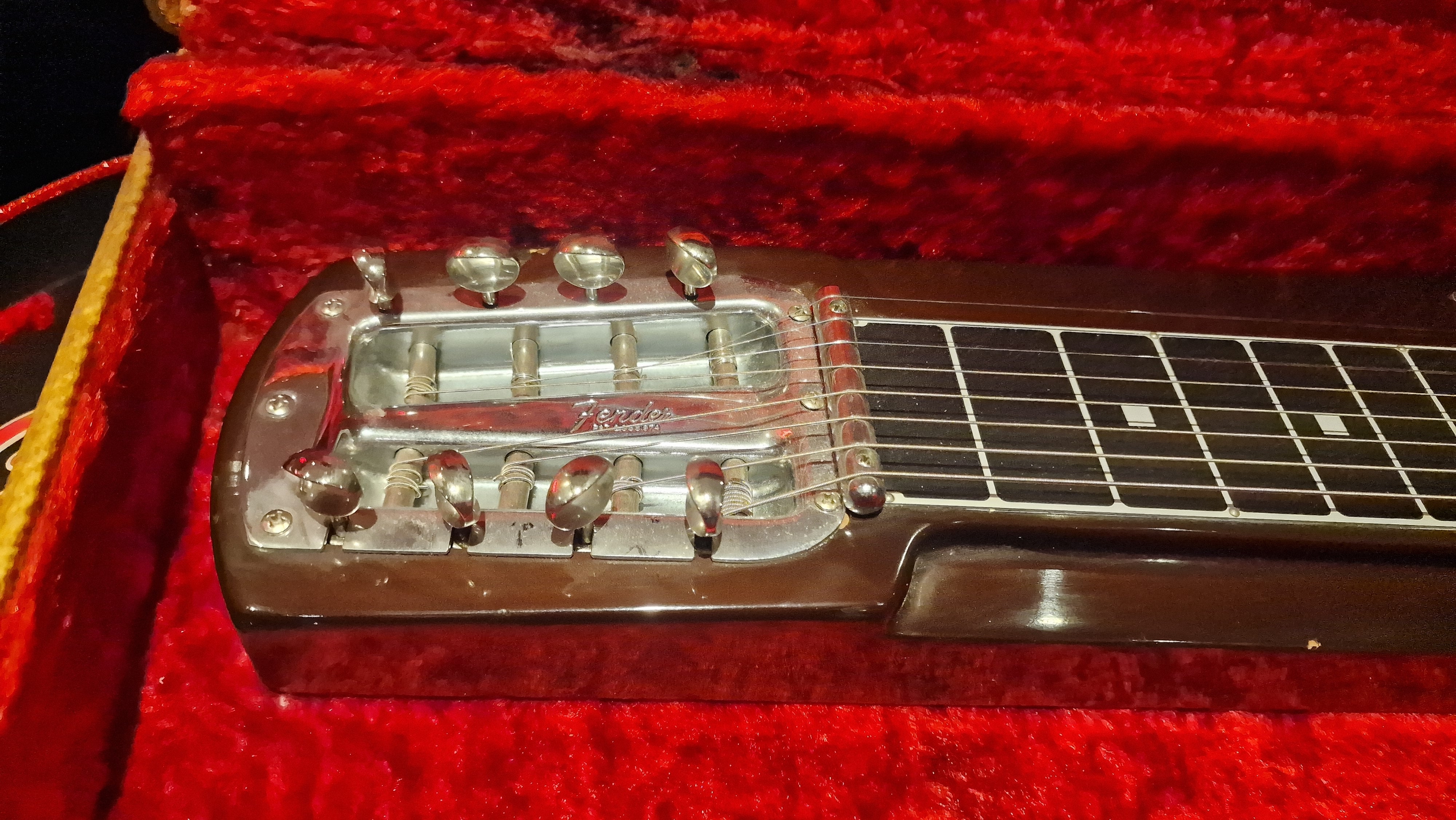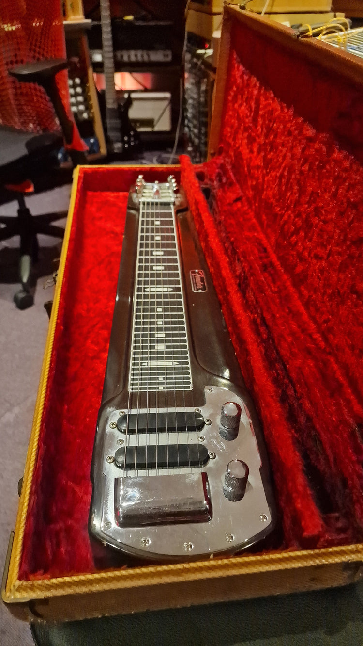 Fender Deluxe 6 Stringmaster Vintage Lap Steel Six String Electric Guitar with suitcase. This is a clean example and highly resonant. There are no legs included, but you can easily source replacements if you prefer to play standing and don't want to place it on a simple table top (more secure). We have several vintage Fender lap steels in our shop, so have a look.