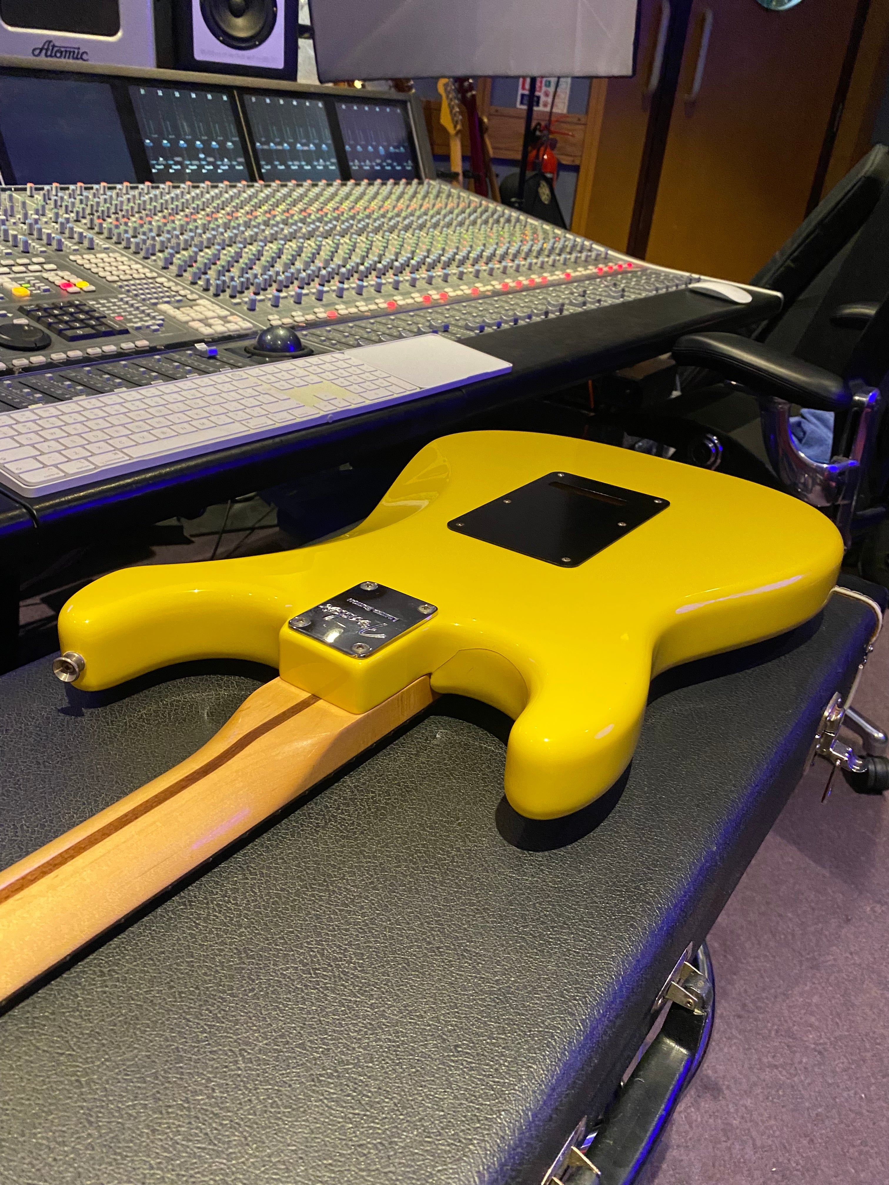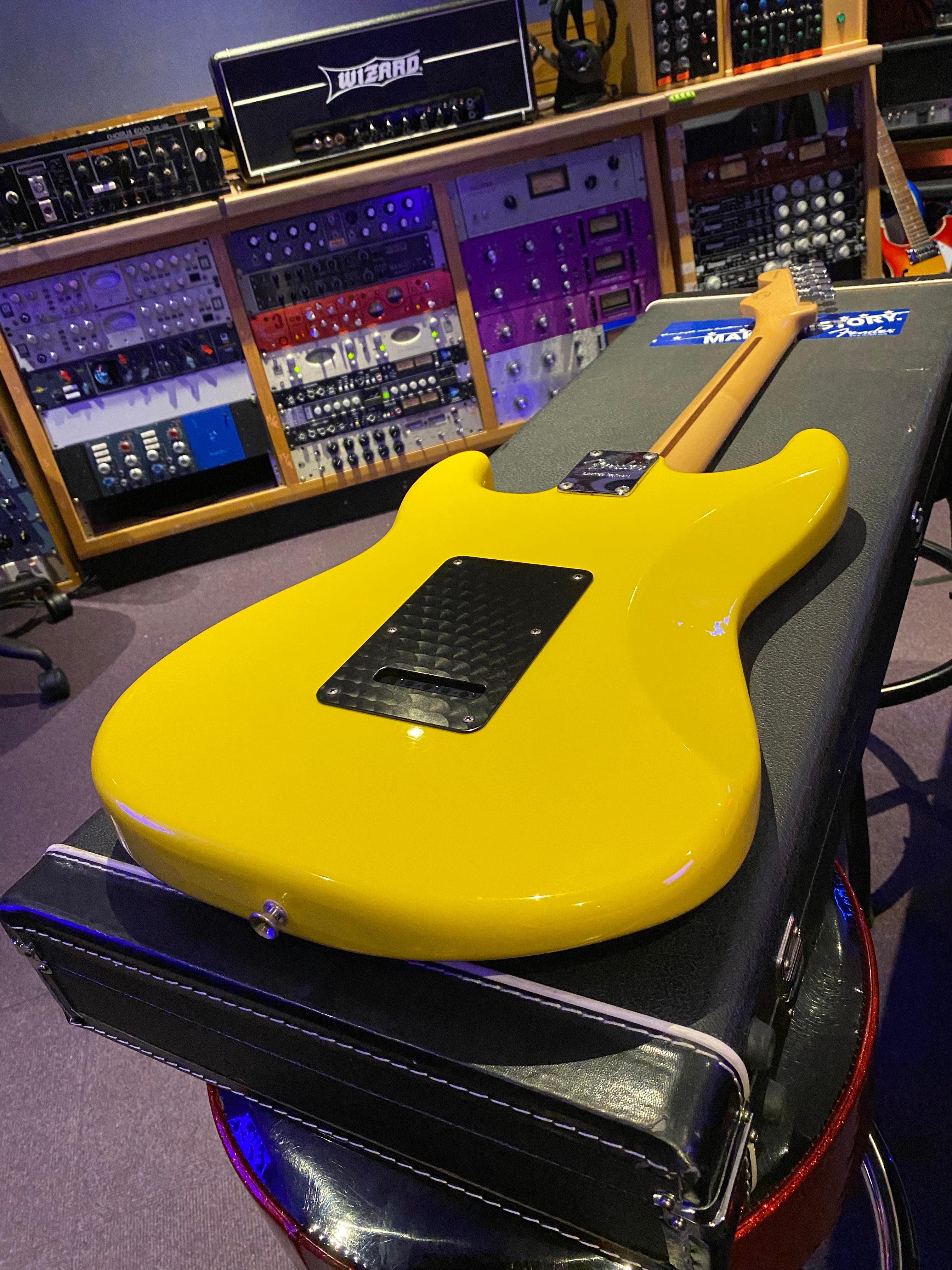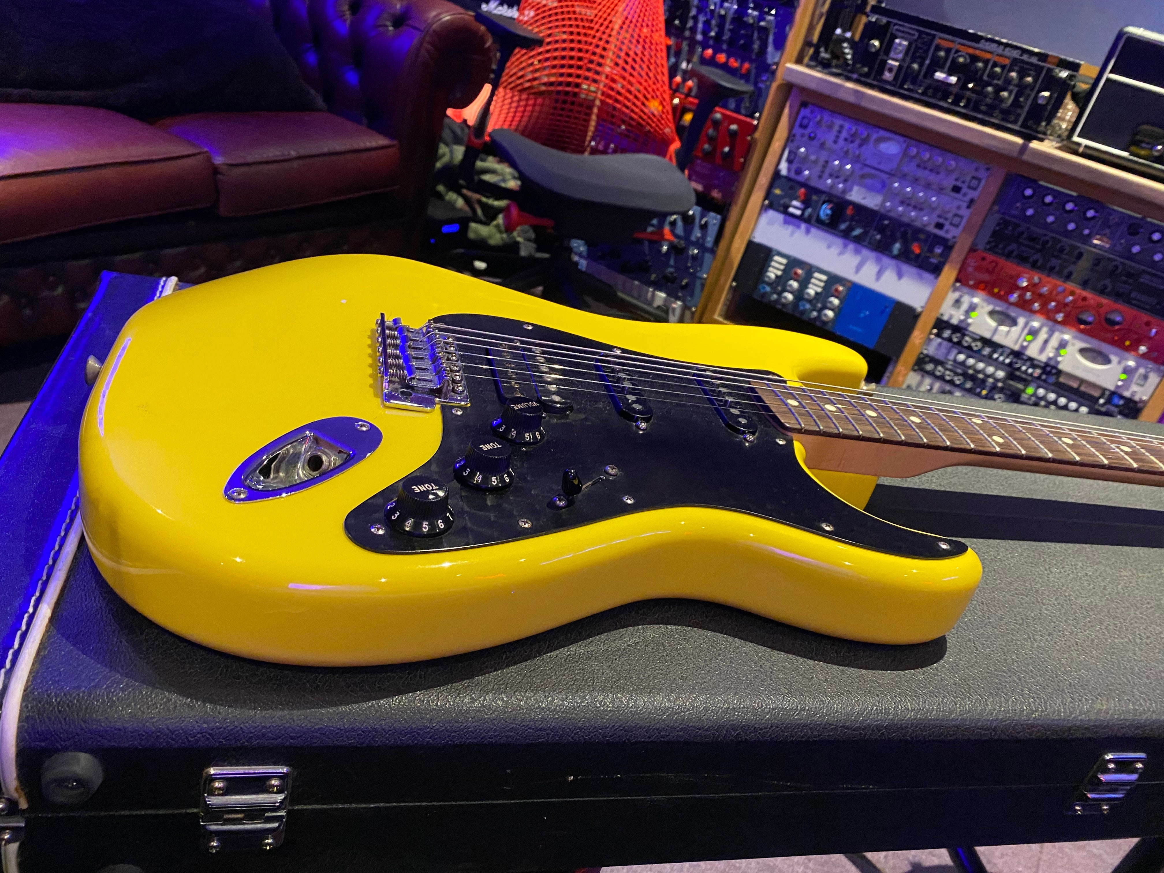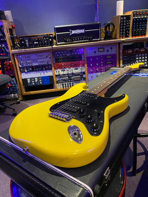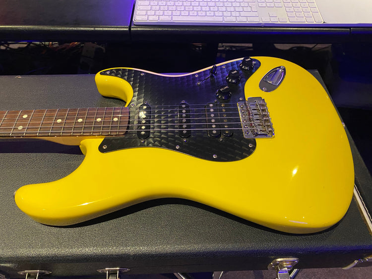 RARE 2005 Fender Standard Stratocaster "Fat Strat" HSS Special Limited Edition 1 of 100 Graffiti Yellow guitars with very unique features. From 2004 to 2006, Fender did a few special edition runs of HSS strats limited to 250 pieces, but they did only one "LIMITED EDITION" of 100 pieces that received the very best upgrades and appointments, and that run was exclusively what you see here: Graffiti Yellow with matching headstock, American Standard HSS pickups, black engine-turned pickguard and rear cover, black plastics, "Special Edition" stamp on back of headstock and "LIMITED EDITION" engraved on the neck plate. This is the only one we have ever been able to find. If you want something sleek that catches peoples eyes on stage but also sounds incredible in the studio, this is your next guitar.