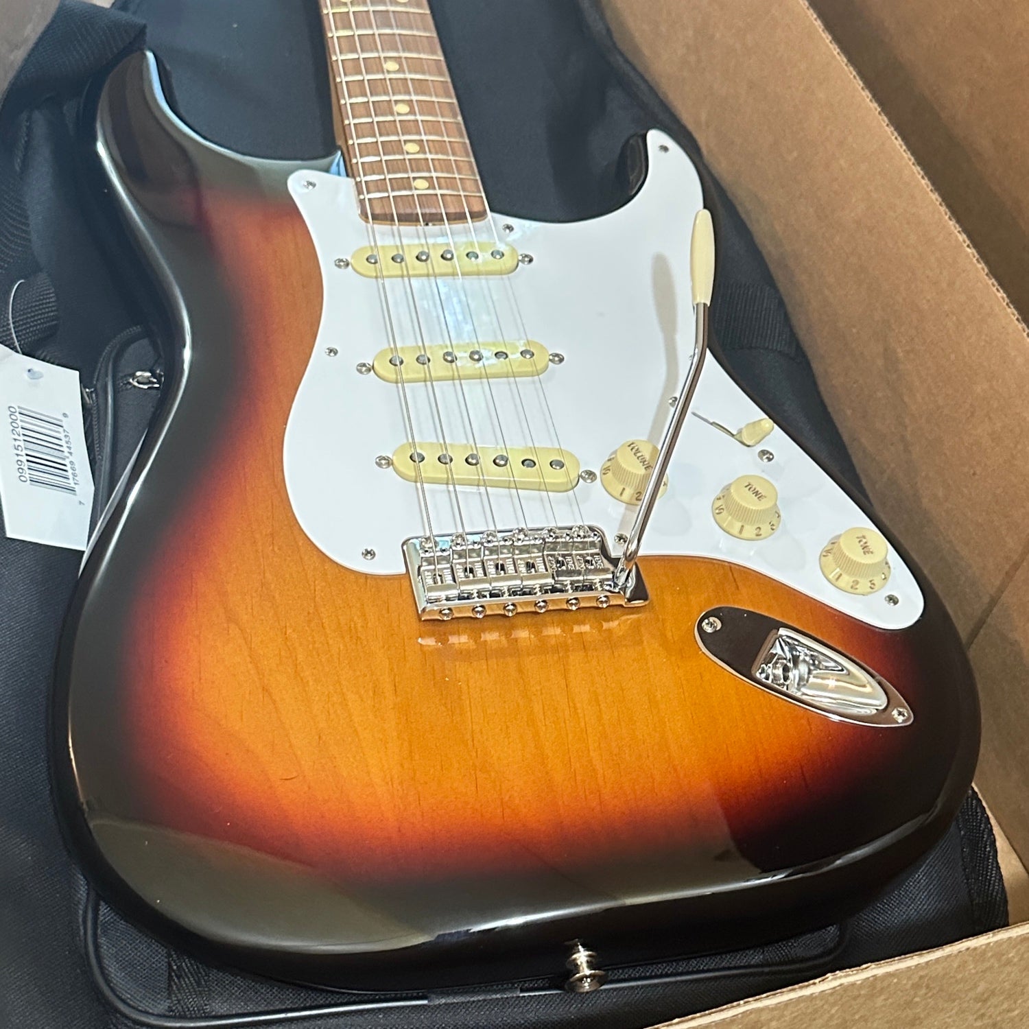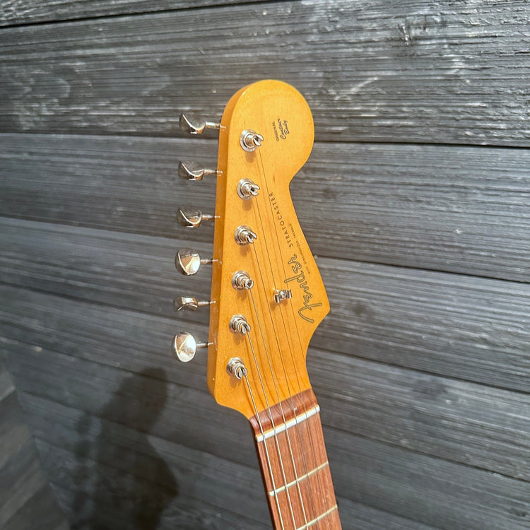 For authentic, vintage-style tone we recreated the trio of single-coil Stratocaster pickups to sound more like the originals. Crystalline and bell-like, they have the crisp, articulate tone that put Fender on the map. The "Mid '60s C"-shaped neck has a 7.25"-radius fingerboard with 21 vintage-style frets for classic playing feel. A vintage-style, six-point synchronized tremolo and vintage-style tuning machines offer original-era aesthetics, rock-solid performance and tuning stability. Other features include vintage-style strap buttons, chrome hardware and four-bolt neck plate. Includes a deluxe gig bag.