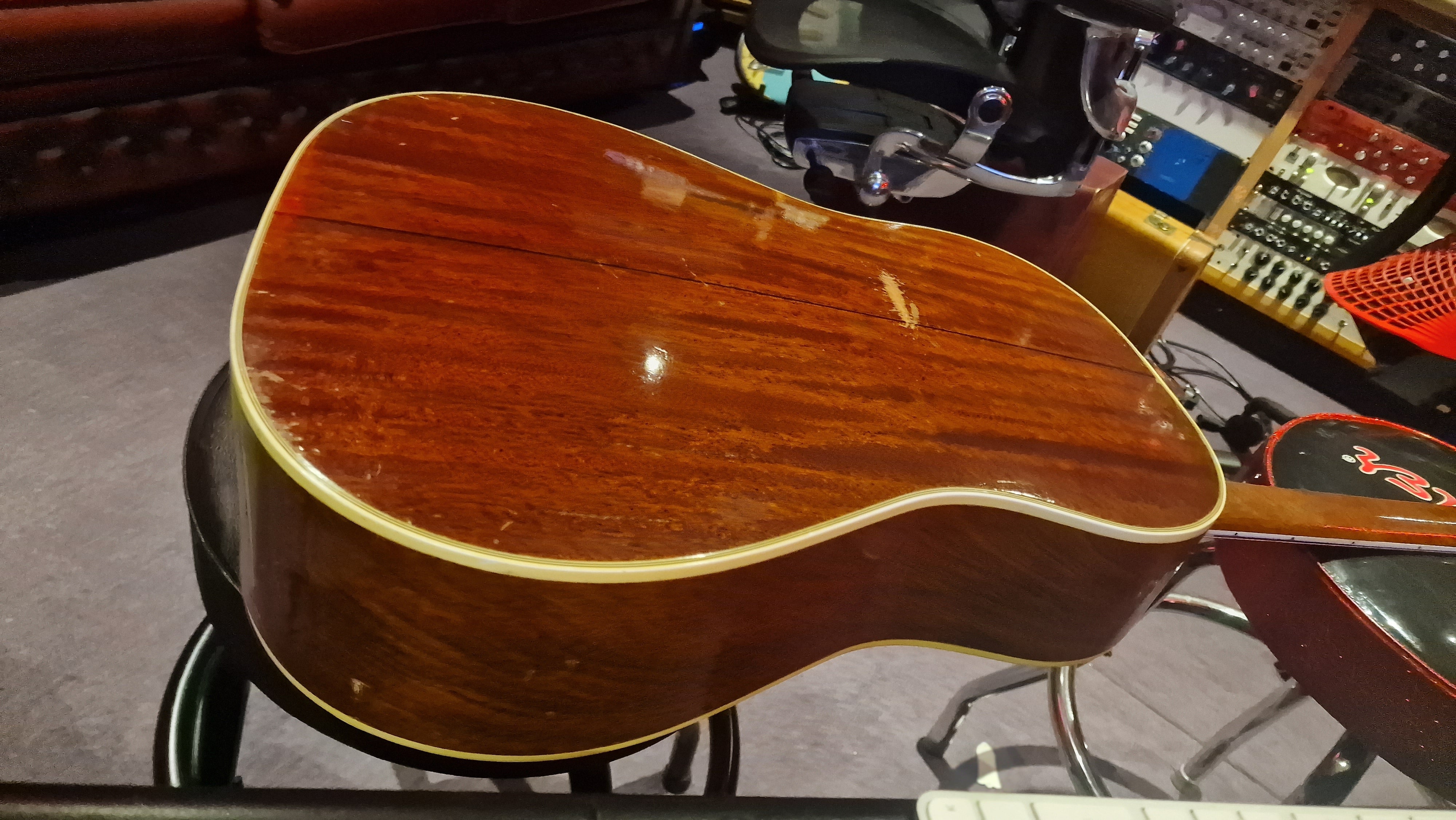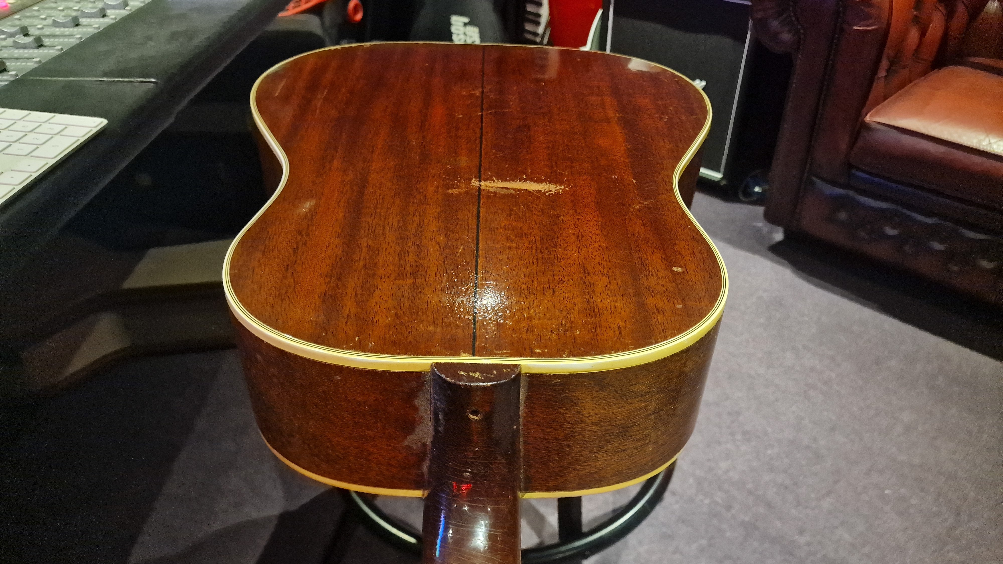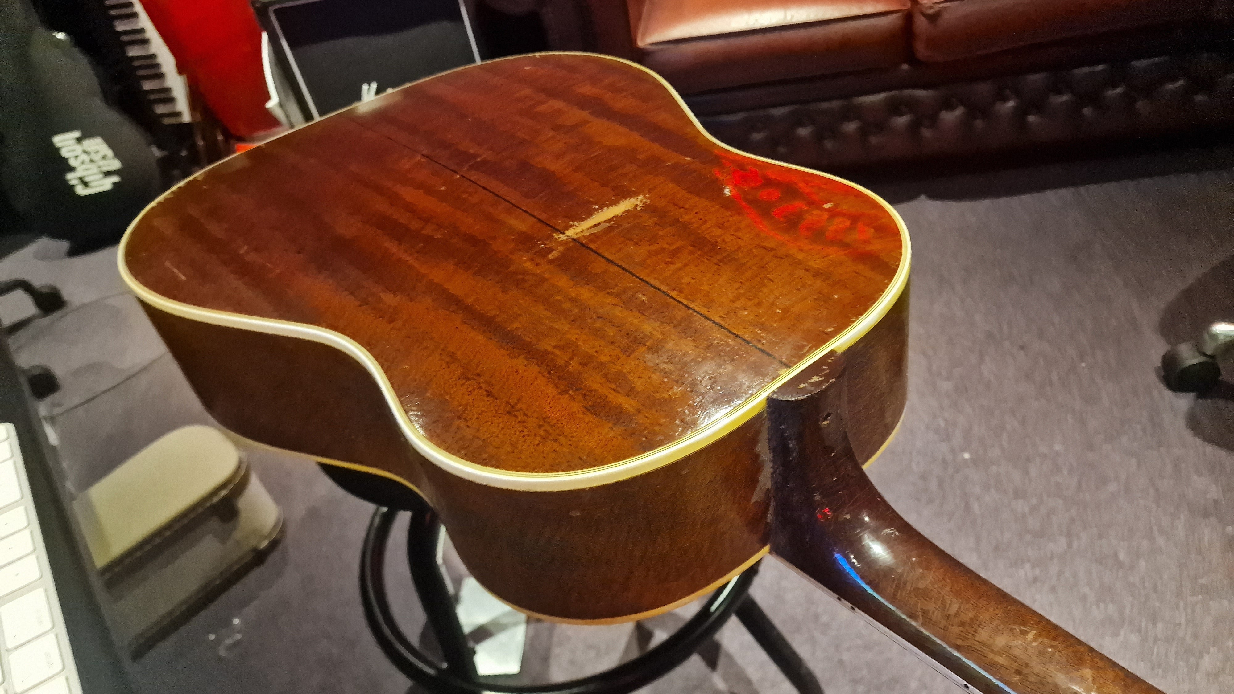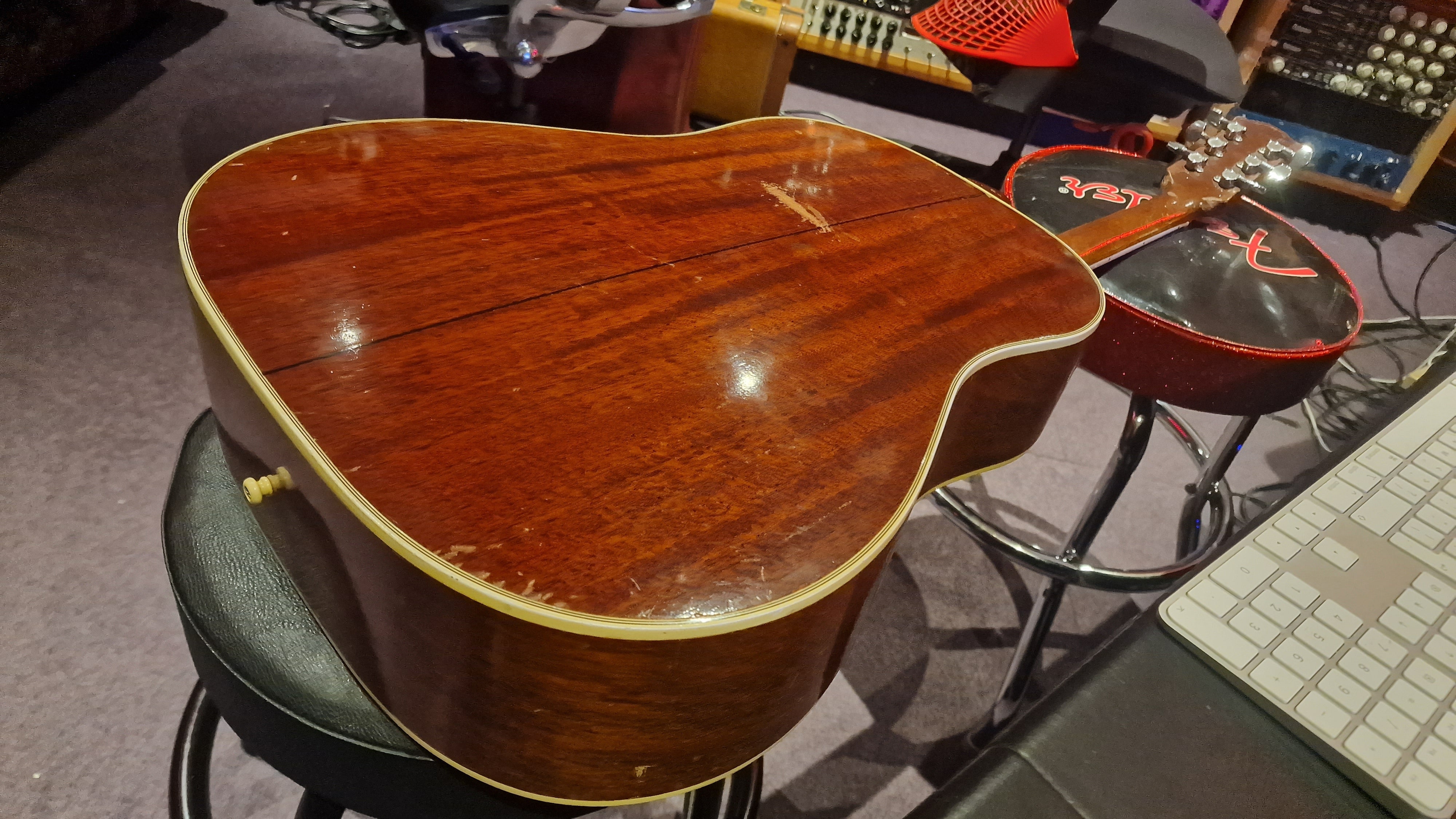 During a tour with Del Shannon (#1 global hit song Runaway) and Bobby Vee (#1 global hit song Take Good Care of My Baby), the guitar lost a bridge pin. Del gave Mike one of his, which is still present on the guitar to this day. Bobby Vee accidently knocked over a speaker, leaving a hole in the top of the guitar. This was repaired at Andy’s Guitar Workshop, Denmark Street, London, in 1964, by expertly letting in a new strip that can clearly be seen on the guitar's top today after nearly 60 years of aging, although it was barely detectable at the time as seen in the later cover photo with Cat Stevens. Thankfully, Bobby paid!