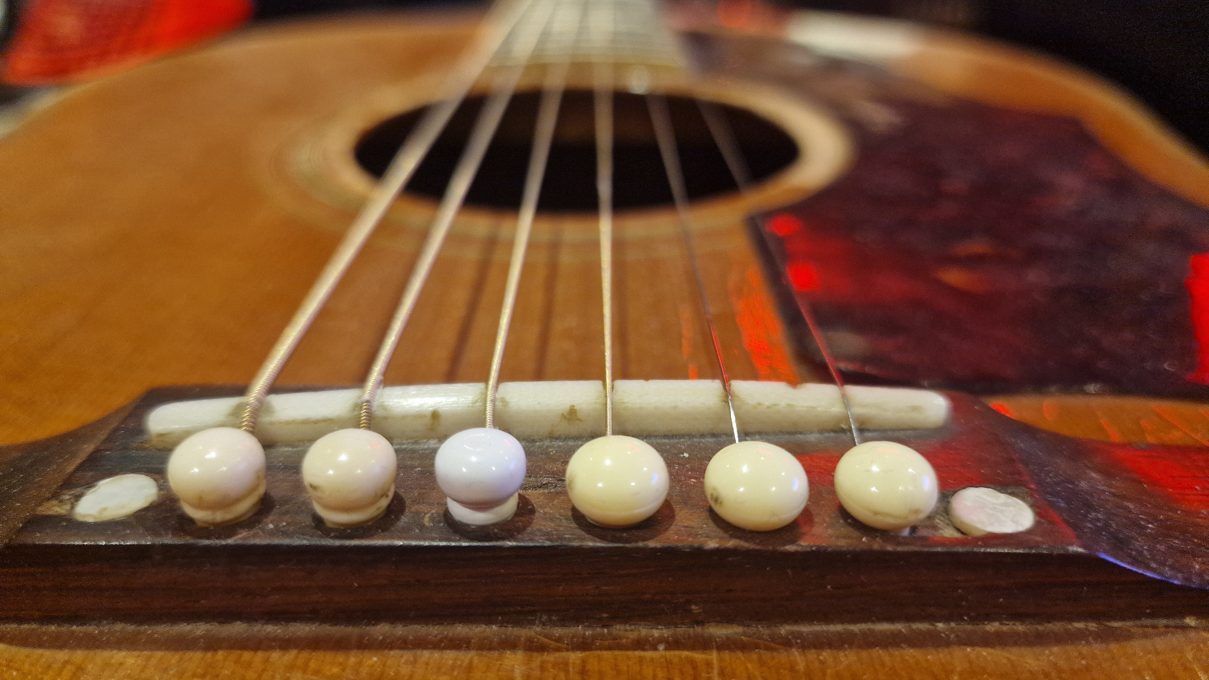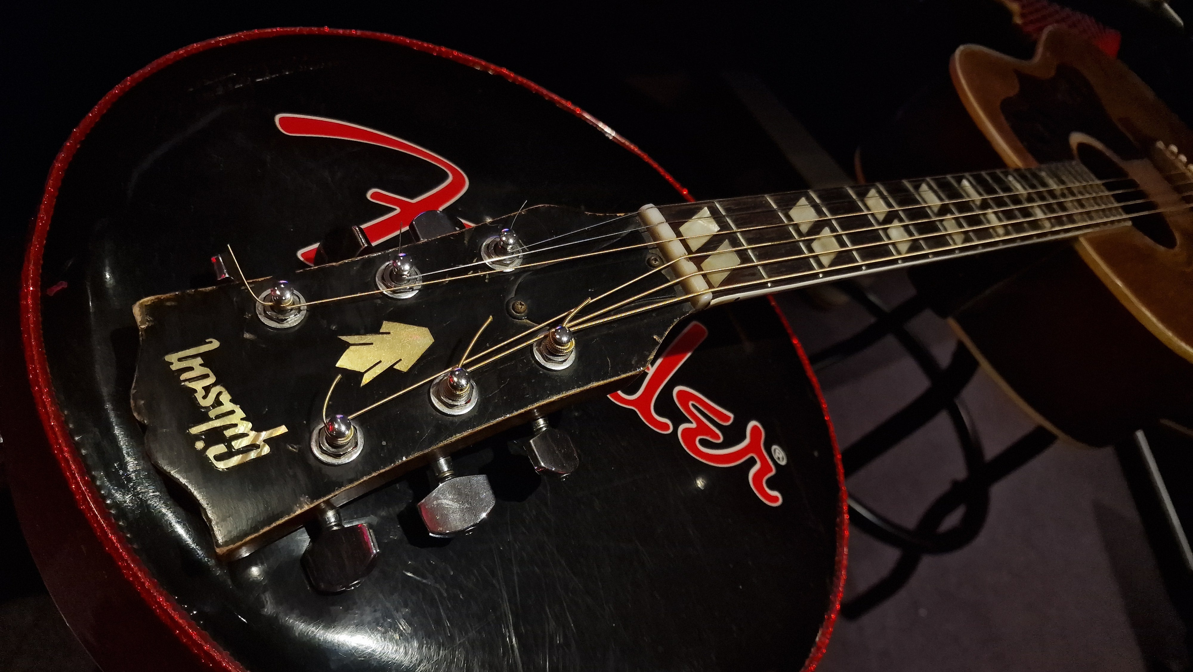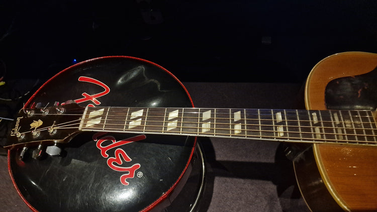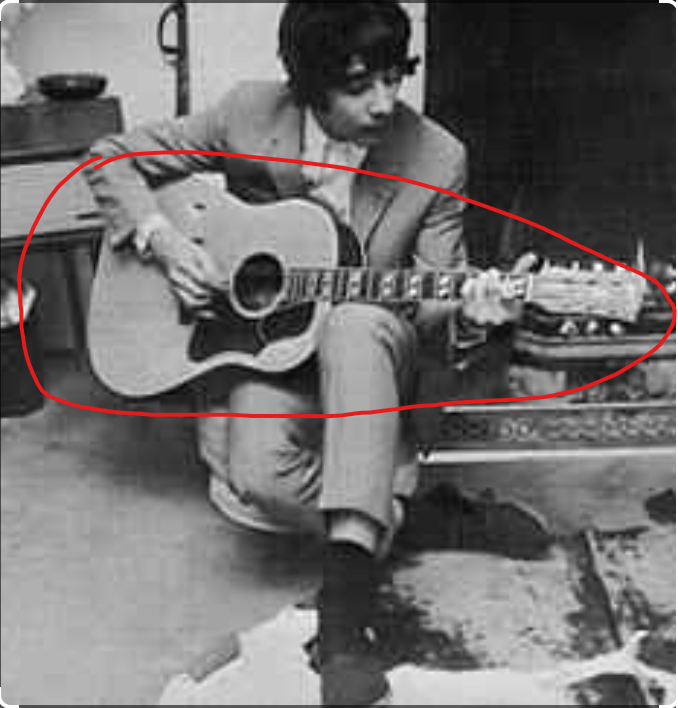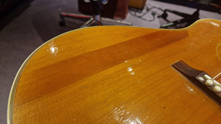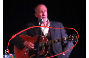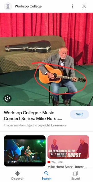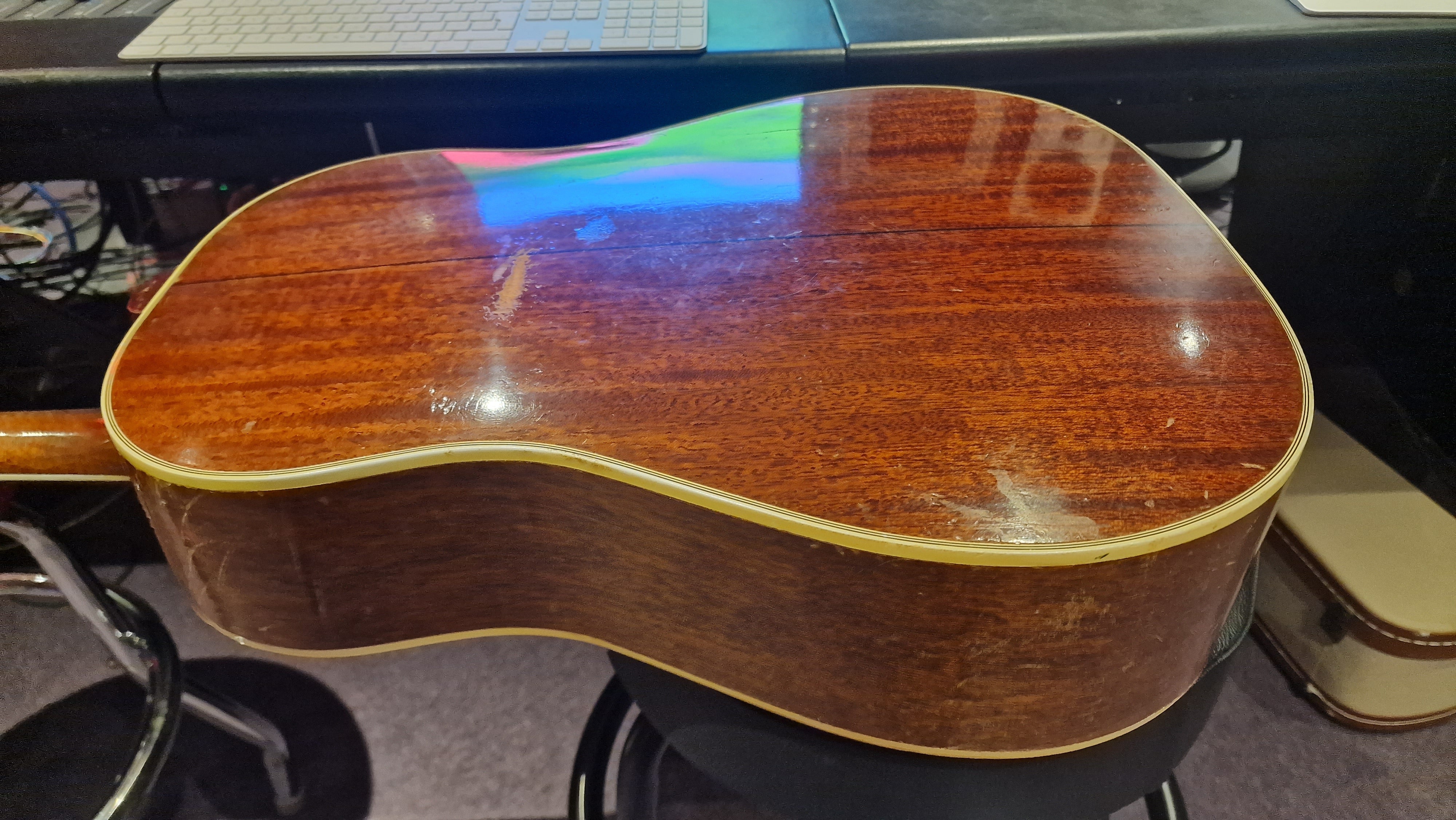 During a tour with Del Shannon (#1 global hit song Runaway) and Bobby Vee (#1 global hit song Take Good Care of My Baby), the guitar lost a bridge pin. Del gave Mike one of his, which is still present on the guitar to this day. Bobby Vee accidently knocked over a speaker, leaving a hole in the top of the guitar. This was repaired at Andy’s Guitar Workshop, Denmark Street, London, in 1964, by expertly letting in a new strip that can clearly be seen on the guitar's top today after nearly 60 years of aging, although it was barely detectable at the time as seen in the later cover photo with Cat Stevens. Thankfully, Bobby paid!