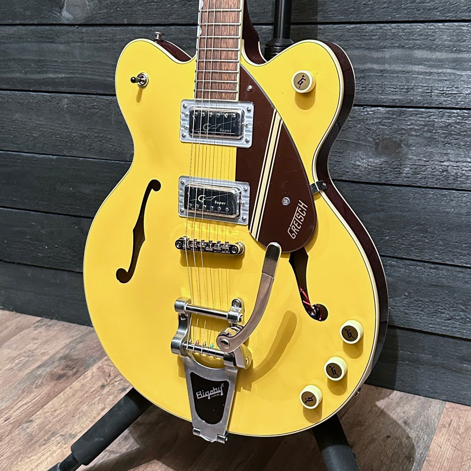 The G2604T's sound is driven by a pair of Super Hilo'Tron™ humbucking pickups that deliver all the clarity and chime players have come to expect from a Gretsch with enhanced presence and higher output than the Hilo'Tron™ pickups of yore.