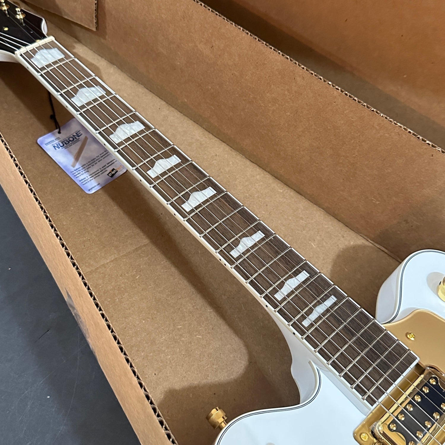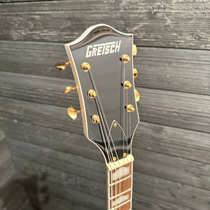 With gold hardware, and bound f-holes, the G5422TG Electromatic hollowbody exudes vintage style. A 12" radius laurel fretboard offers comfortable playability, while open-back tuners provide smooth and accurate tuning. GraphTech NuBone nut and an Adjusto-Matic bridge complete the premium appointments.