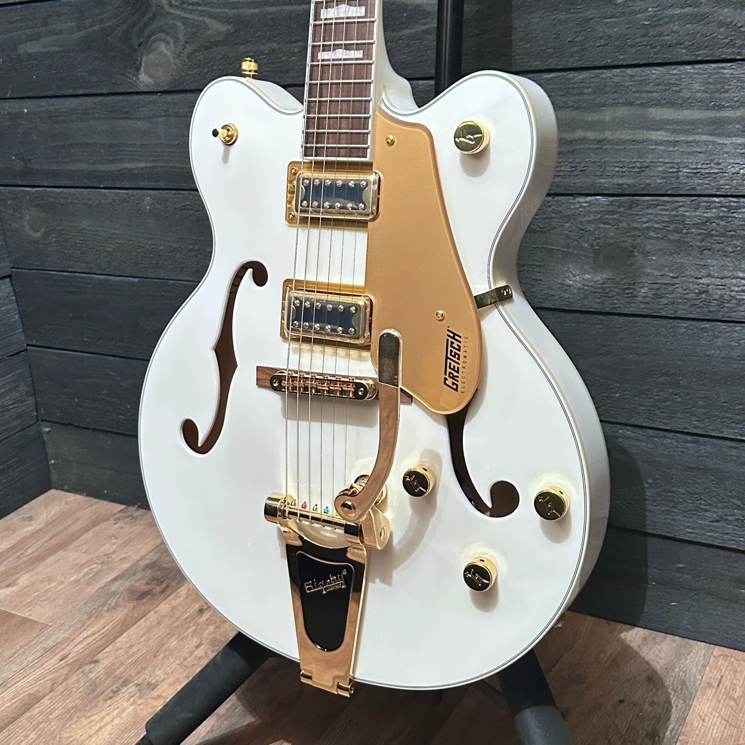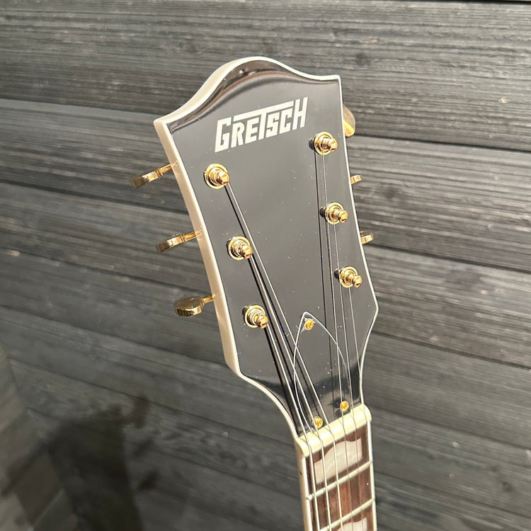 With gold hardware, and bound f-holes, the G5422TG Electromatic hollowbody exudes vintage style. A 12" radius laurel fretboard offers comfortable playability, while open-back tuners provide smooth and accurate tuning. GraphTech NuBone nut and an Adjusto-Matic bridge complete the premium appointments.