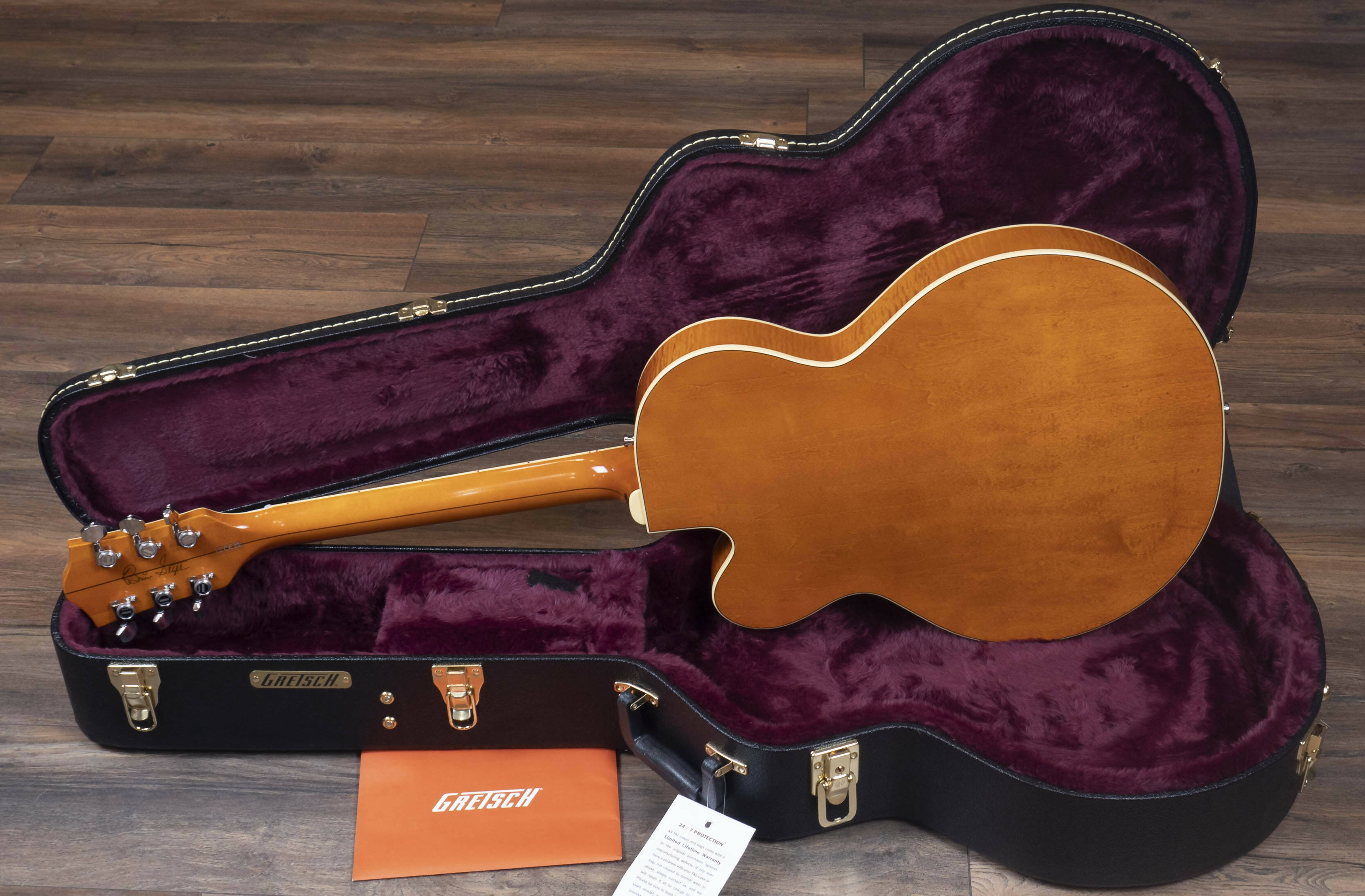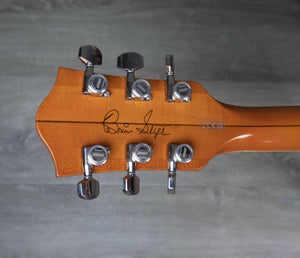Beneath its vintage cloak however, Smoke is a true workhorse with features accumulated over a prolific span of Brian’s career. Stage-veteran specs include a single-cutaway hollow body with arched laminated maple top, 1959 trestle bracing and oversized F-holes for improved sonic projection. The maple neck has a 9.5"-12” compound radius ebony fingerboard and a vintage ‘V’ neck shape for comfortable chording or lightning leads. The rolled fingerboard and body edges couple with the semi-gloss finish to create an unparalleled broken-in feel found only in the prized G6120s from the 1950s.