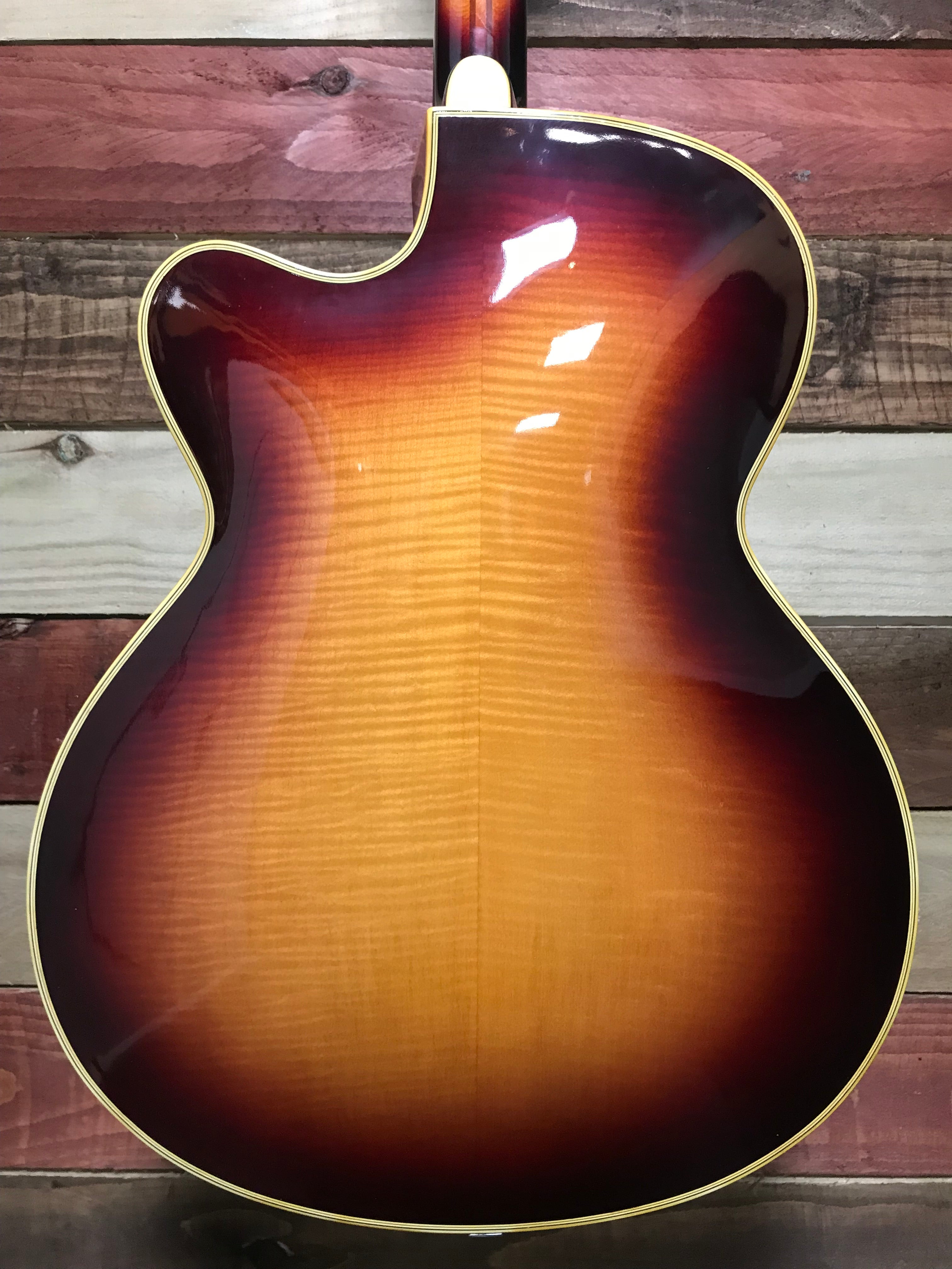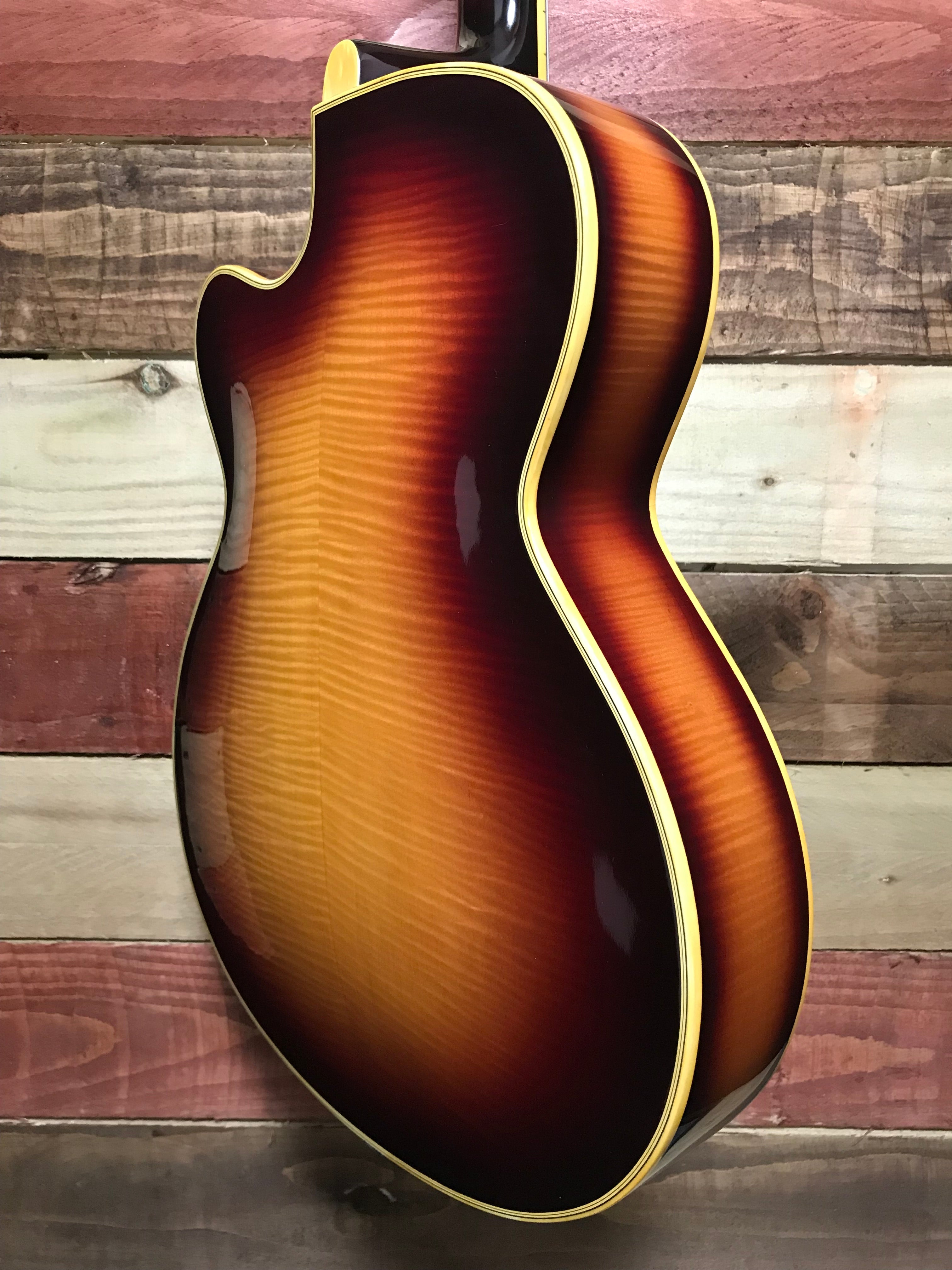 Built to a very high standard, carved Spruce top and figured flame Maple back and sides and with 2Black Bar" pickups.