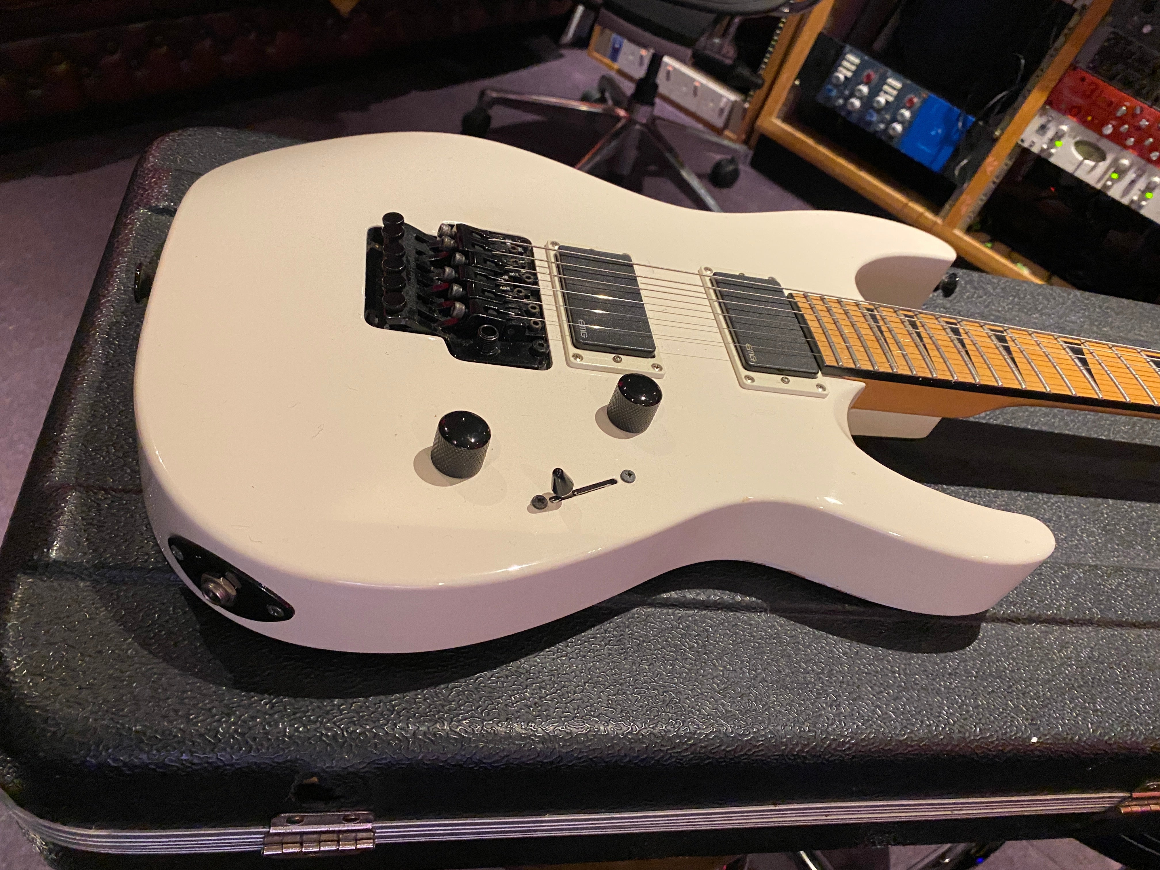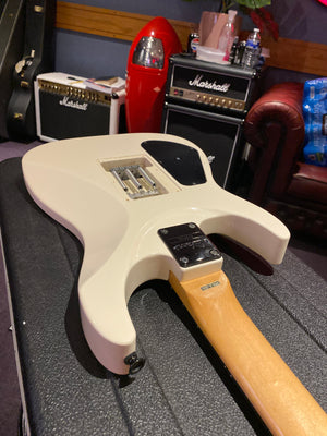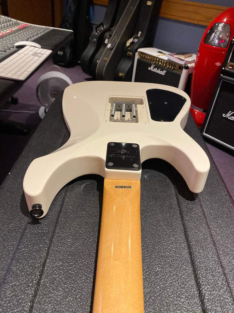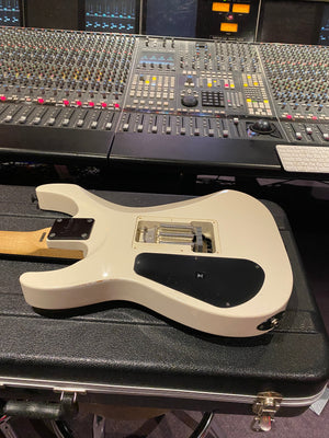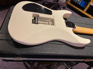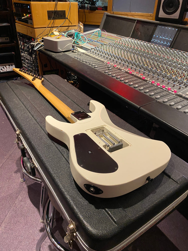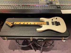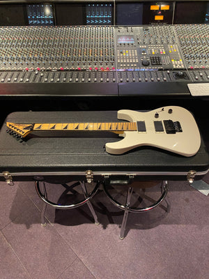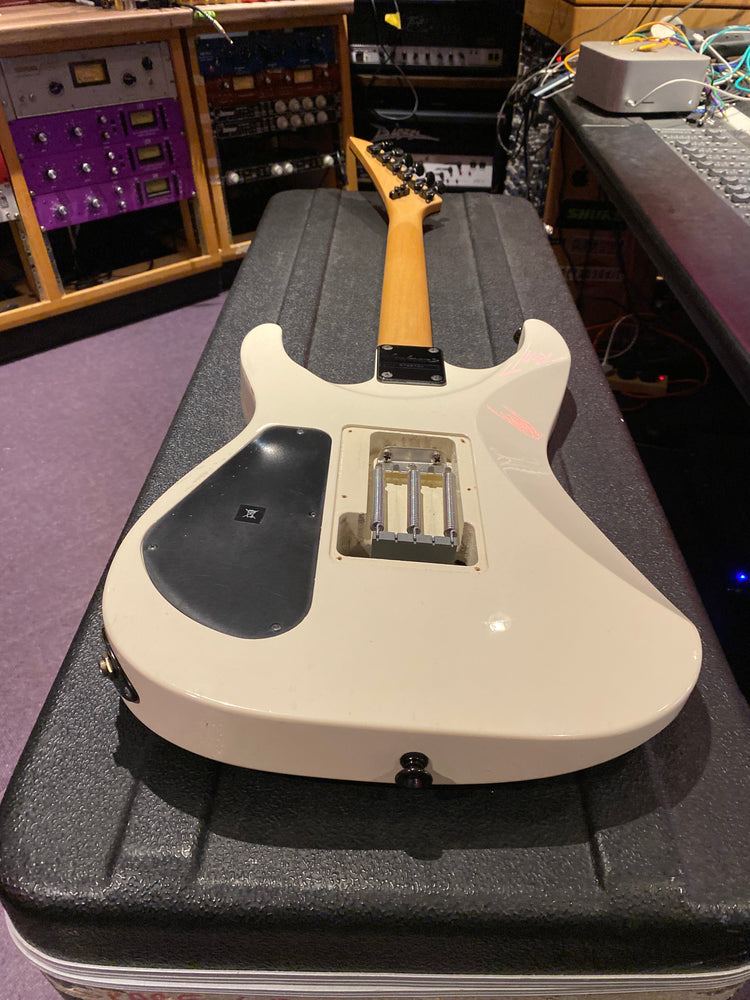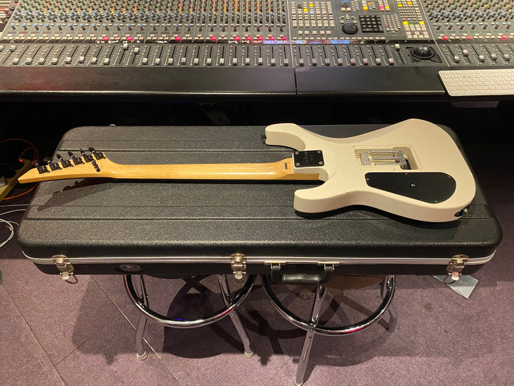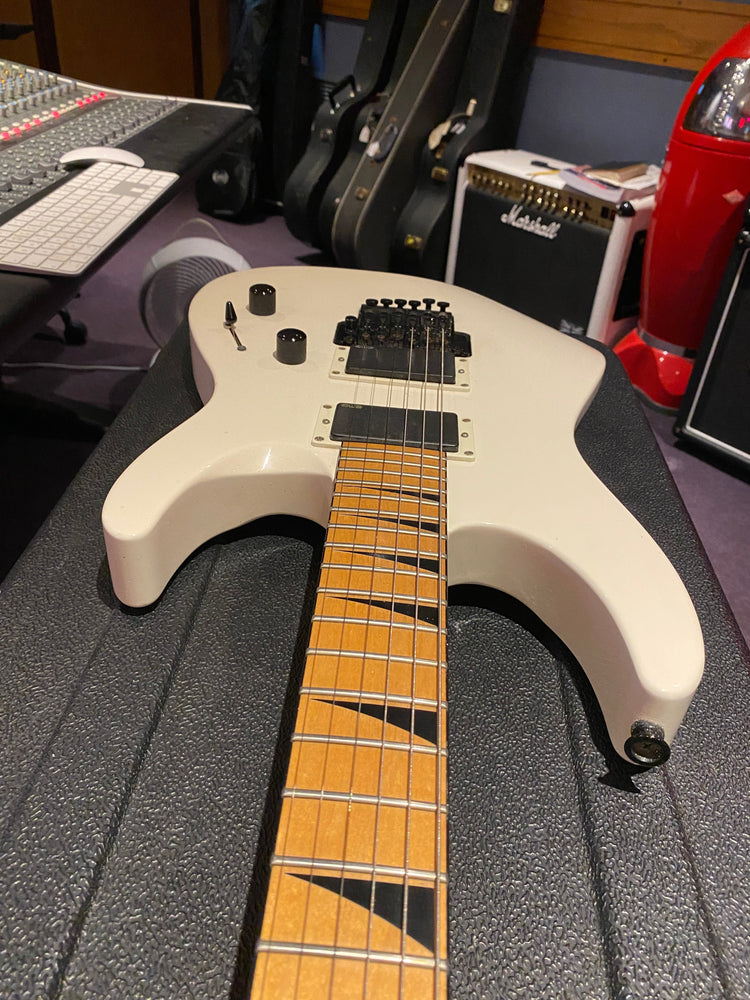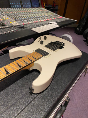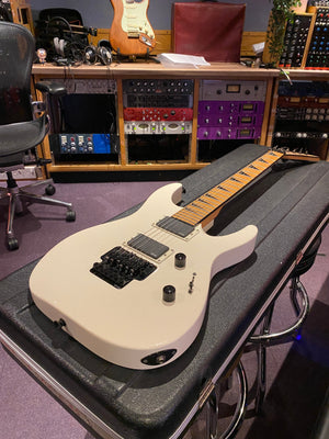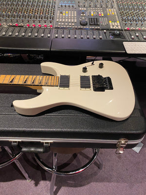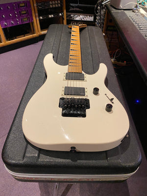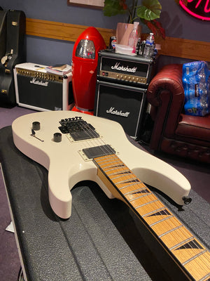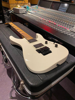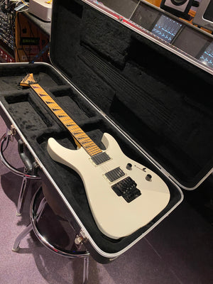 Jackson DK2M Super Strat with EMG active HH humbuckers and Jackson Floyd Rose tremolo. This is the rare Japanese model that came with a maple fretboard, black Jackson logo and black shark fin inlays. This is a model that was way ahead of its time and looks incredible with the white body and black accents. It has the same premium scarf joint neck construction as found on the Jackson USA Custom Shop models. This is probably the best value guitar in the world that you can get at this price point.