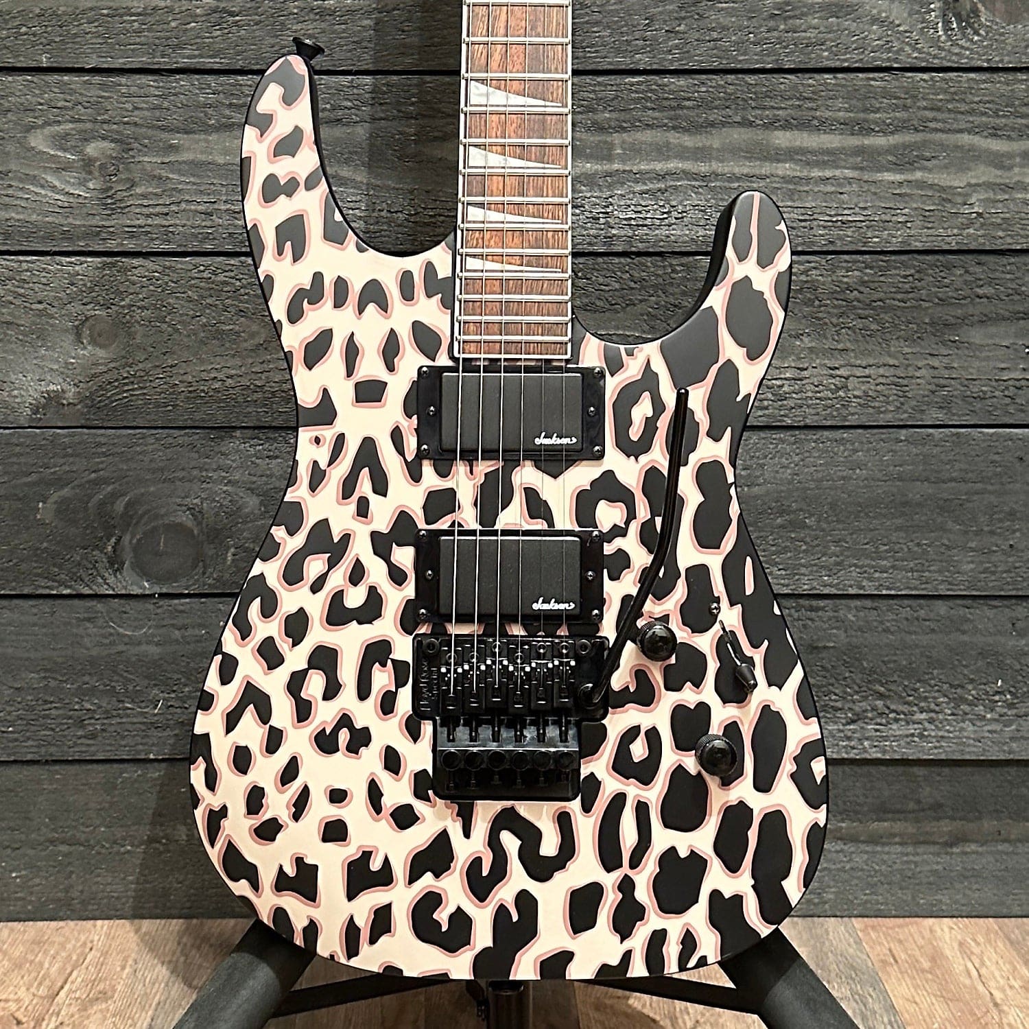 Active Jackson covered high-output humbucking pickups power the Soloist SLX DX Leopard with an expansive voice, loaded with crunchy, full-bodied tone that’s ideal for brazen lead work or assertive rhythms runs. Tone is fully customizable with three-way pickup blade switching and single volume and tone controls, while a Floyd Rose Special double-locking tremolo bridge system provides superior string stability and dynamic tremolo action. Additional appointment includes pearloid sharkfin inlays, Jackson sealed die-cast tuners and sleek black hardware.