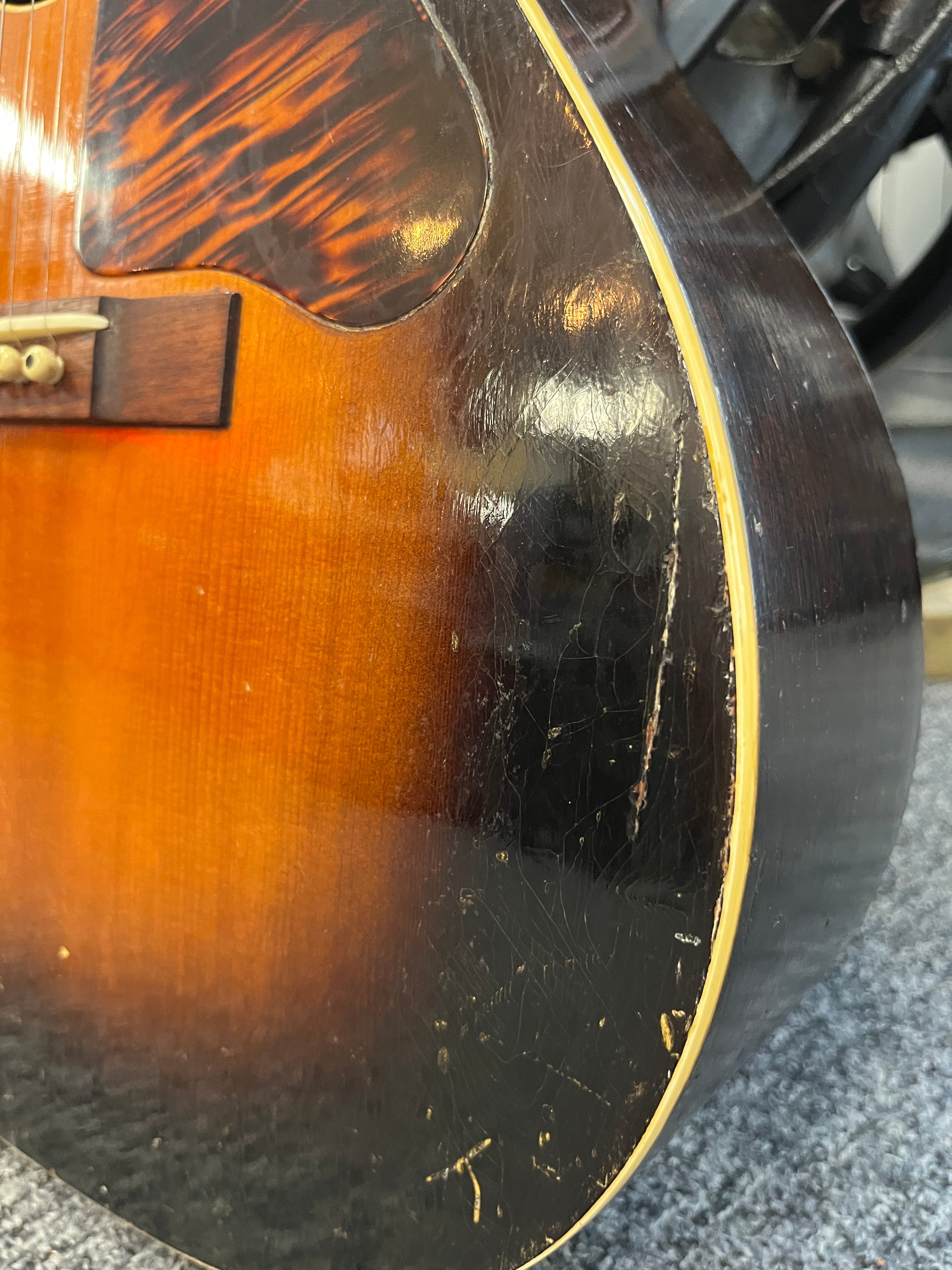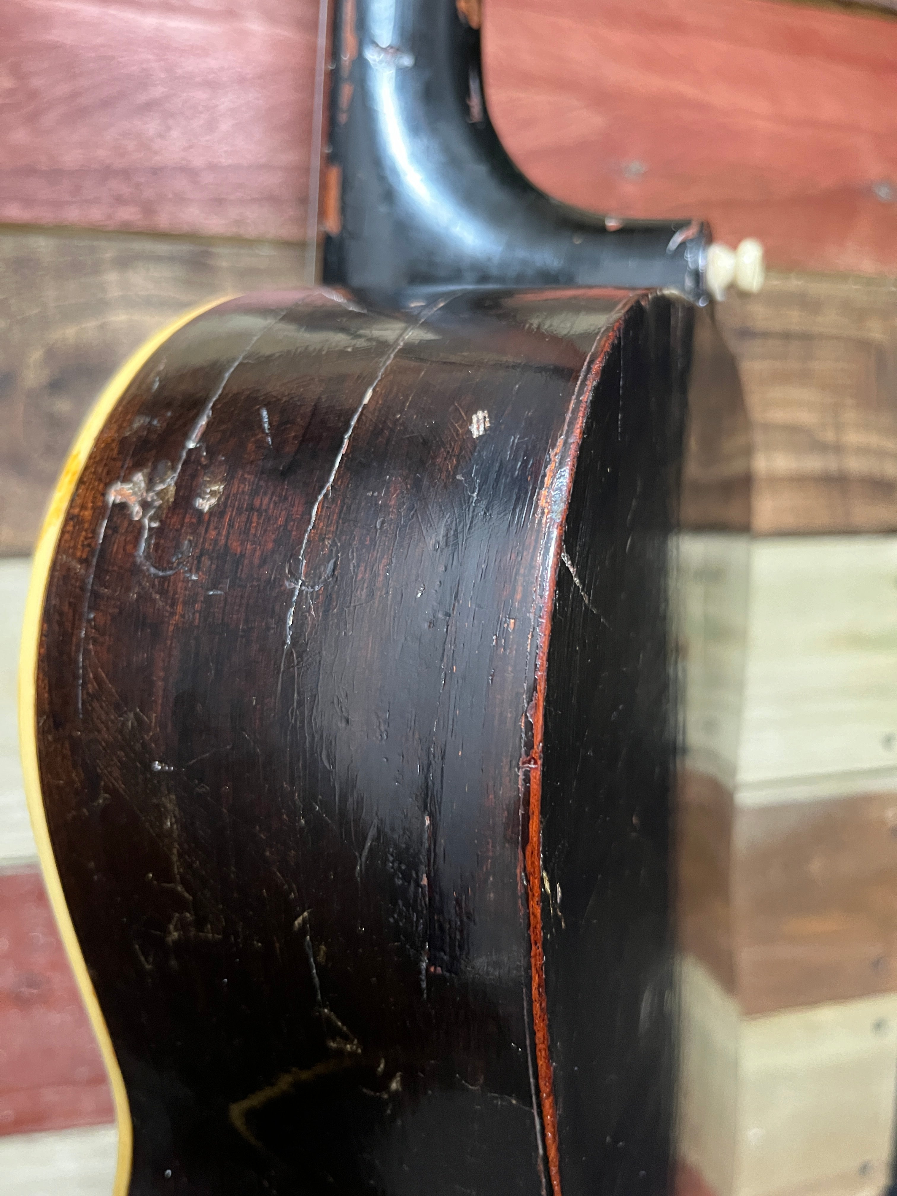 This is a “player grade” example with a few repaired cracks on the side and top, common on one of these.  This guitar is ready for more decades of use. Numerous chips and dings, all in keeping with its age and use.  The saddle and bridge pins are also non-original.