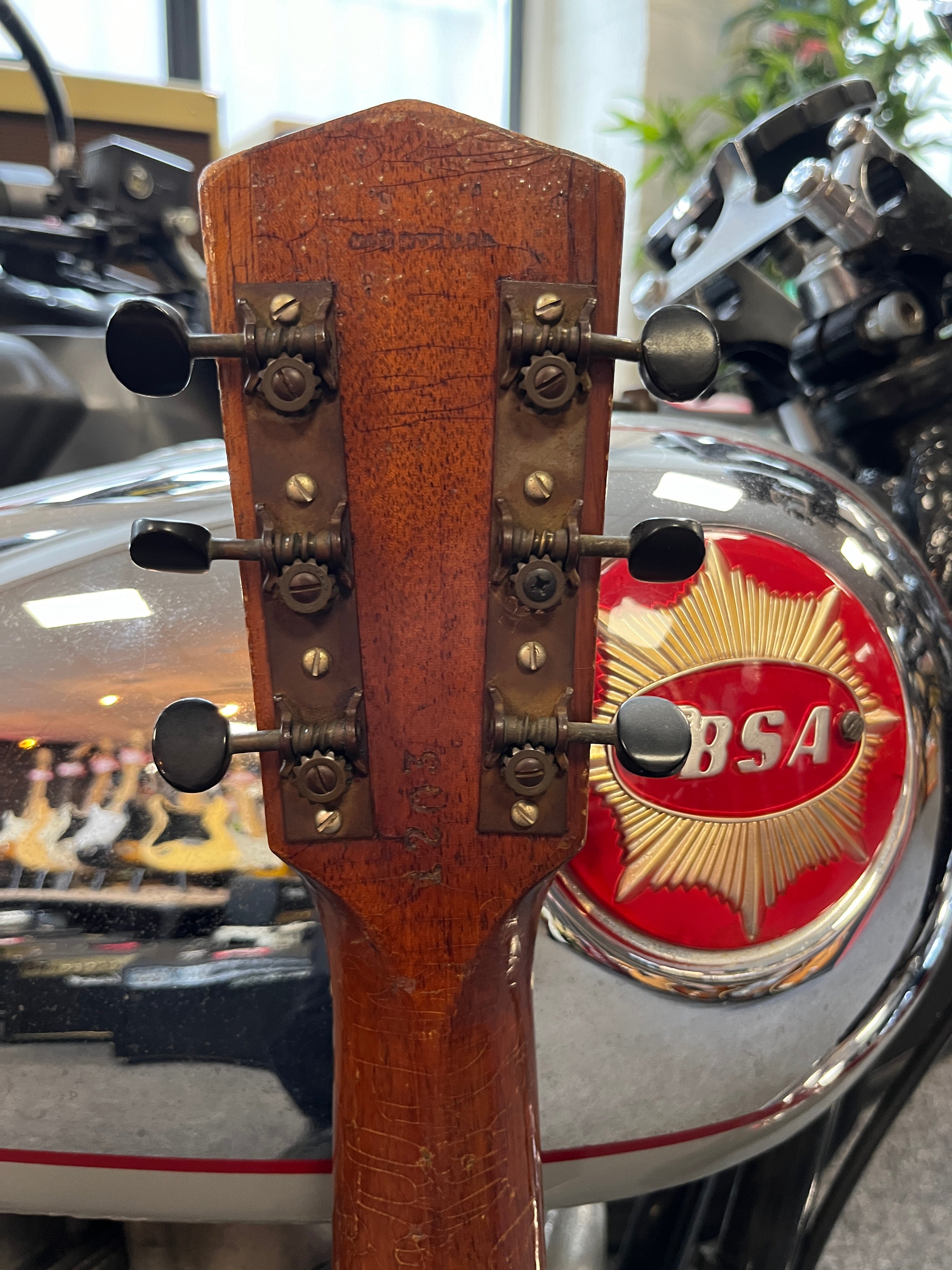 This is a particularly nice playing example with a good neck angle and nice action and playability with its period V profile Mahogany neck. No buzz or issues. There is also plenty of saddle left for further adjustment if desired.