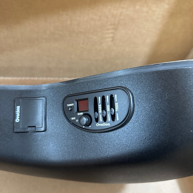 The electro-acoustic signal processing starts with an Ovation Slimline pickup at the bridge of the guitar, which - as the name already says - stands out due to its slim design. The pressure point on the piezo crystals is increased by the serrated bridge inlay, which favours a particularly even sound. Before the signal leaves the guitar, it is refined by an Ovation OP4BT preamp with a 3-band EQ and a built-in tuner.