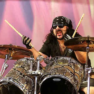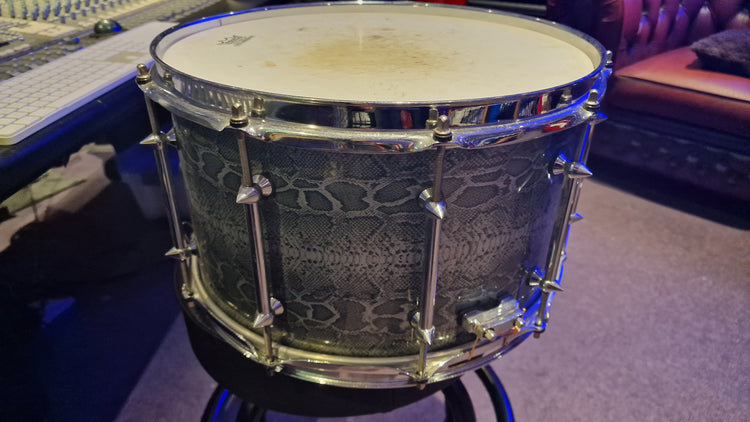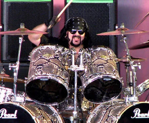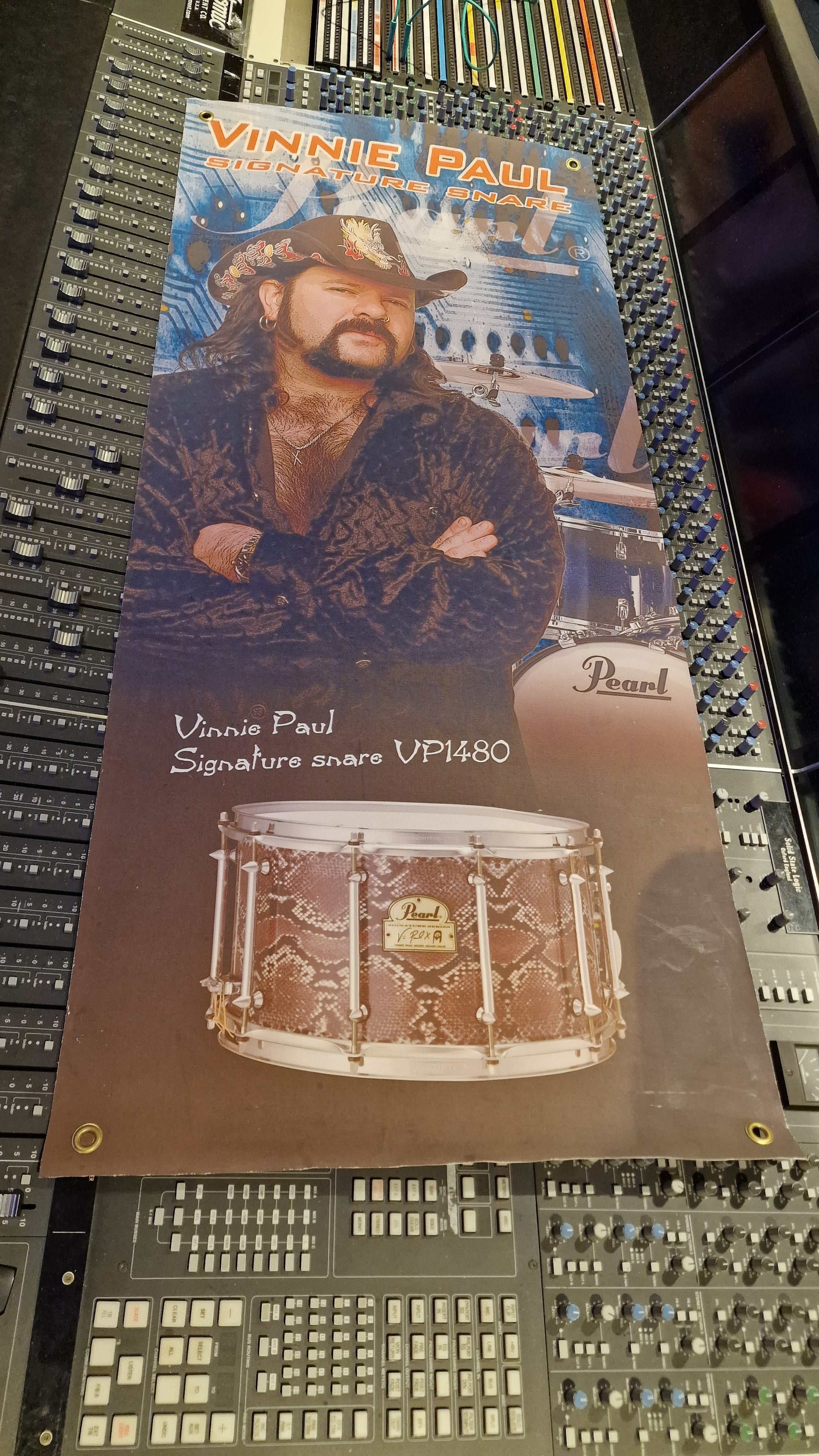 This is one of the two prototype snares presented to Vinnie by Pearl, with him ultimately choosing the different color & pattern python snakeskin on the other prototype we also have available. What you see here is the only one in the world with lots of strikes on the drum head from Vinnie Paul himself! Vinnie Paul's personal Pearl promotional poster hung in his home and seen here is also available in a separate listing.