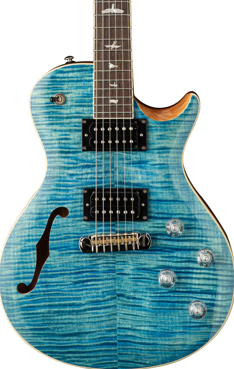 The SE Zach Myers is packed with features that will satisfy even the most demanding musicians. Featuring a chambered mahogany body with maple cap, flame maple veneer, and single f-hole, the SE Zach Myers provides smooth mid-range tones with a natural, resonant internal reverb. The resonance of the semi-hollow body paired with the smooth feel of the satin finish neck will make an immediate impression in your hands. Additional appointments to the SE Zach Myers signature model include a 22-fret, 24.594” scale length neck, PRS adjustable stoptail bridge, vintage-style tuners, and PRS-designed 245 “S” pickups paired with two volume and two tone controls and a 3-way toggle pickup switch. These pickups bring high-end clarity, low-end power, and an overall aggressive punch that maintains a certain sweetness.
