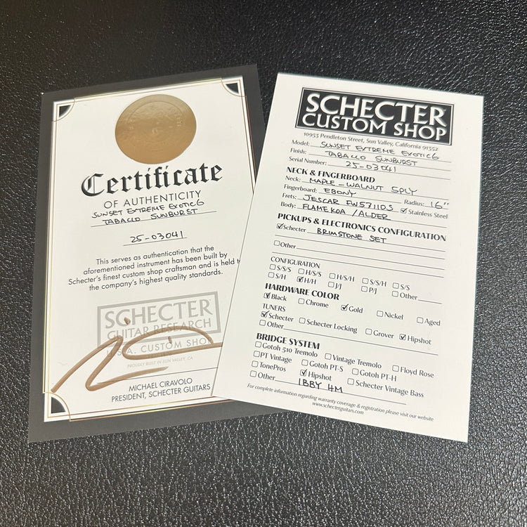 Schecter USA Custom Shop Sunset Extreme Exotic 6 Flamed Koa Electric Guitar - Tabacco Sunburst