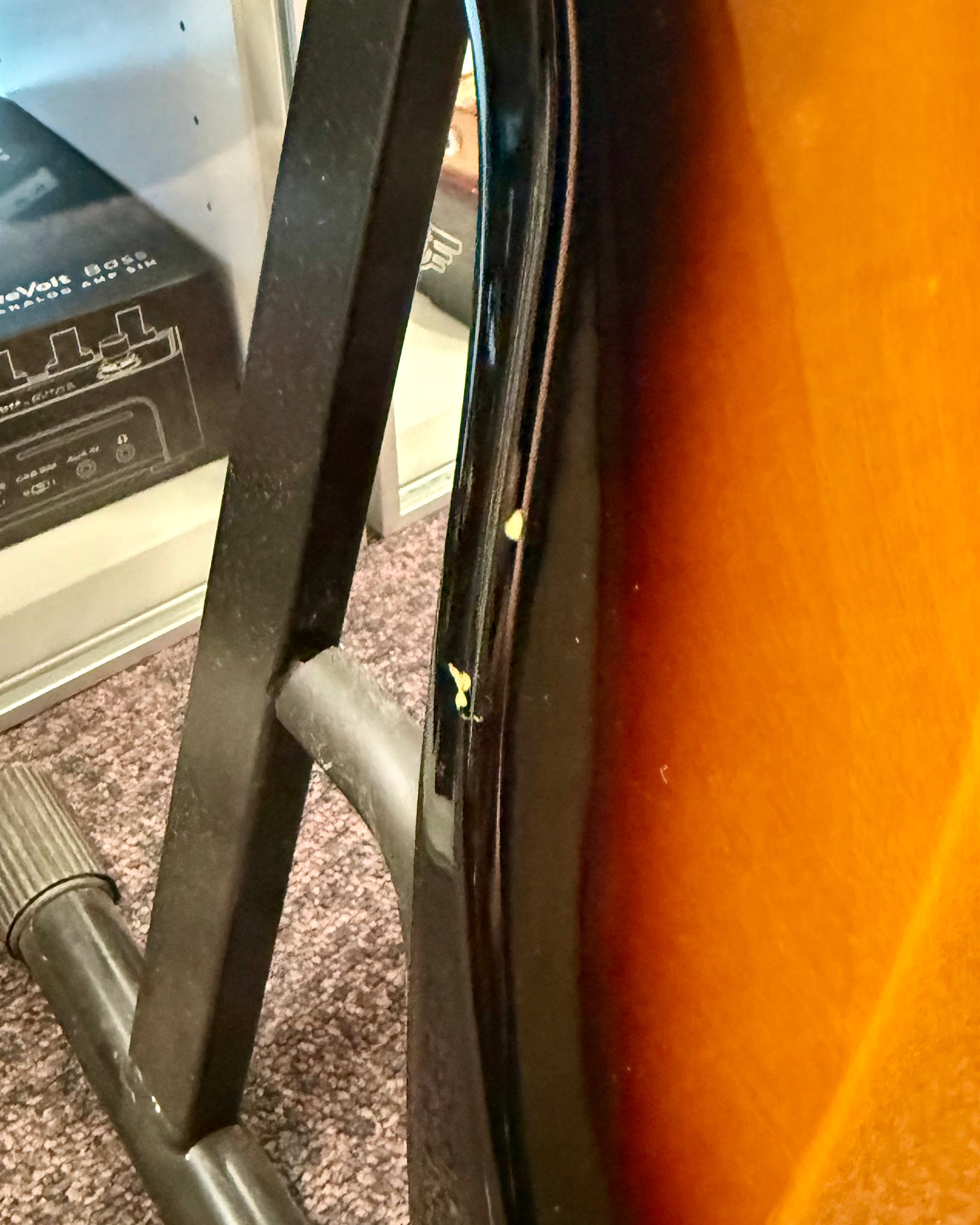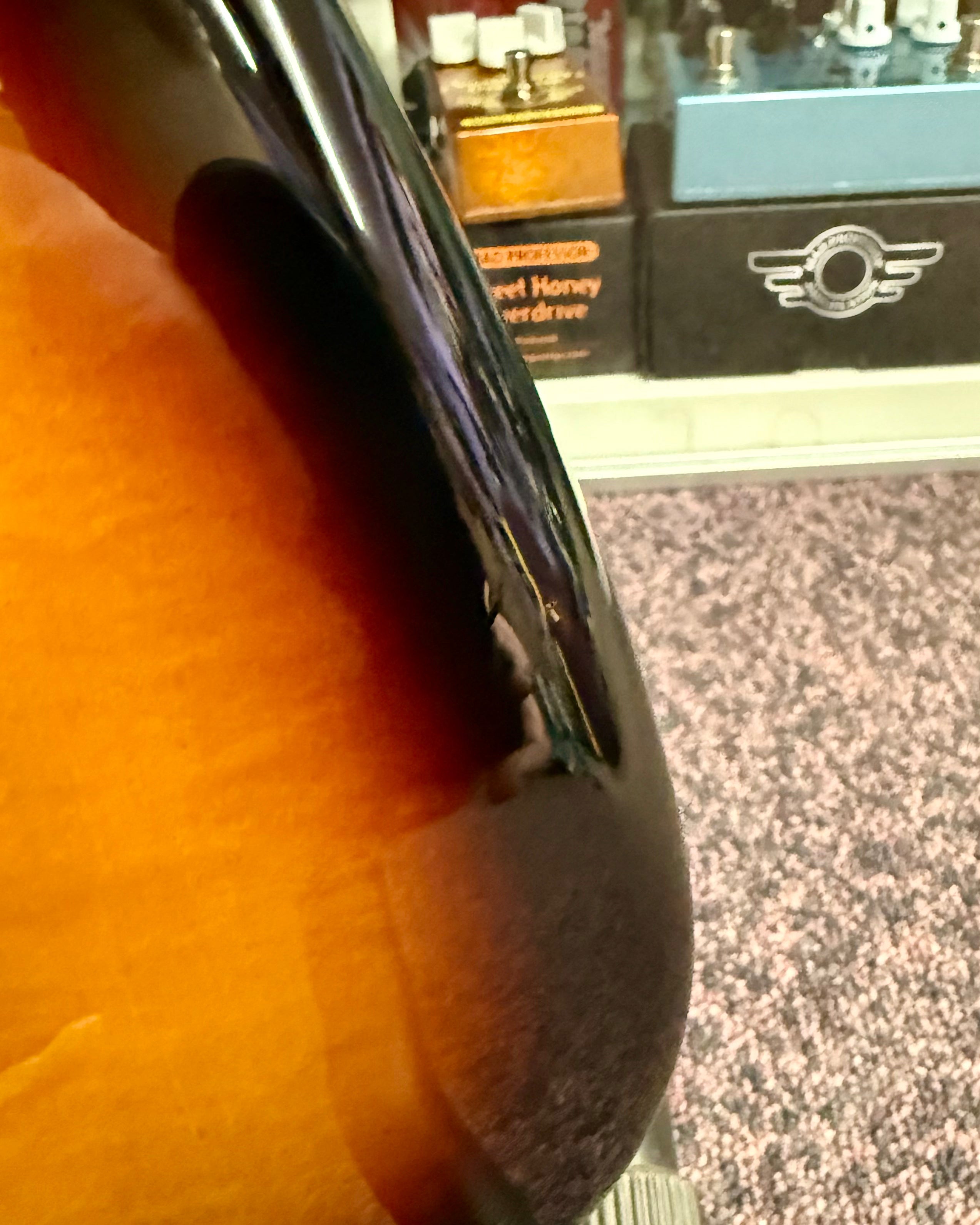 This guitar has several signs of use and a few dings but plays great. It does not come with a case.