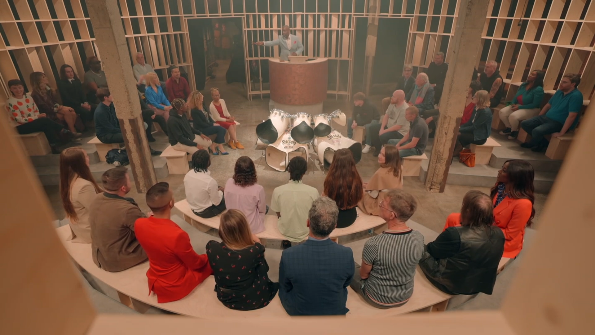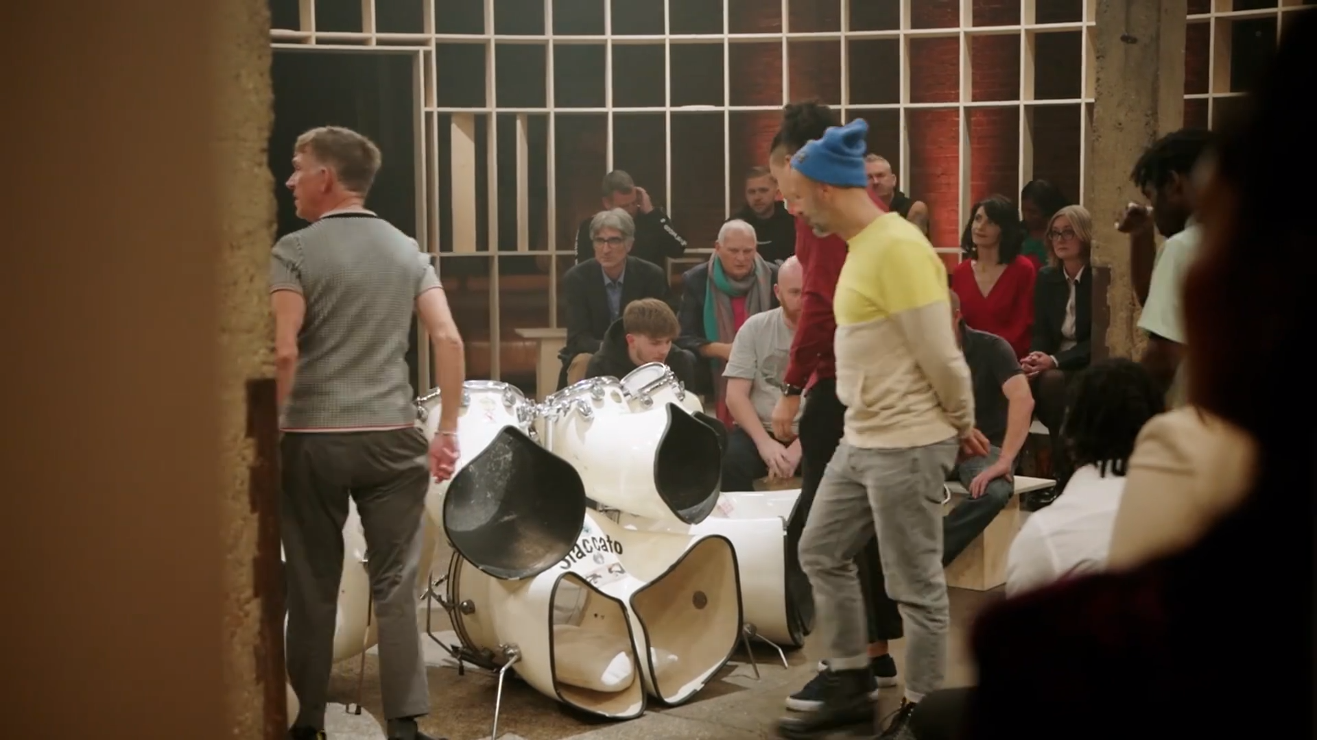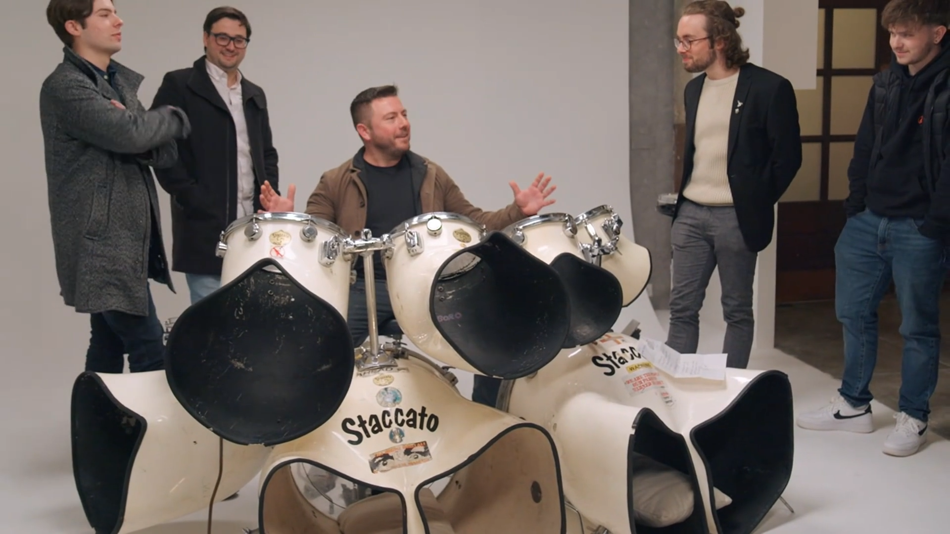 Staccato Thunderhorn Drum Kit formerly played by Iron Maiden's Nicko McBrain. This is the world's coolest drum kit with the most incredible history behind it! Millions of people watched celebrities Hugh Bonneville (Downton Abbey, Notting Hill) with A.J. Odudu (Big Brother, Strictly Come Dancing) and Olympian Derek Redmond present this exact drum kit to the entire nation on episode 6 of The Greatest Auction on TV's Channel 4, where our studio's owner, Keith Gannon, made the winning bid. This is the ultimate statement piece for any collector of drums and all things rock and roll!
