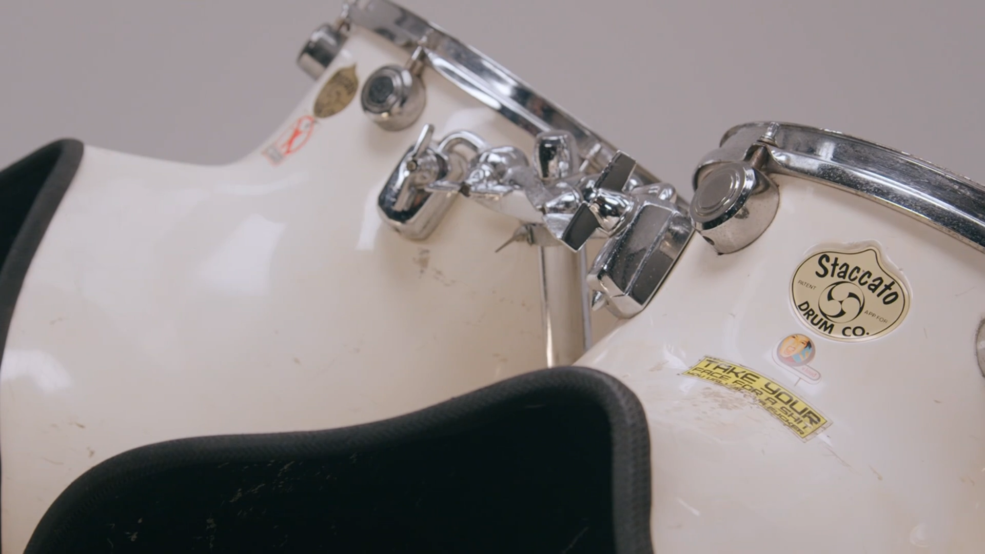This is a vintage 7-piece Staccato Thunderhorn kit that includes prototype drums that were not available to the public and kept in the collection of Staccato's founder, Pat Townshend. Rolling Stones frontman Mick Jagger and his younger brother Chris were each 25% investors in Staccato Instruments and would have absolutely been familiar with the drums in this kit, which were loaned to the biggest drummers in the world and maintained by Pat Townshend when they weren't in use. You wouldn't be wrong to say that Mick Jagger was 25% owner of these drums! A letter of provenance from Pat signed before his death in 2011 accompanies the drums.
