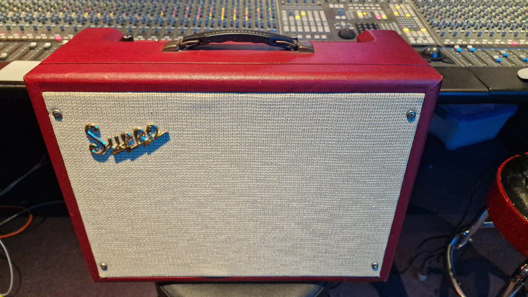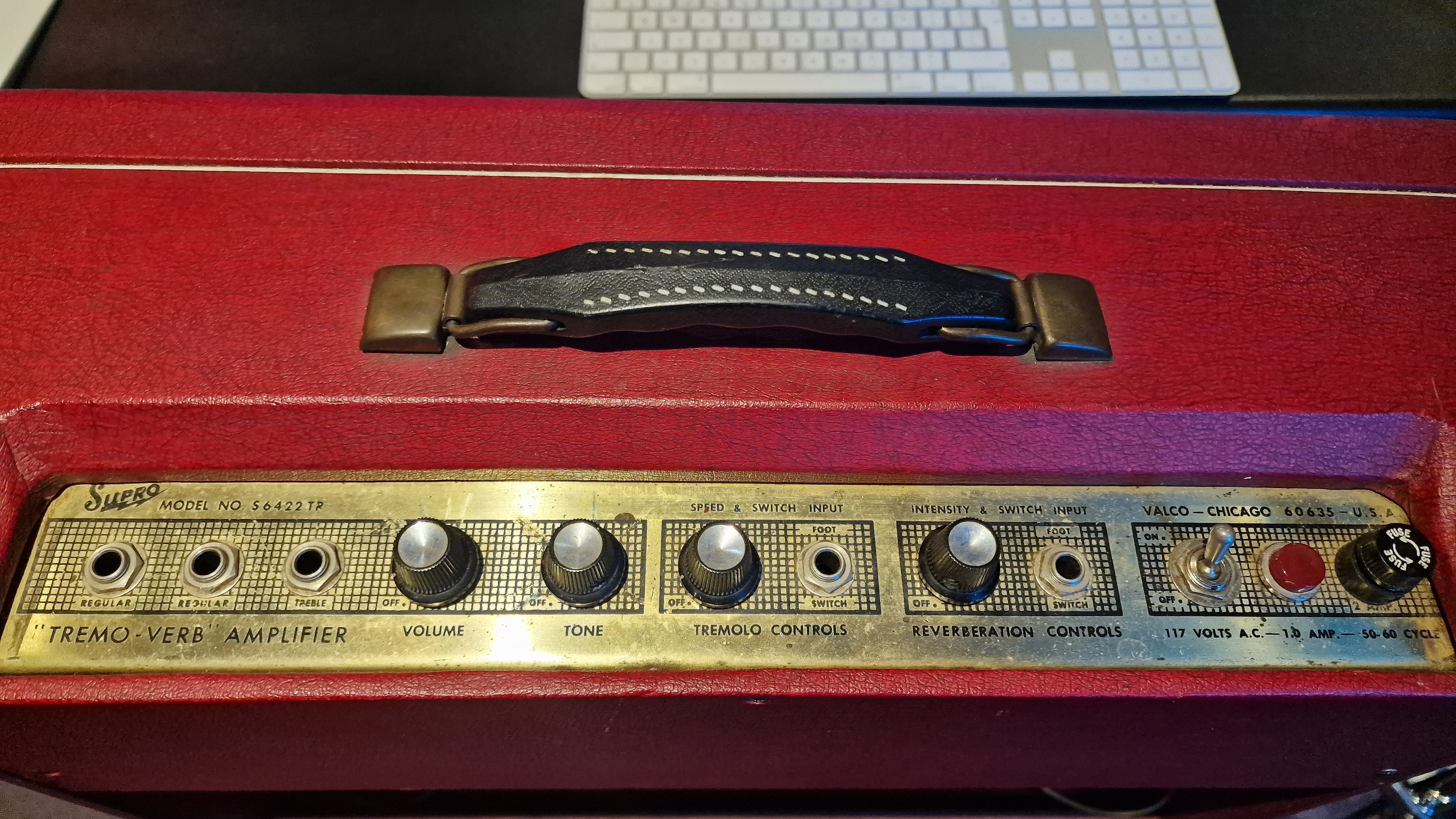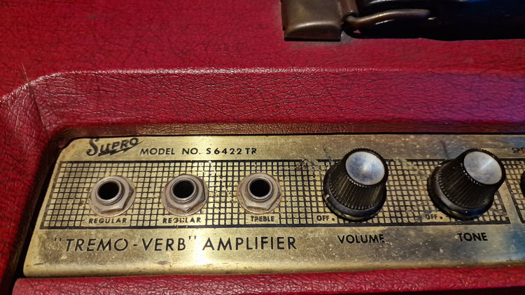 RARE 1964 Supro S6422TR Tremo-Verb finished in stunning Persian red with matching cover and foot switch. This is the cleanest example we have found anywhere on earth and has been part of our studio's guitar amp arsenal for the past half decade. We are putting a good chunk of our amp and speaker collection up for sale to make room for much needed space in our studio complex! If you want the very best and to have an extremely vibey amp that no one else has, this is for you! It is hard to believe this amp is about to have its 60th birthday!