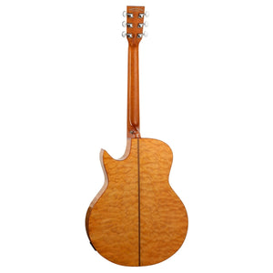 At the heart of its sound lies a Quilt Maple solid top, delivering articulate highs, a well-defined midrange, and deep, resonant lows. The back and sides, also constructed from Quilt Maple, not only enhance the tonal richness but also contribute to the guitar’s striking visual appeal. The natural wood grain patterns are beautifully showcased beneath the luxurious Honey Gloss finish, ensuring that this instrument stands out in any performance setting.