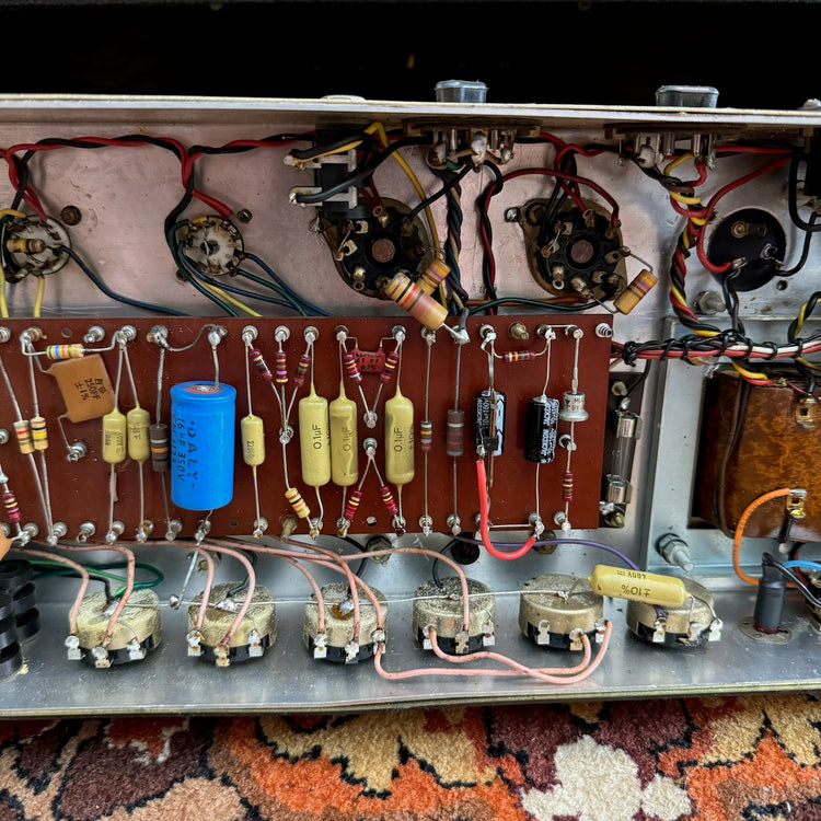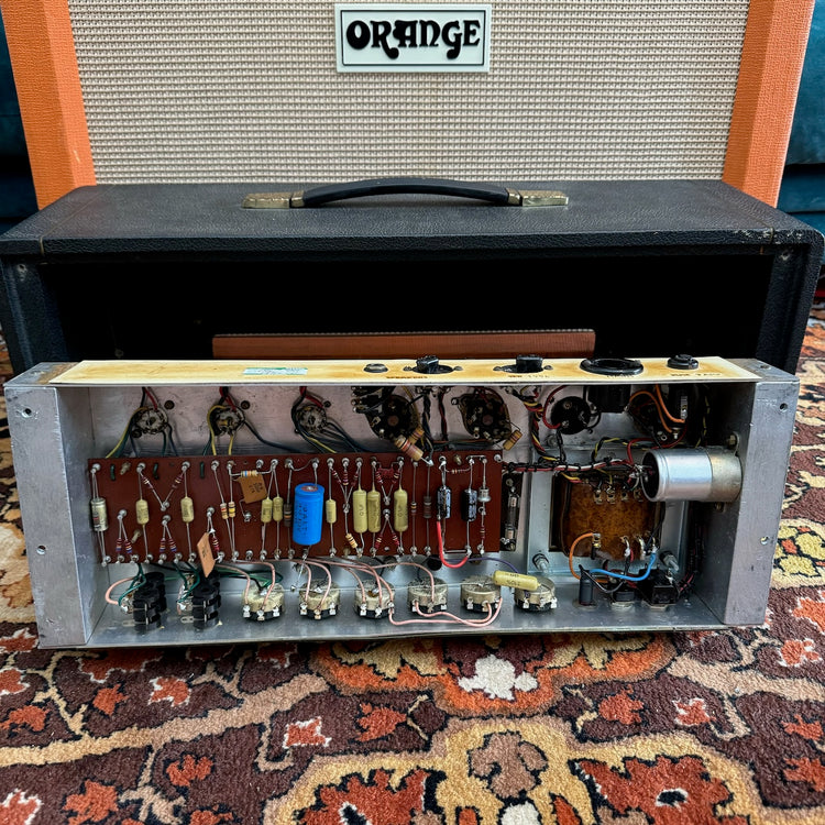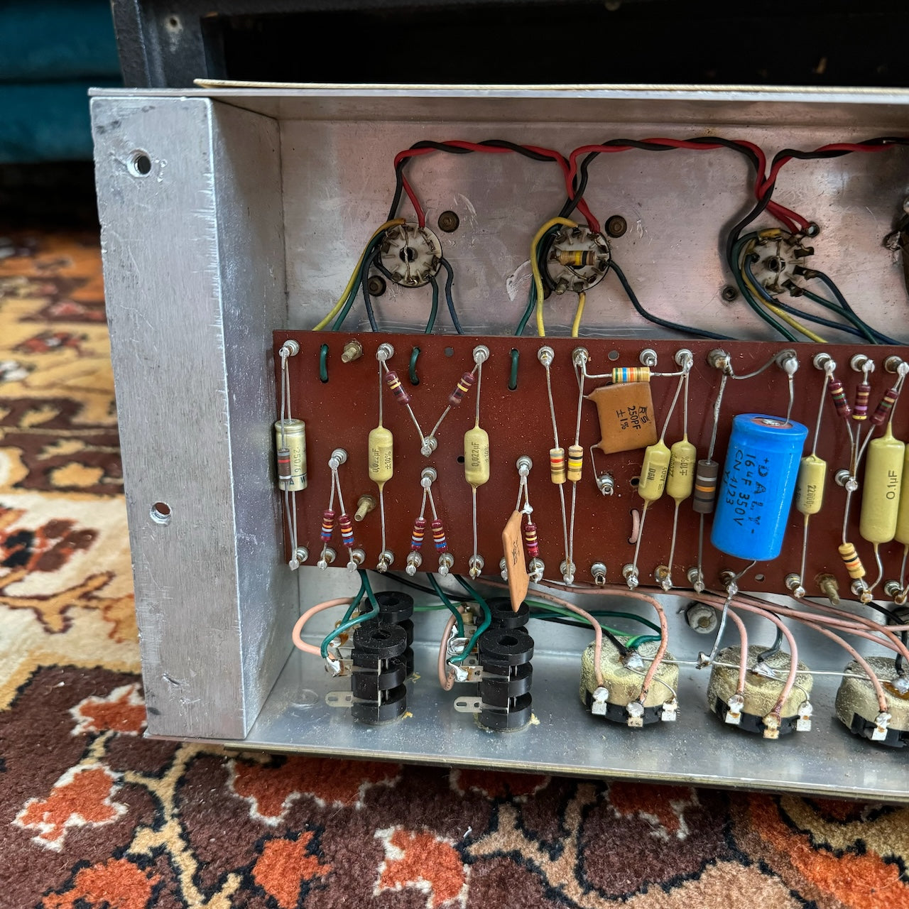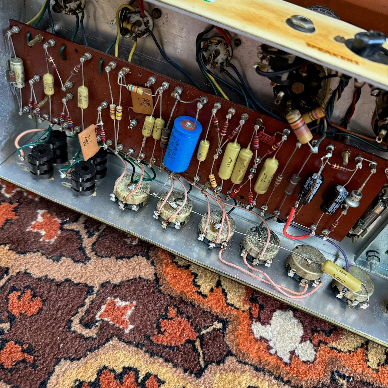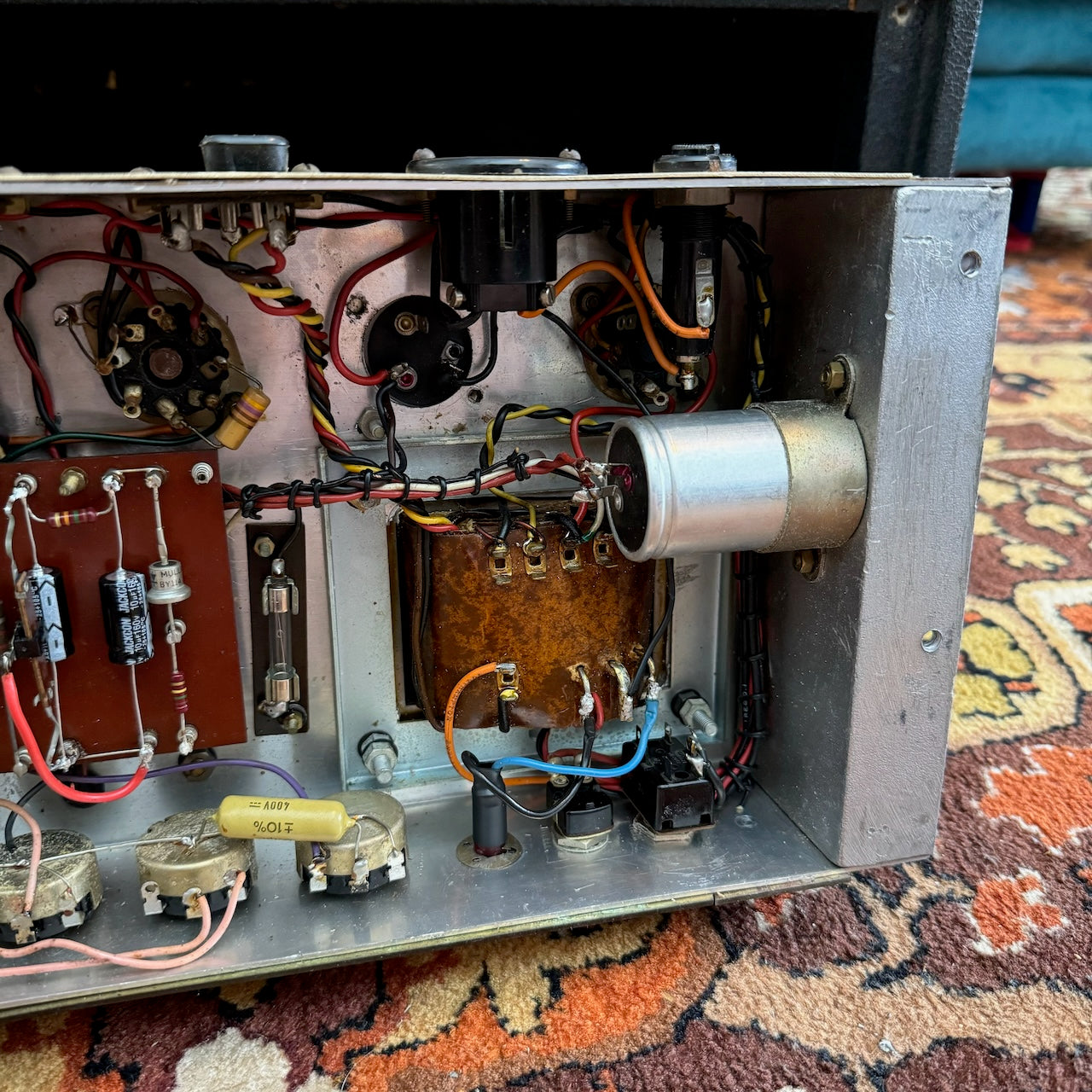 This is a wonderful JTM45 that I was recently contacted about. The owner of many years had decided to finally sell one of his prized possessions. This is one of those that has not been circulated, and comes direct from the original owner. When I got it, I sent it straight up to my tech, who confirmed it was in incredibly well working order. This one has both original transformers - 1202-55 / 784-103 - and the original choke. The pair of original GEC KT66 are there and work perfect, alongside 3x period ECC83 and a slightly later Trigon GZ34.