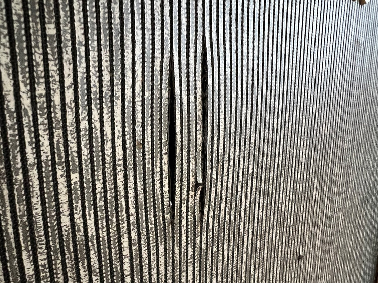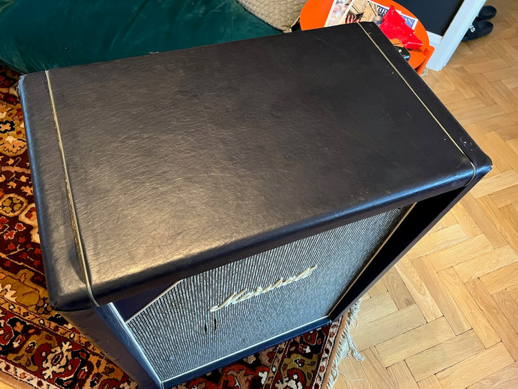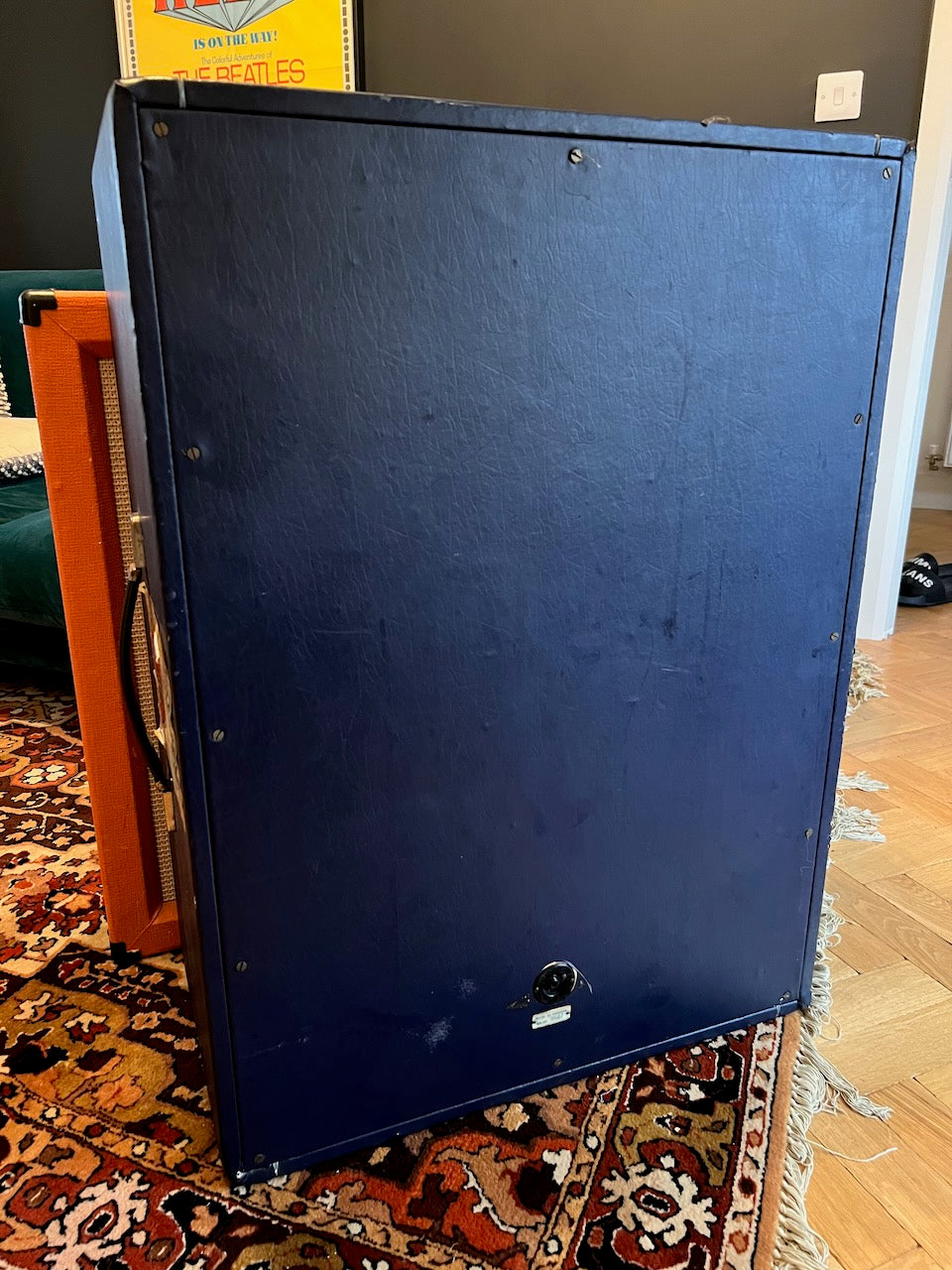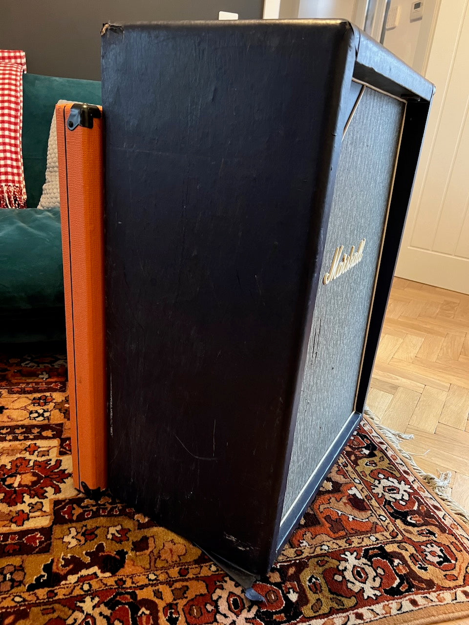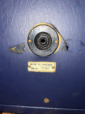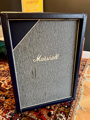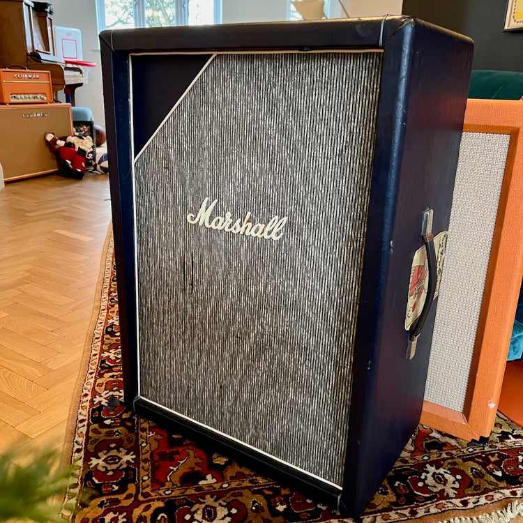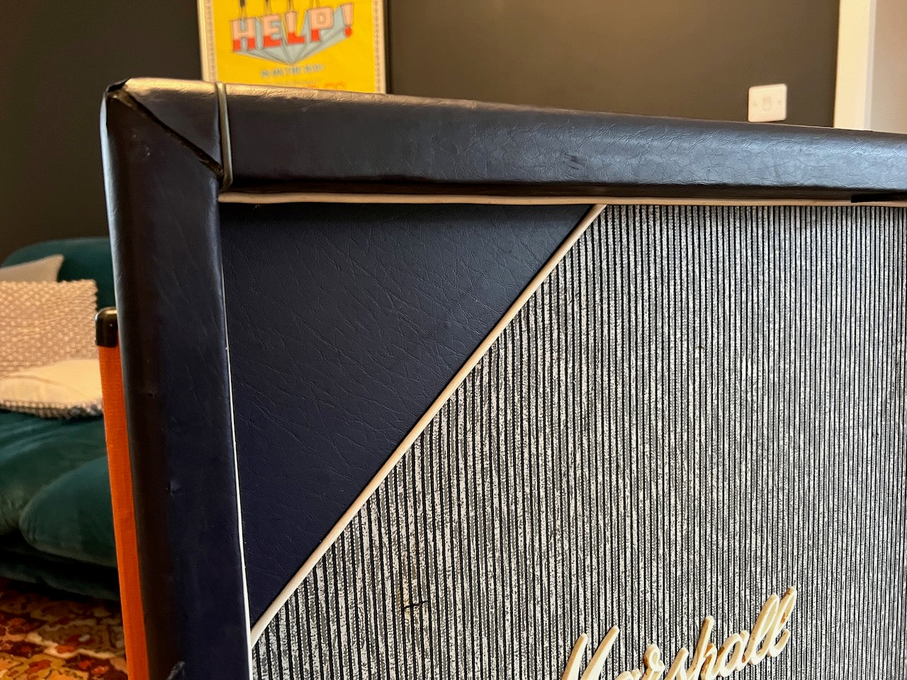 What a beauty this is! I was sent pictures of this cabinet and a matching Marshall head located in one of the Northern parts of Scotland. I took a punt on it - sold as seen - and it paid off. When I got it here, it's clear to see this has been well played. It has also been well looked after over the many years of gigging. It's been recovered in a smooth purple tolex sometime back in the 1970s, and whoever did that also moved the Marshall logo from the slant on the top left corner to the centre.