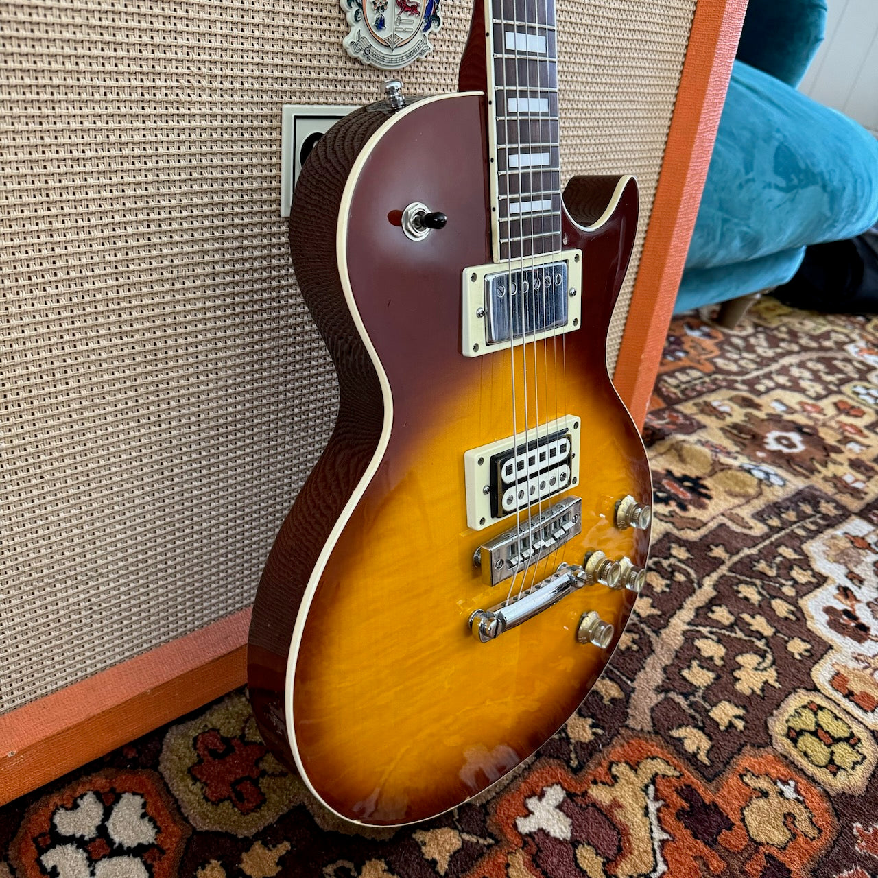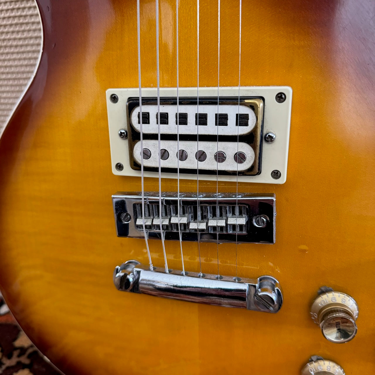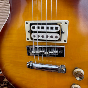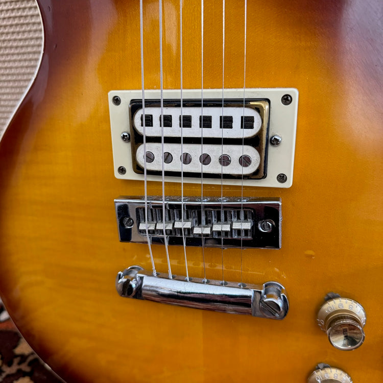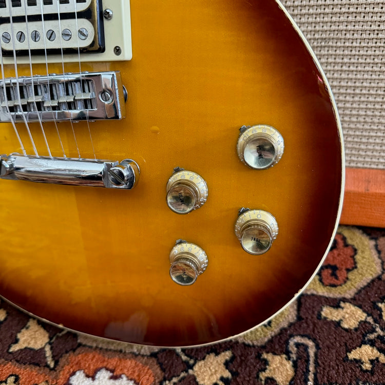 This beauty has been in the same household since 1978, purchased as an 'O Level' present from Wing Music in Bromley. It's a pre-lawsuit era 'Open Book Headstock' Les Paul, made in Japan in the 1970s. It's by far one of the nicest I've seen in that Tobacco Sunburst finish. The owner had a different bridge put on it in the 1980s as the original had the plastic corroding. Both pickups are original to the guitar from new, but the bridge pickup is the 'Gabbon' style humbucker whereas the neck pickup is the more often seen Gibson style. They really sing together! It's in brilliant cosmetic condition with only a few light marks as you can see. It has been incredibly well looked after by the previous owner. You'll not be disappointed! Please see the pictures below as these form part of my description.