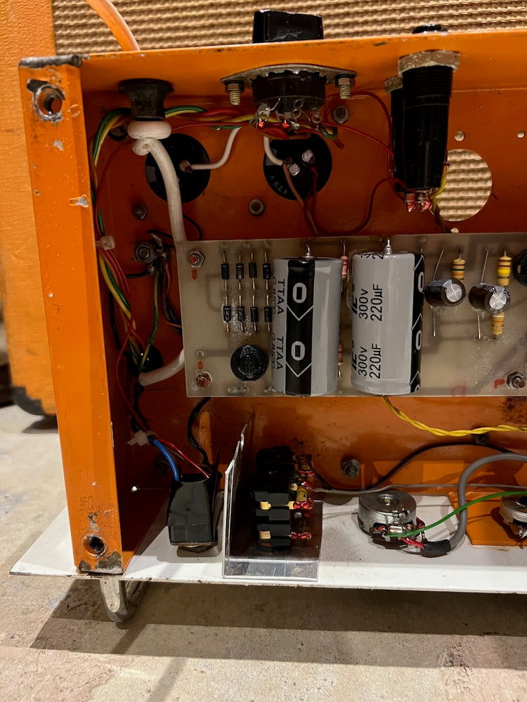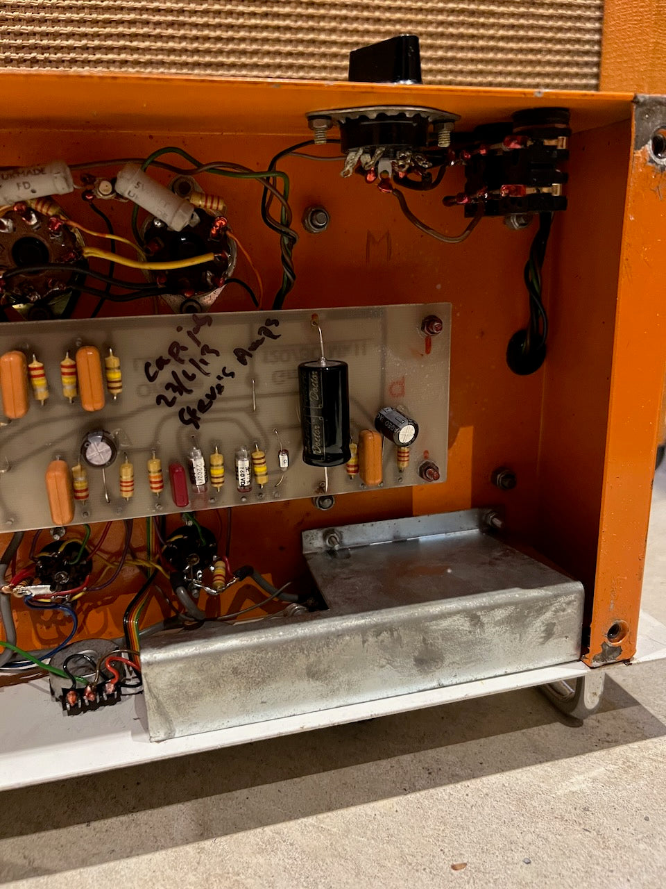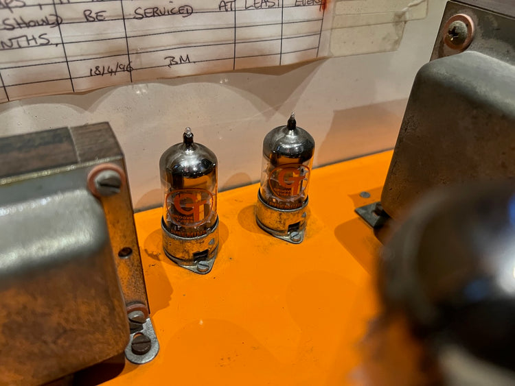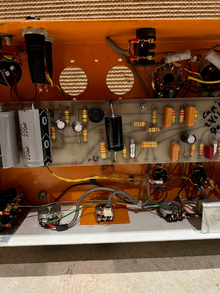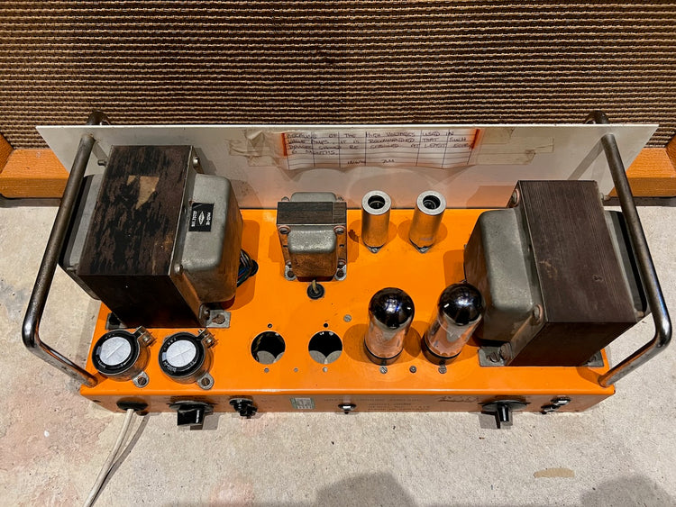 My tech had to recap the amplifier but has done a neat job as you can see. The 2x EL34 valves are newer Harma replacements, and the 2x ECC83s are Groove Tube replacements also. There has been some work on the circuitboard over the many decades to keep the amplifier up to standard. It's a stupidly cool amplifier. Pleas see the pictures below as these form part of my description. Get in touch for any more info - I'm always willing to do a deal including part exchange and trades!