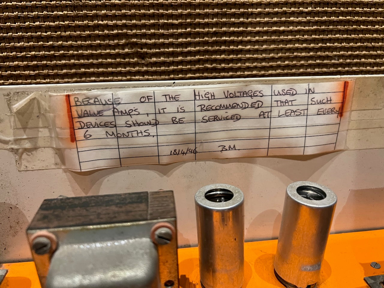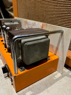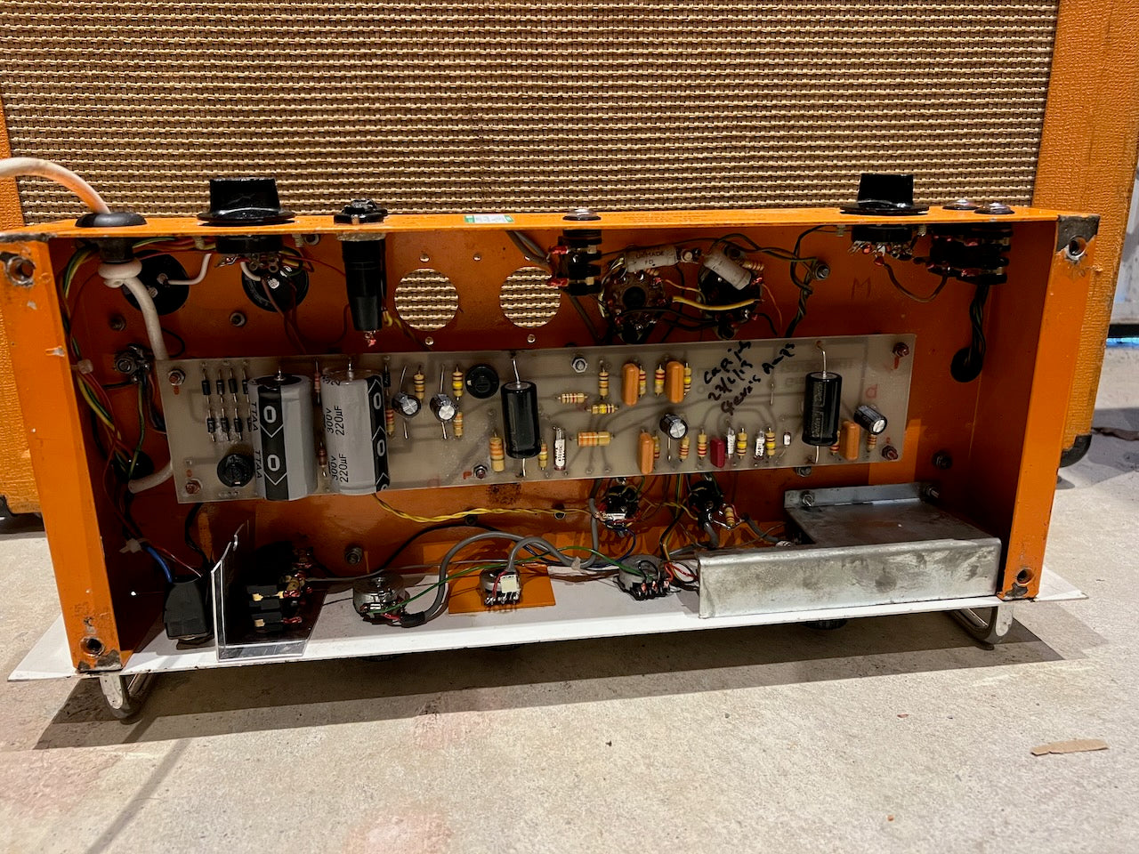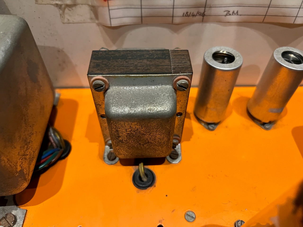 My tech had to recap the amplifier but has done a neat job as you can see. The 2x EL34 valves are newer Harma replacements, and the 2x ECC83s are Groove Tube replacements also. There has been some work on the circuitboard over the many decades to keep the amplifier up to standard. It's a stupidly cool amplifier. Pleas see the pictures below as these form part of my description. Get in touch for any more info - I'm always willing to do a deal including part exchange and trades!
