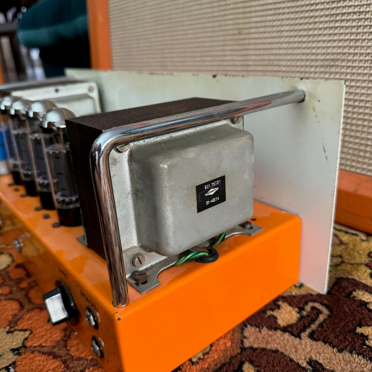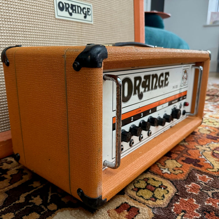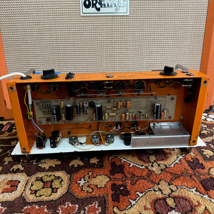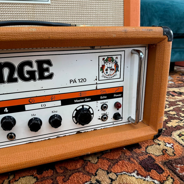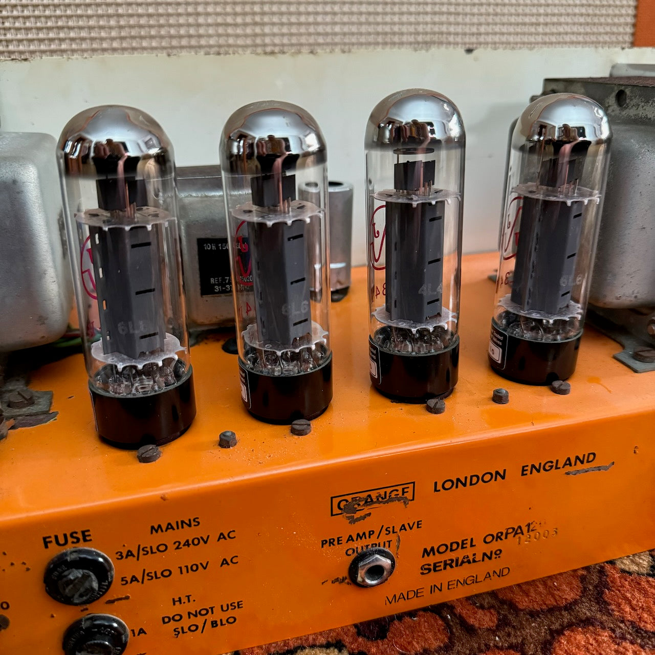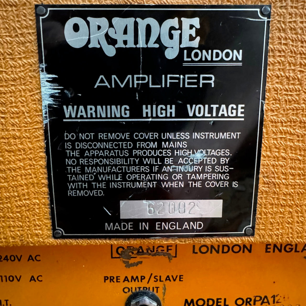 I recently got the opportunity to purchase this beauty from the long term owner. He'd had this for ages, pretty much unused for decades, so it was time for a new home to be found/. It's a late 1974 (possibly early 1975) Orange PA120 head with the Pics & Text. It's in original condition inside, including all 3x transformers. It needed a brand new quad of JJ EL34 power valves installed alongside the 2x original preamp valves.