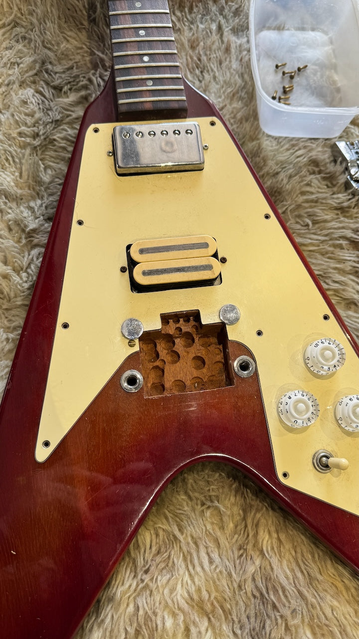 I’m THRILLED to announce the sale of a 60+ year collection coming through The Music Locker. This collection spans all decades from the 60s to the present day. They have been collected by a true lover of vintage. This particular guitar is from 1981 and is one of the rarest and most sought after guitars on the planet - Flying V. There has been a replacement Dimarzio bridge pickup added, white knobs, and Kahler locking tremolo system added. The body has been routed for the Kahler, but has been done professionally and cleanly (see pictures). For some reason it's had the strap button moved in the past too.